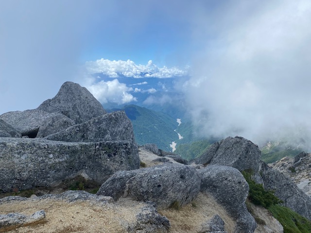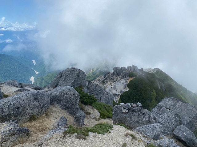 前日台風7号が通過し、栃木にも影響が出そうなら中止しようかと考えていたが、それほど栃木も山梨も被害が大きくないようだったので、小山を2時に出発し4時40分尾白川渓谷駐車場に到着。それほど混んでいないのでアスファルトの駐車場にとめることができた。明るくなりかけていたがヘッドライトをして進んでゆくと、トレランの人々にどんどん追い抜かれる。黒戸尾根は一般登山客よりもトレランの方が多いのではないか。朝だというのに暑い。汗が目に入るくらい出てくるので、ハンカチで拭いながら樹林の中をひたすら進む。刃渡りを越えて、ようやく刀利天狗に到着。ここで一服する。テント泊装備なので前回日帰りの時とは疲れ具合が違う。黒戸山の山頂を巻いて、いったん下り五号目に到着。すでに少しガスが上がってきている。ここからはハシゴの連続で足元が滑るので用心しながら七丈小屋到着。テント代1500円は良心的か。テント場が登りで遠いのが厄介だが、まあまあ平らで良いテント場である。すでに3〜4張りあった。急いでテントを設営し、ガスが上がらないうちに山頂を目指す。八号目からは長い鎖場とステップの大きな岩場で、体力を削がれる。相変わらずこの辺でもトレランの人が多い。山頂に着くとガスが上がってしまって、一部しか展望がなかった。しかし晴れ間もあり、満足であった。何よりこの山行の目的は、山頂までどのくらいで到着するか体力の現在を知ることであったので、そういう意味ではまずまずであった。たくさんの人はほとんどが北沢峠から登ってきていた。あの仙流荘の地獄のような混雑からバスで来たのだと思うとお疲れ様と言いたい。しばらく休んだのち小屋に戻るとテントが増えていた。横のテントの人2組とお話をしながらビールと氷結無糖5%を買って楽しく過ごした。7時頃よりザーッと雨が降ってきて、やや弱くなった頃にトイレをすまして就寝。当初は暑かったが、朝方寒くなり着込んだ。朝には上がっていたが、ビチョビチョのテントを撤収し、下山開始。ガスがすでに上がってきていて見るべきものもなく、9時前には駐車場に着いた。