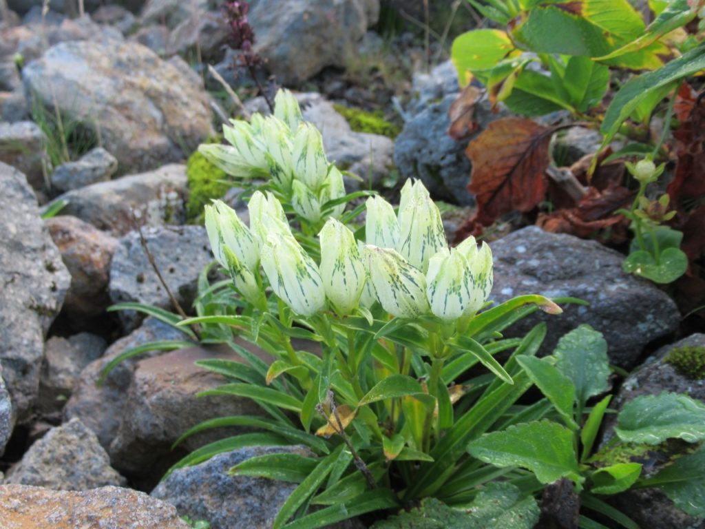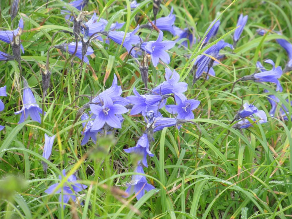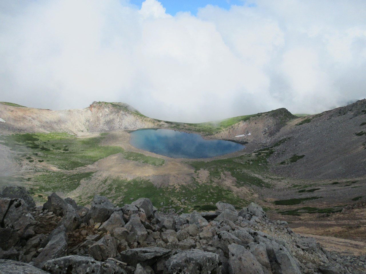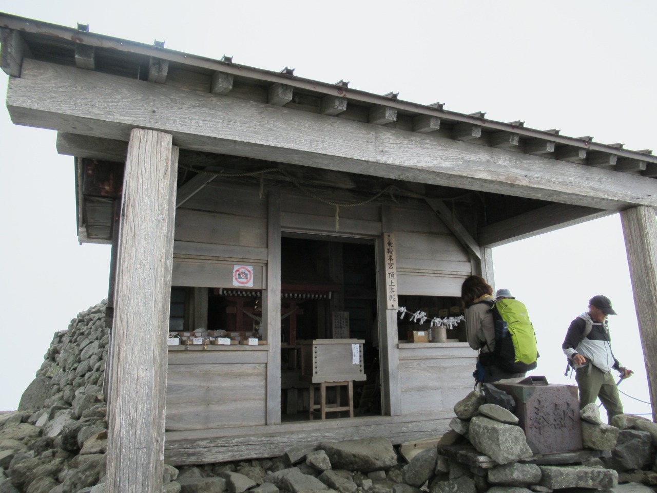 始発6時のバスにも長蛇の列、バス5台で7時に畳平に着きました。気温11℃少々肌寒い位、6時には晴れ渡っていましたが早くもガスが沸き上がって来ます。鶴ケ池、不消ケ池に映る風景、トウヤクリンドウ、コマクサ、ウメバチソウなどの沢山の花を眺めながら肩の小屋で小休止、山頂背後には白い雲が出ているので、早々に剣ケ峰に向かいます。山頂は19℃、霧で晴れたり曇ったり、残念ながら穂高方面は雲で眺望無し、入れ替わり立ち代わり30人程で標柱の記念写真も順番待ちです。
