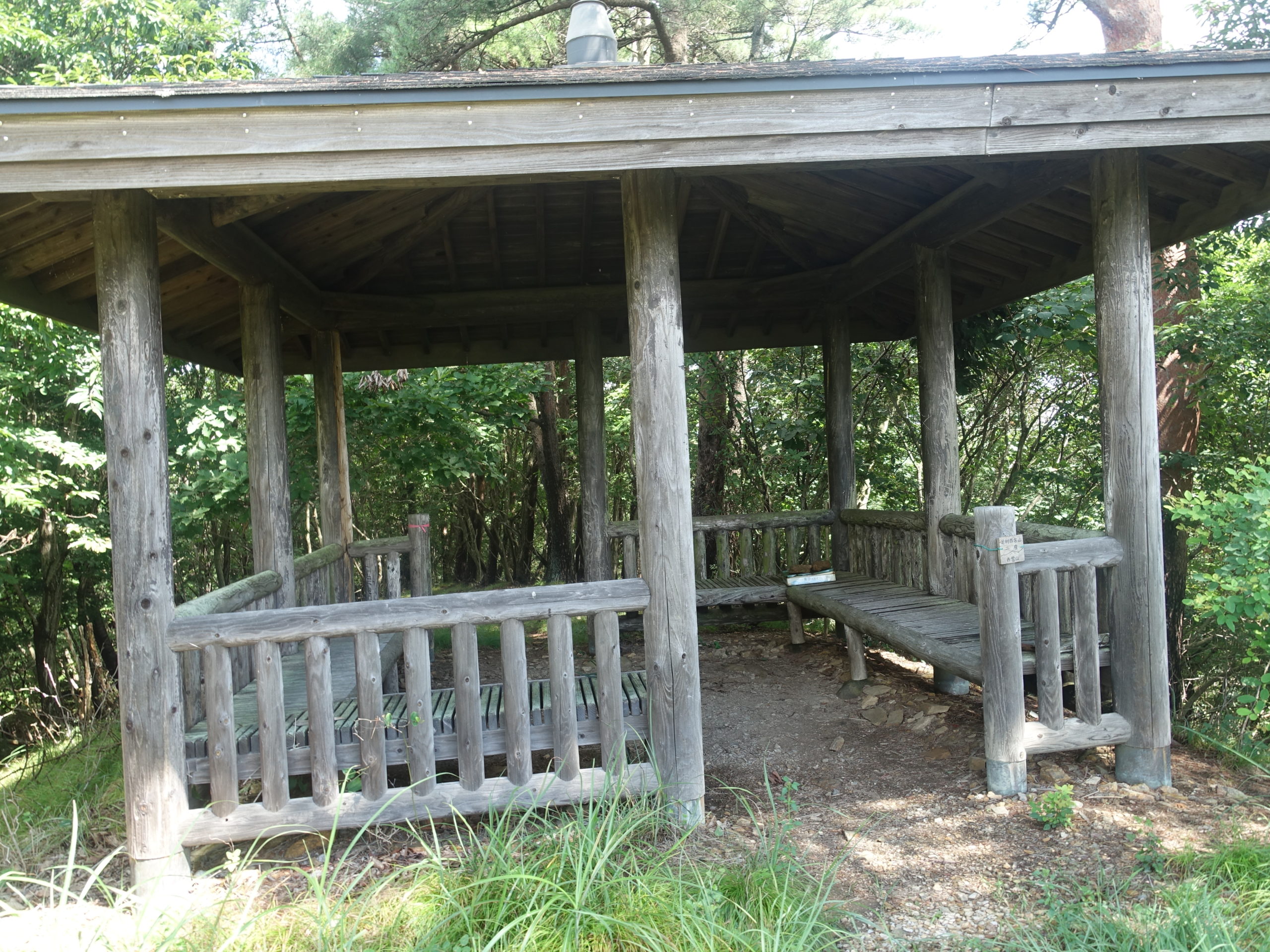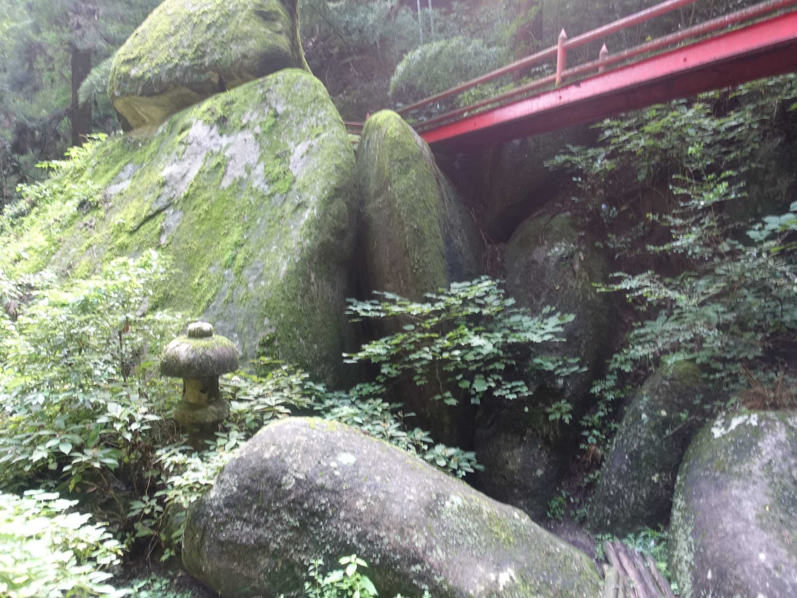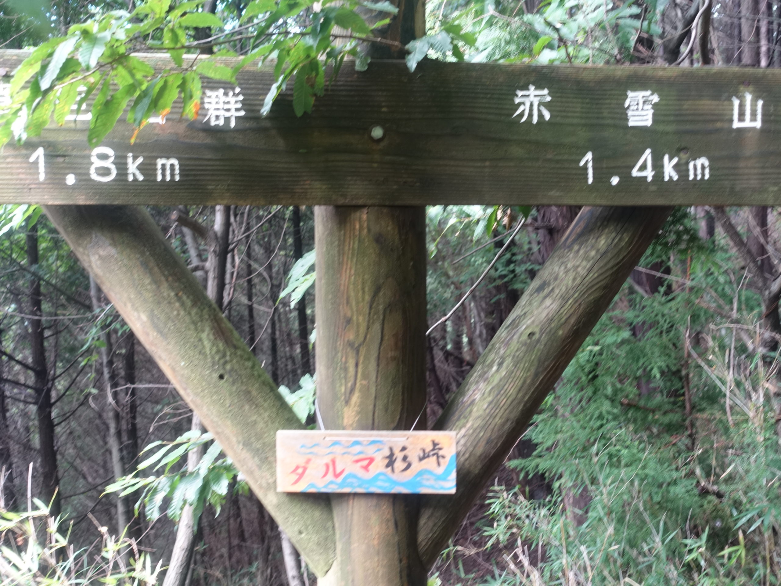 平日のためか先行車は1台のみ、赤雪山を名草巨石群から辿るのは、観光を兼ねた歩きで、1度は経験することも良いでしょう。ただし、登山口まで長い林道歩きを覚悟する必要があります。巨石群を一通り見学し、1時間強の林道歩きの末、やっと峠(ダルマ杉峠)に到着。