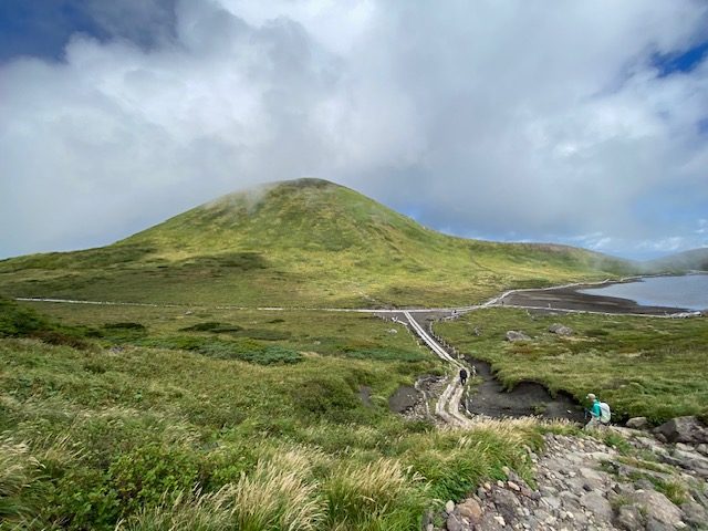 小山を2時00分に出発し東北道をひたすら走り、休憩2回でコンビニ1回間に挟んで国見温泉に到着。広い駐車場は満車のために、少し下ったところに駐車した。トイレは完備されていた。硫黄の匂いを嗅ぎながら、国見温泉の脇を登ってゆく。登山道はとても整備されており登りやすい。思ったほど虫もいず、順調に横長根分岐まで到達。晴れたり曇ったりの天気であったが、風があまりないので暑い。ここから尾根歩きとなるが、太陽が出ているとかなり暑いので、水をかなり飲みつつ進んでいったが、どんどん藪が濃くなってゆき、人もいないので、この登山道はあまり歩かれていないんだろうと思った。藪のためなかなか進まない。女岳が右手に見えてくるようになって、ようやく一人とすれ違った。上はガスだったが、今は晴れてきたね と話しかけてくれた。そこからしばらく急登の岩場を登り、女岳分岐から女岳へ。ここのトラバース道は風がいきなり強烈に吹いてきて、帽子をザックにしまい、ウインドブレーカーを着てゆっくり進んだ。コケ以外にはアナリ植物が生えないごろごろとした火山系の黒い石の上を進んでゆく。コマクサが萎れてきていたがところどころあった。女岳に到着したタイミングでガスが取れて、男岳の全貌が見えたので急いで写真を撮った。明⚪️大学ワンダーフォーゲル部の団体と会って、楽しそうであった。次に男岳に向かった。山頂ではガスで田沢湖などは見えず。そこから阿弥陀池を見下ろすと、綺麗な木道と池、避難小屋が見える。ここには登山客が大勢いた。ここでお昼休憩とした。私はおにぎりとソーセージであったが、連れはNISSINの地球の歩き方、台湾ラーメンなるものを食べており、初めて見たがそれほど辛くもなく美味しかった。木道を歩いてトイレにゆくと立派なトイレで、その横にはやや年季の入った避難小屋があり、避難小屋の脇には大きなテントがあったが、いつの間にか撤収されていた。ここから秋田駒ヶ岳山頂へ向かった。山頂には誰もいなかった。一度阿弥陀池に降りて、横岳の途中まで行ったが、その先は時間もあったので行かずにムーミン谷に降りて行った。ここはかなりの急坂でしかもザレているので、気が抜けないところ。危なくないところまで降り切ると、両脇はお花がたくさんあり(なんとチングルマ咲いており、また大量のトリカブト、リンドウ)、遊歩道の上を歩いてゆくので気持ちが良かった。ムーミン谷と呼ばれる所以であろう。ここを過ぎて横長根までは平坦な道でやぶはなかった。ここからは整備された道を戻るのみであっという間に駐車場に着いた。私たちの車以外はほとんどなくなっており、ムーミン谷のピストンがほとんどだとわかった。田沢湖近くのホテルにその日は泊まった。翌日天気は良く、予定通り黒湯にある駐車場から乳頭山を目指そうとしたが、なんと橋が崩落していて登山道は通行止め、孫六温泉も改修ちゅうで登山道荒廃しており登れそうもなく、蟹湯からのルートもあったが、かなりの大回りを強いられる上に熊注意はかなりの登山道だったので、登山は諦めて、盛岡市内の石井スポーツに立ち寄って少し買って、帰路に着いた。小山には18時前には到着した。