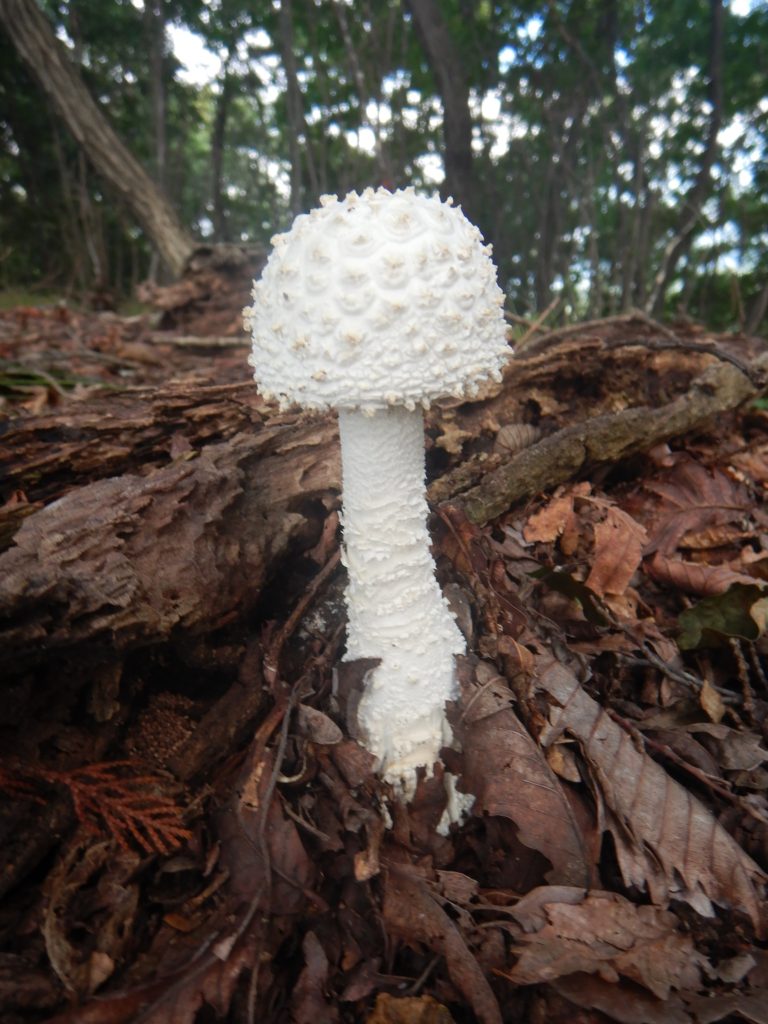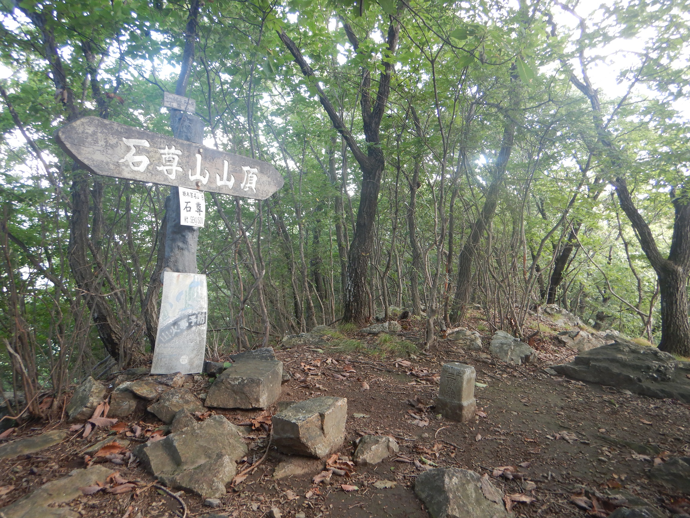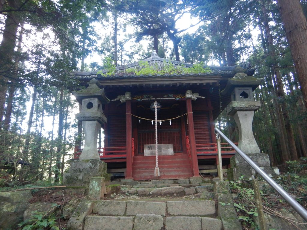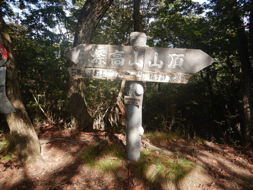 ジメジメの登山道は女人禁制碑あたりから尾根道になり、ベンチのあたりには登山道に日が差し込むようになりました。さらに登ると次第に岩道になり足場に注意しながらの登りとなります。時折木々の間から、周りの絶景を見渡すことができて身持ちがいい。山頂が近くなると、急な岩場の途中に立派な石尊神社の奥宮が現れました。そして、道がなだらかになり、展望台に着きました。歩きやすい平坦な道を進むと直ぐに石尊山山頂に到着。展望はよくありません。そこから1時間ほど歩きやすい道を進むと、深高山に到着。ここも景色は望めませんでした。山頂に設置してある温度計は26℃になっていましたが、私のシャツはすでに汗まみれ。ジメジメした暑さで体力を奪われていました。