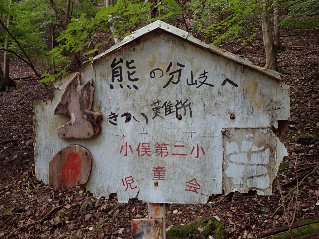 沢筋の道は前回と同じだが、水が湧きだす場所が、1週間前より少し下になっていた。地元の小学生が作った「熊の分岐へ」の標識があった。かつては犬帰りと熊の分岐にもあったが、朽ちてしまい、今はこれだけが残っている。生不動尊で小休止。沢筋で多少流れがあるので尾根よりは涼しいが暑い事には変わりはない。不動沢の滝の少し上で裸になって汗を拭いた。