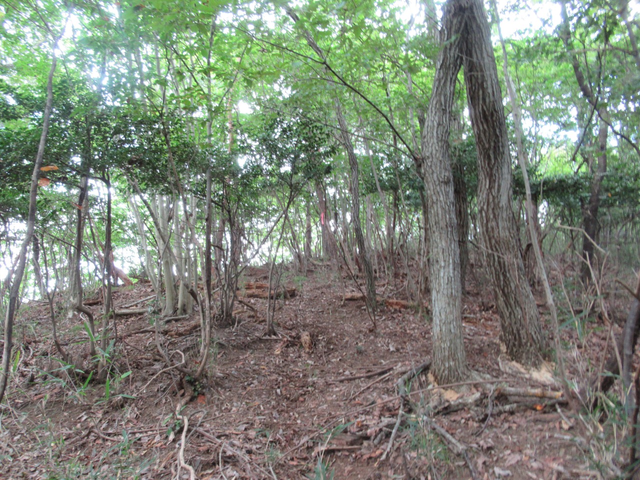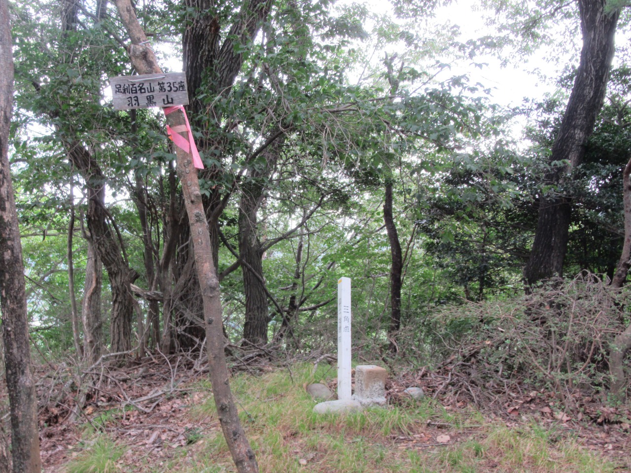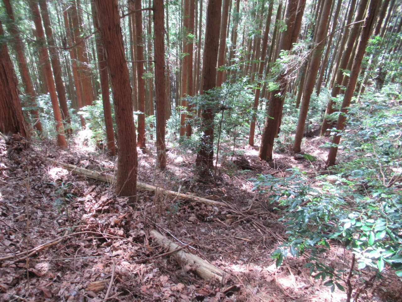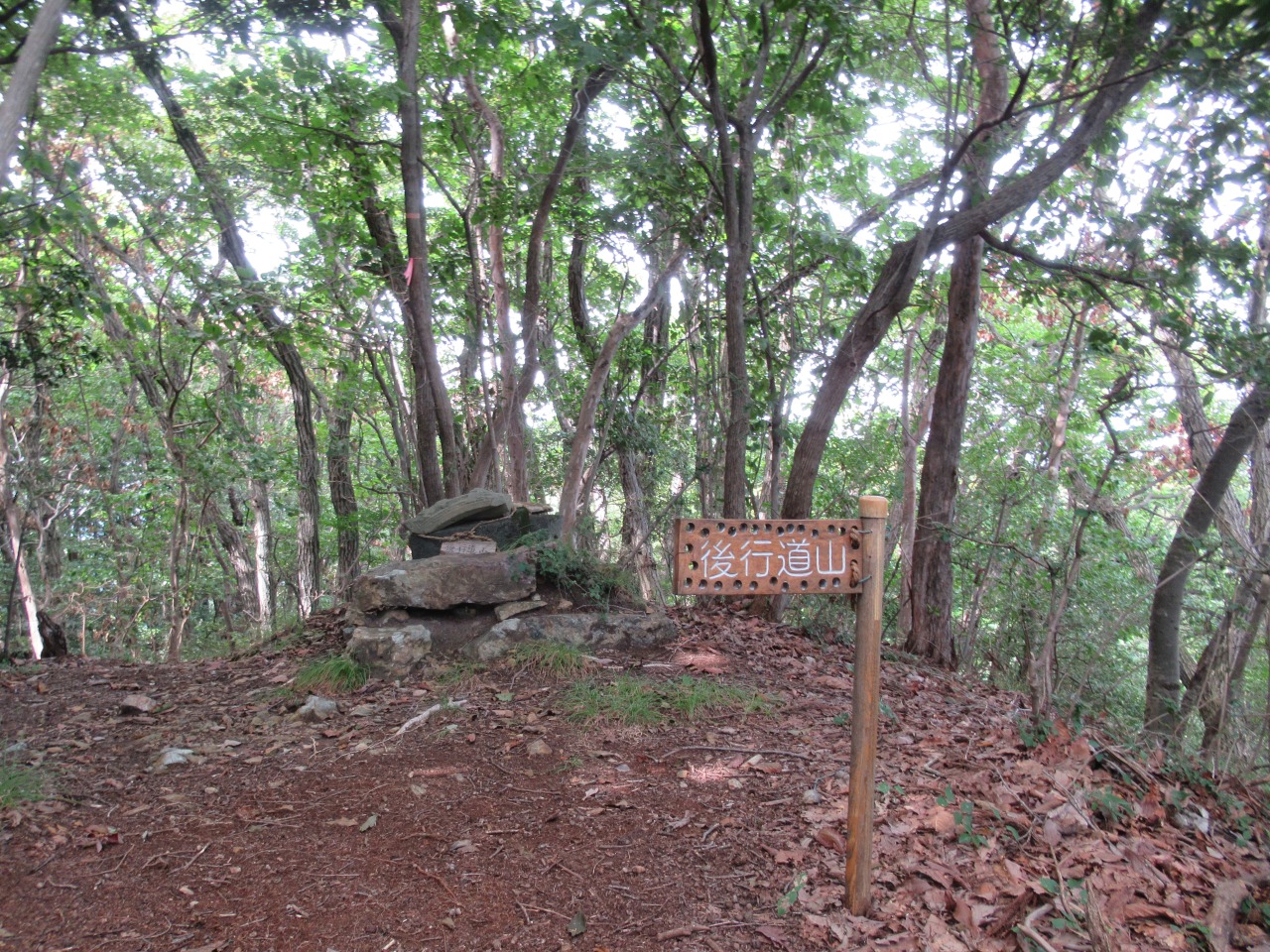 小一時間で241P羽黒山三角点を通過しますが、風も無く鬱蒼として、とにかく暑くてピーク毎に15分程、扇子で体の火照りを冷ましながら時間を掛け進みます。見晴らしの効く小ピークから行道山、剣ケ峰が見え、ストックも使えるちょっとした岩場(ネットでは核心部の記載がありますが大したものではありません)を越えると後行道山(434P)に辿り着きます。体冷却時間は計2時間、涼しければ2時間で登れそうです。浄因寺からの道と合流する仏法僧峠から、石尊山を往復し、国土地理院に記載されている下山道を探しますが、道標も、それらしき道も見当たりません。単純な谷筋を下るルートで踏み荒らした足跡もありますので、GPSと磁石を頼りに枝払いで”ぐちゃぐちゃ”の杉林を下ります。暫く道なき道を進むと、荒れ果てた登山道らしき道が現れ、荒れた林道に出ました。ここまで来ると暑さでバテバテ、追い打ちを掛ける様に炎天下の舗装路を30分歩き起点に戻りました。