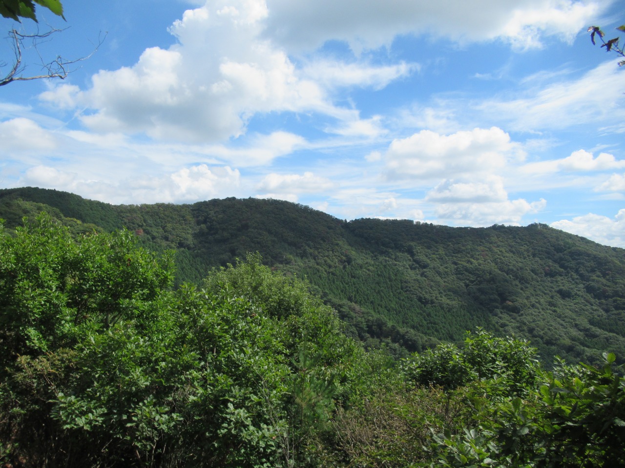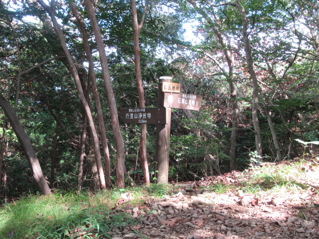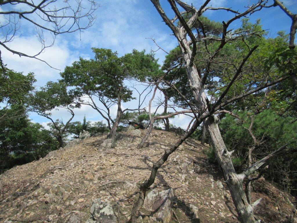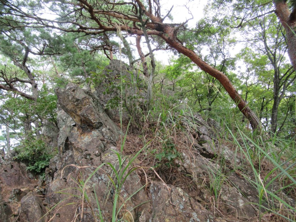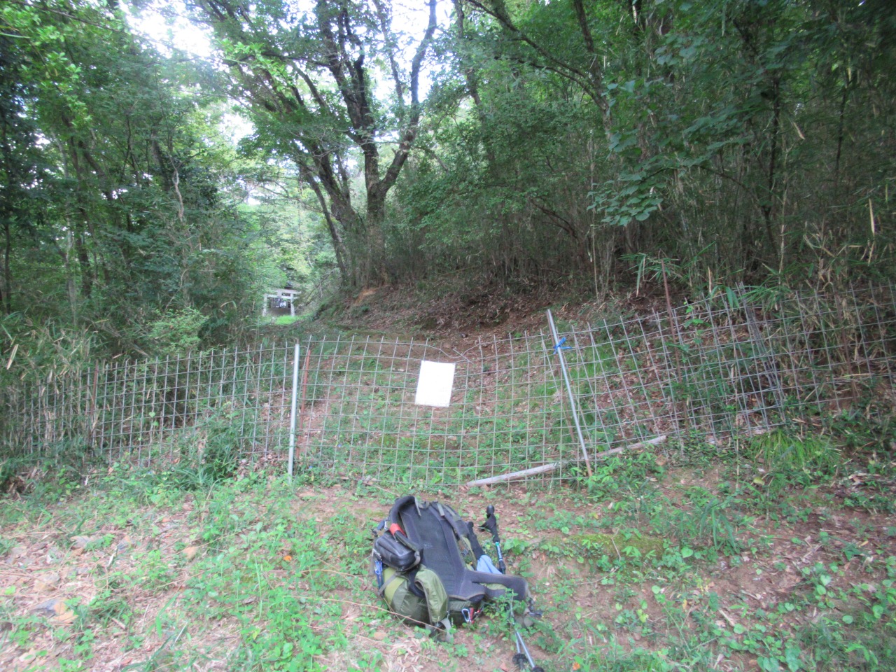 小一時間で241P羽黒山三角点を通過しますが、風も無く鬱蒼として、とにかく暑くてピーク毎に15分程、扇子で体の火照りを冷ましながら時間を掛け進みます。見晴らしの効く小ピークから行道山、剣ケ峰が見え、ストックも使えるちょっとした岩場(ネットでは核心部の記載がありますが大したものではありません)を越えると後行道山(434P)に辿り着きます。体冷却時間は計2時間、涼しければ2時間で登れそうです。浄因寺からの道と合流する仏法僧峠から、石尊山を往復し、国土地理院に記載されている下山道を探しますが、道標も、それらしき道も見当たりません。単純な谷筋を下るルートで踏み荒らした足跡もありますので、GPSと磁石を頼りに枝払いで”ぐちゃぐちゃ”の杉林を下ります。暫く道なき道を進むと、荒れ果てた登山道らしき道が現れ、荒れた林道に出ました。ここまで来ると暑さでバテバテ、追い打ちを掛ける様に炎天下の舗装路を30分歩き起点に戻りました。