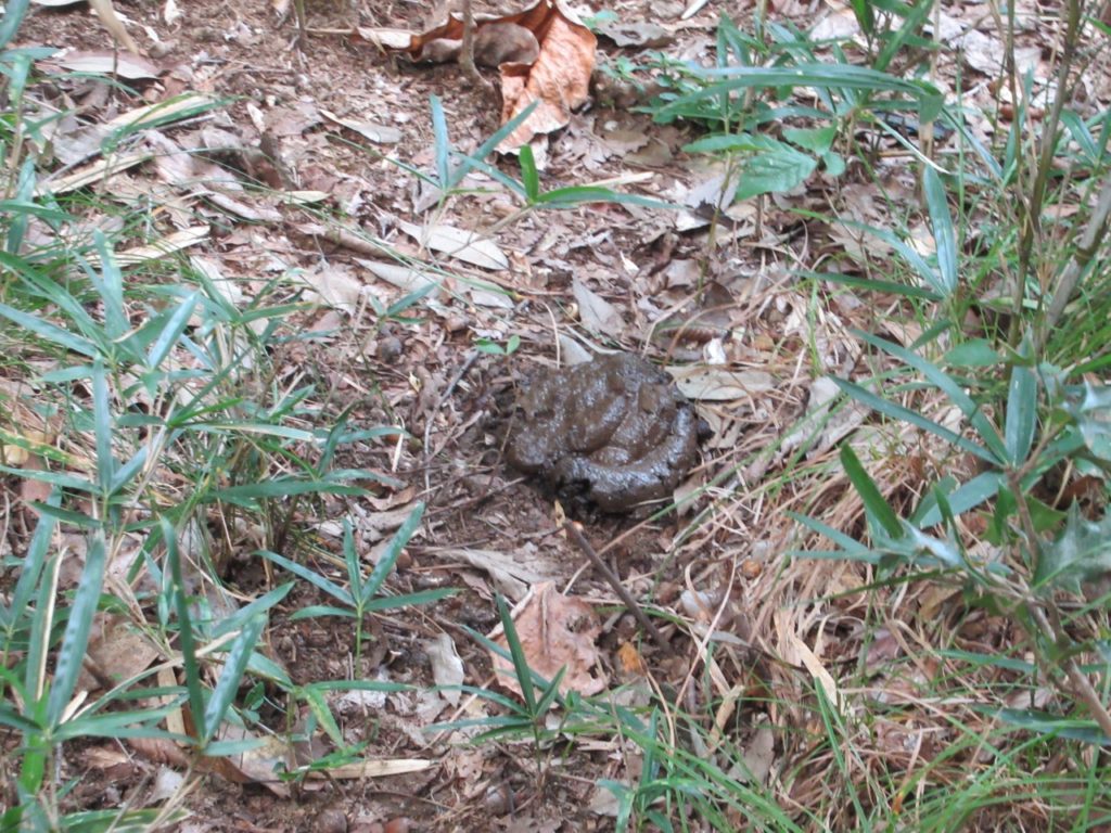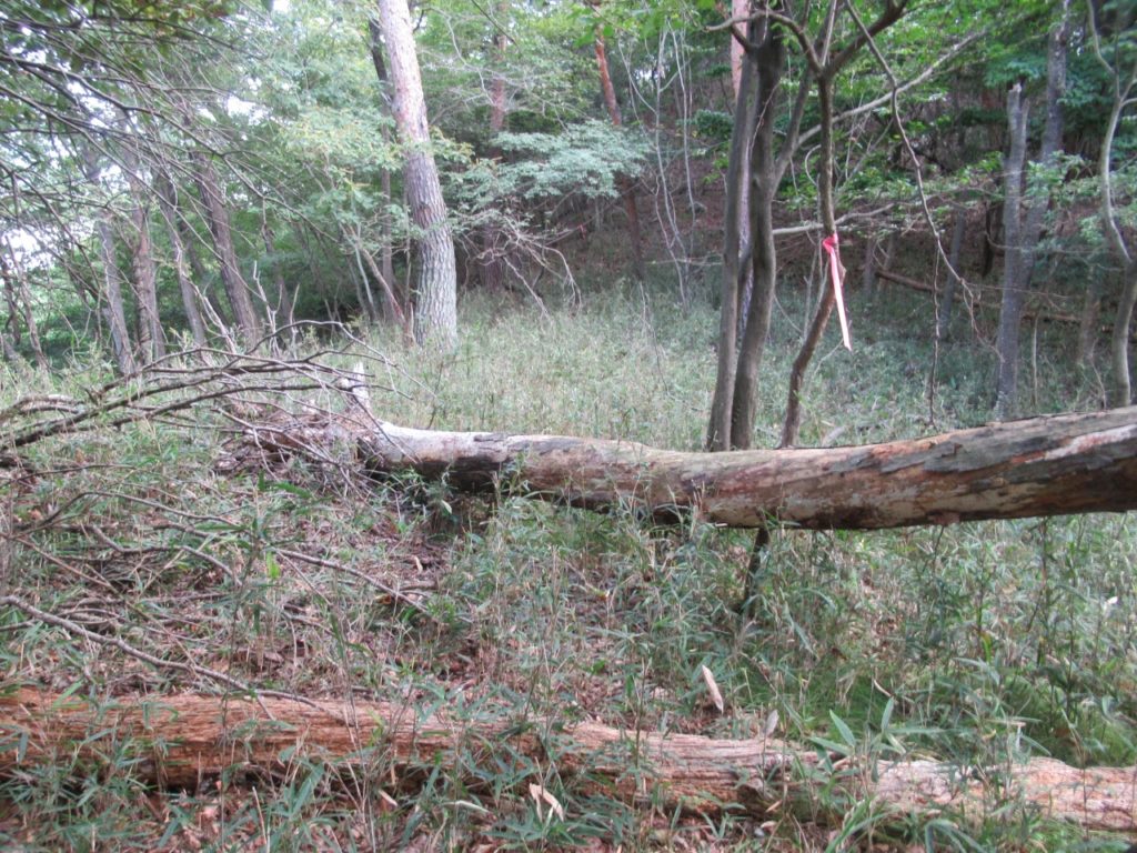 駐車場は麓のソーラー発電所の空き地を拝借、尾根取付きが良くわからず暫し藪の中を探しますが、六之丞八幡宮手前の柵を越え八幡宮左奥にピンクテープがありました。濃い藪漕ぎを覚悟していましたが、殆ど藪は無く、踏み跡、ピンクテープもはっきりしています。直ぐに熊の真新しい糞があり、ここから大声を張り上げながら恐る恐る進みます。倒木はあるもののまだ踏み跡はしっかりしています。