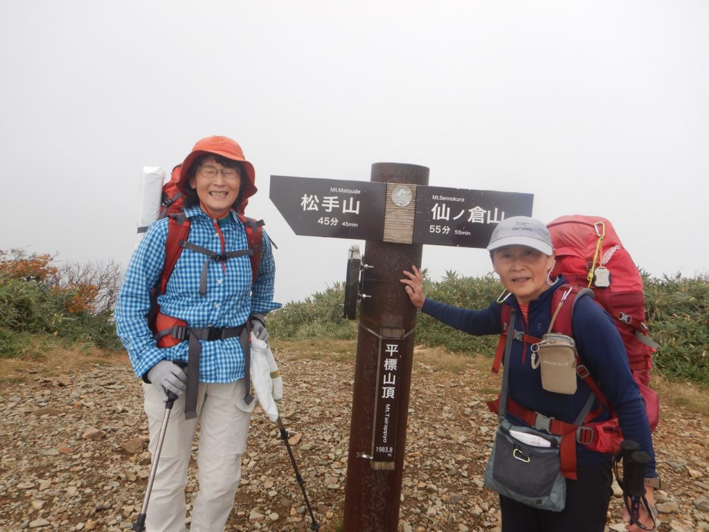 一時間ほど稜線を進んだ仙ノ倉山山頂も、同様に景色は望めませんでした。ザックについている温度計は10℃を差していました。時々冷たい風のため、休憩もそこそこに山頂を後にしました。