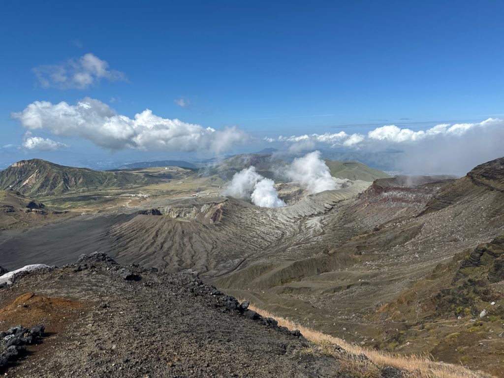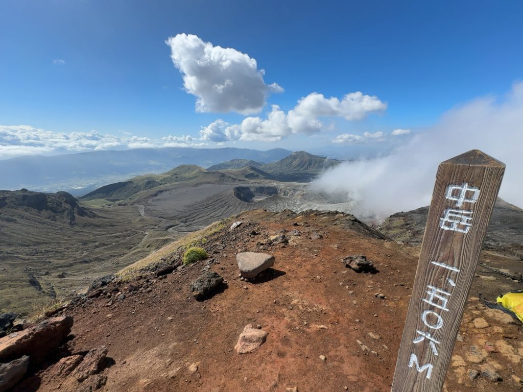 草千里登山口に着くとこ 火口は有毒ガスて立ち入り禁止で多くの観光客は足止め。登山客は少なく登山開始砂千里の月面のような景色や火口を眺めながら中岳を経由して外輪山最高峰の高岳に登頂素晴らしいクレーターを一望できた。この後熊本から鹿児島空港まで戻り、霧島市西郷どんの湯(250円)で地元のおじさんから霧島市の住みやすさを教えていただき帰宅した。