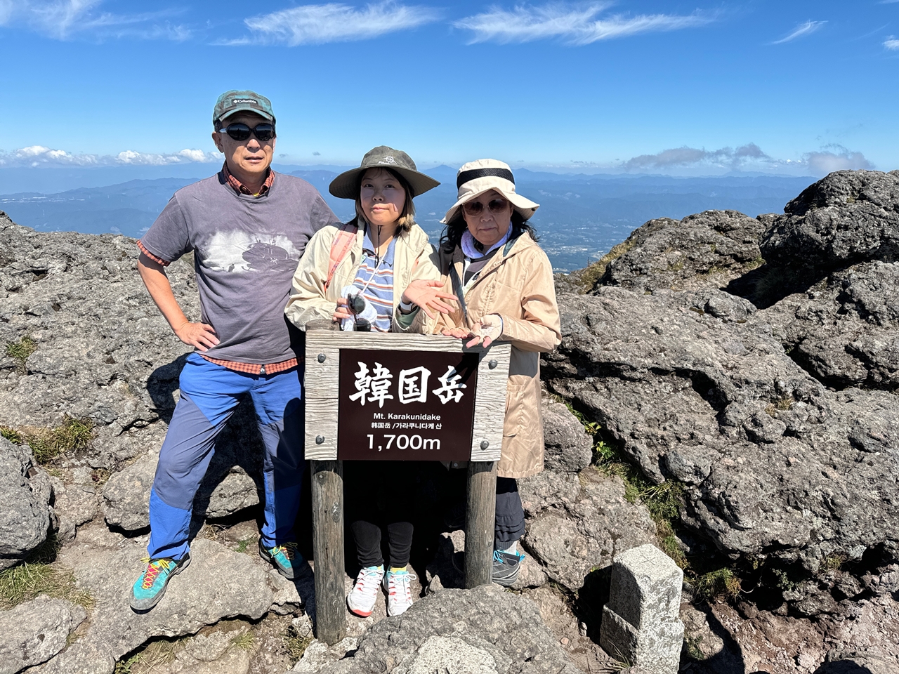 祝日で近くでフェスティバルもあり車は大根雑、快晴で新燃岳、霧島連山、錦江湾、桜島が一望できました。家族3人で登頂は初めてかも。