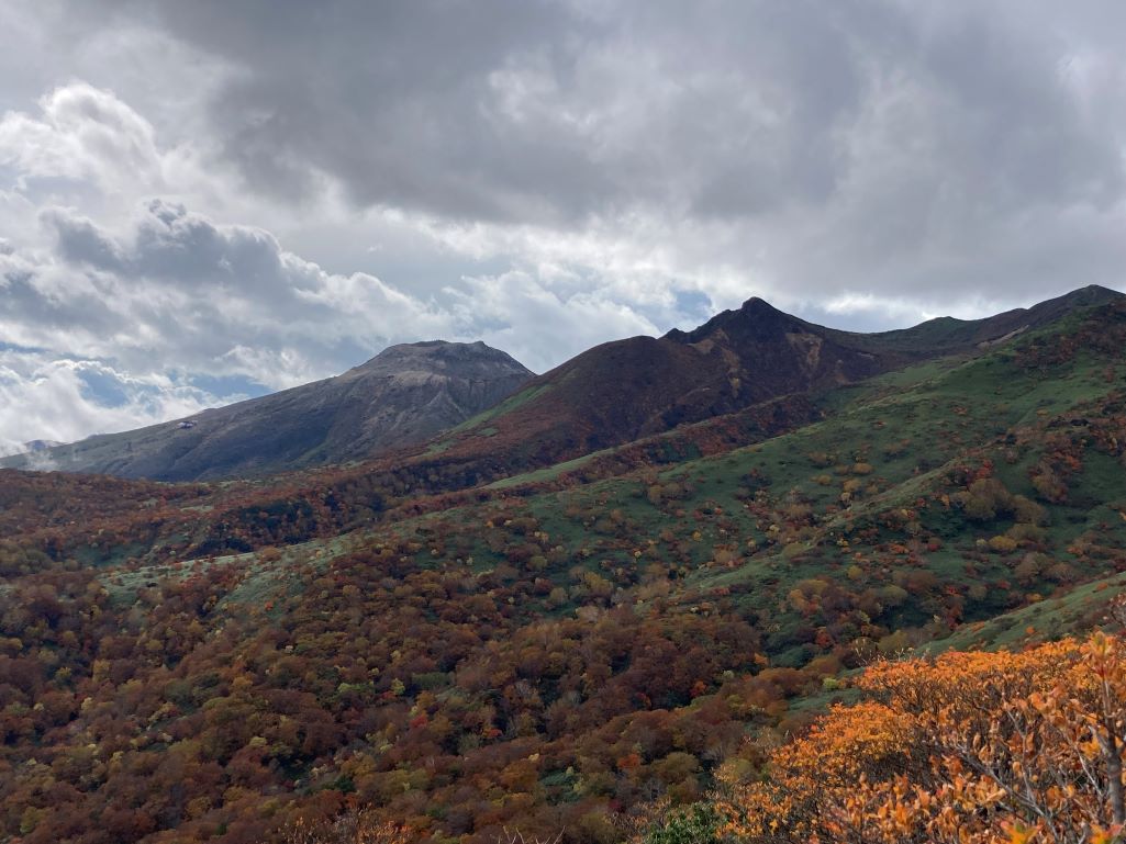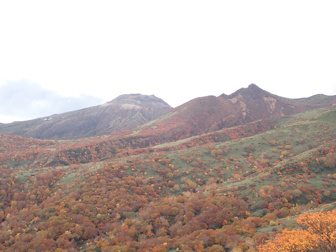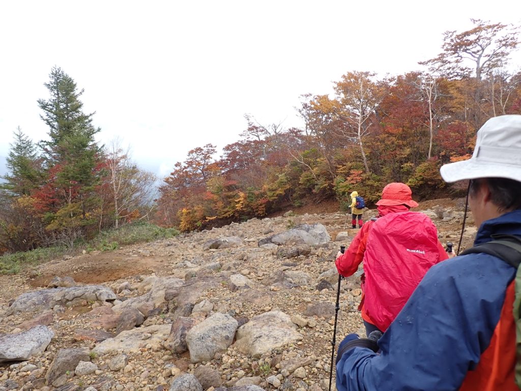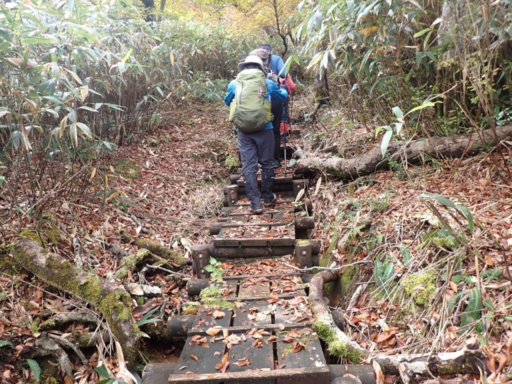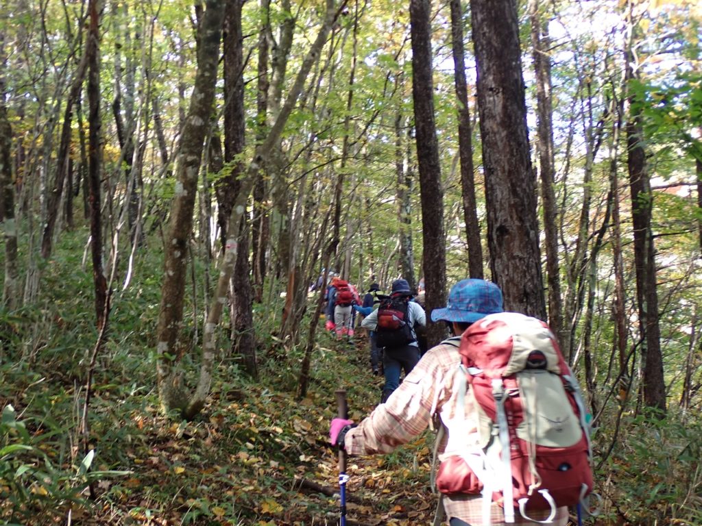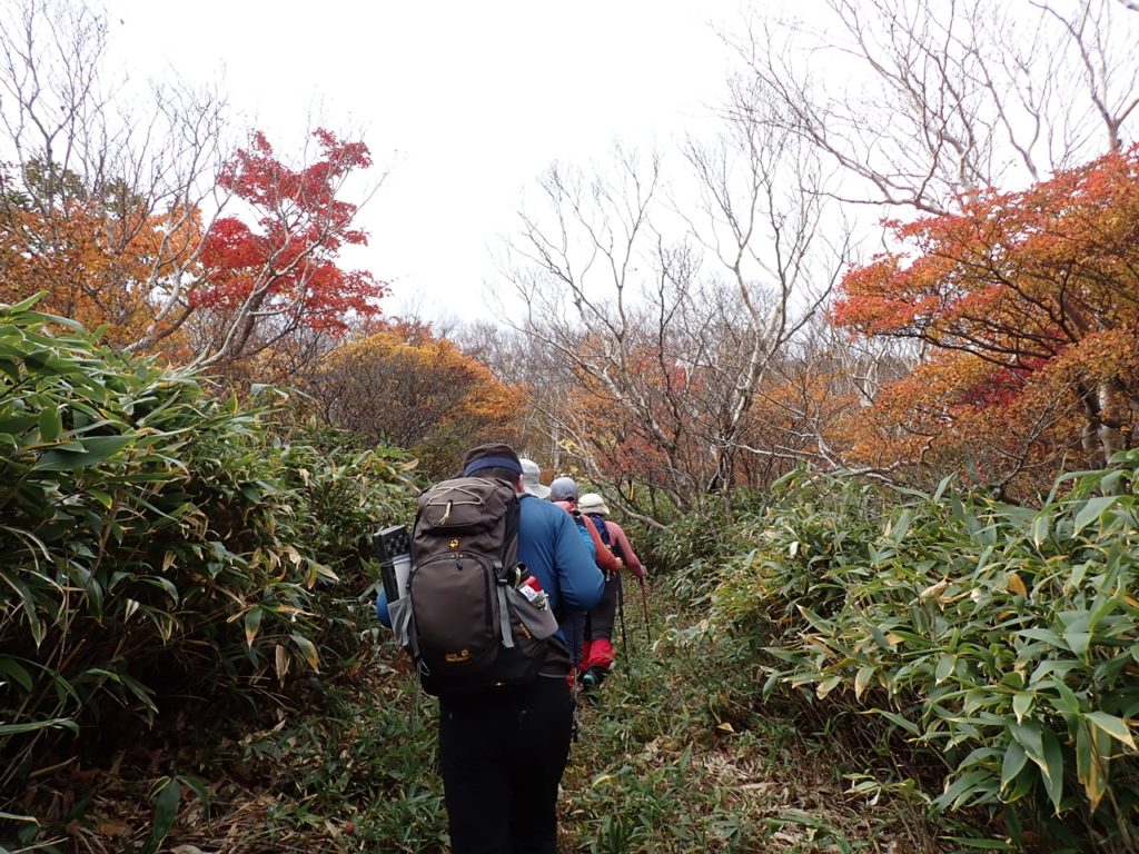 分岐からは木橋が多く、濡れているので滑りやすい事この上ない。滑って泥んこになるのはごめんだ。慎重に登った。キノコや紅葉を楽しんでいる内に先頭4人は先に行って、私たちは5人グループになった。標高1400mで鉄網橋で小沢を渡ったがその小さな沢は音をたてて流れていた。理由はその先で分かった。少し上で導水管から水が噴き出していたのだ。北側の沢から水を引いているようだ。理由は不明だが、スキー場で利用していたのかもしれない。その先でまた怖い木道があり、その先が8合目となる。そこはスキー場跡への分岐だった。その先は笹原でそれに混じる灌木がきれいに紅葉していた。標高1640mまでくるとやっと茶臼岳・朝日岳がその雄姿を見せてくれた。手前の斜面は紅葉している。山頂はもうすぐなのだがここで私達はタイムオーバー。標高1650mで休んで腹ごしらえした。ゆっくり休んでいると山頂を踏んできた4人が下りてきたので一緒に下山開始。休んでいる内に最初に分かれたグループからスキー場跡を下るように筋が来た。