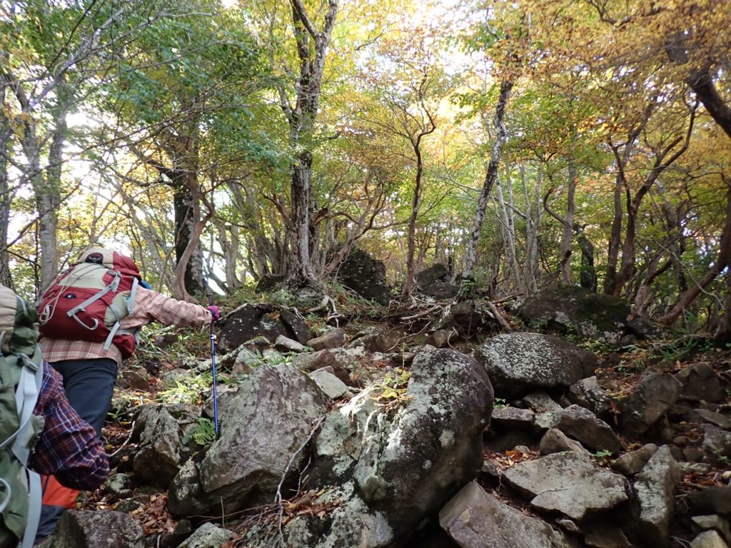「堀川」の標識があるところが登山口で、入るとすぐ小さな沢を渡った。登山道には笹が張り出していた。標高1000m先に鉄階段があり、それを登って尾根に向かう。落葉樹林帯の歩きやすい登山道を緩くジグザグに登っていく。昨日の雨で落葉は濡れていた。標高1150mの手前から傾斜は一気に緩やかになり、キノコも少し見られるようになった。ホコリタケの大きな株があった。見たことのない大きさで驚いた。標高1160mあたりから岩場となり傾斜もきつくなる。岩場を過ぎて傾斜が緩んだ所に5合目の標識があった。木製の標識もあったが文字は読めない。そのあたりから紅葉が増えてきる。見上げるとコシアブラの黄葉が青空に輝いていた。その先で再度笹がでてきるとその中の倒木にもキノコが見られた。