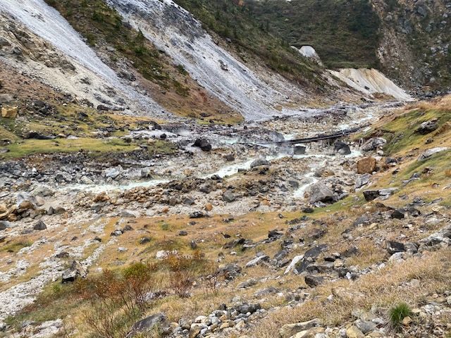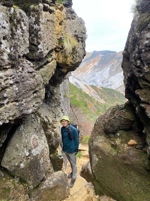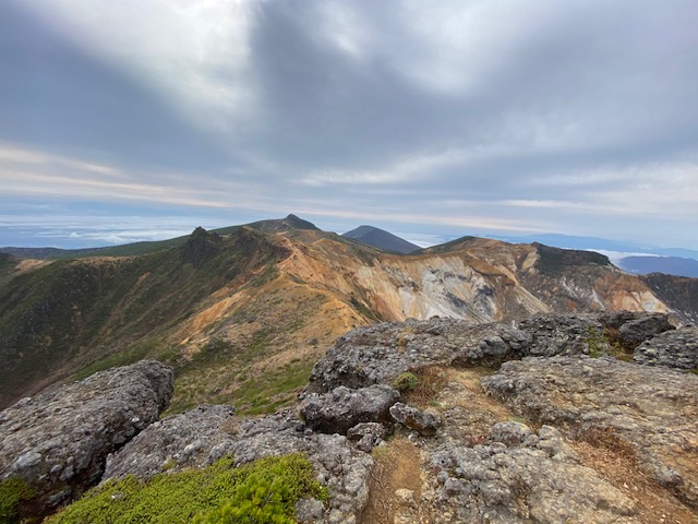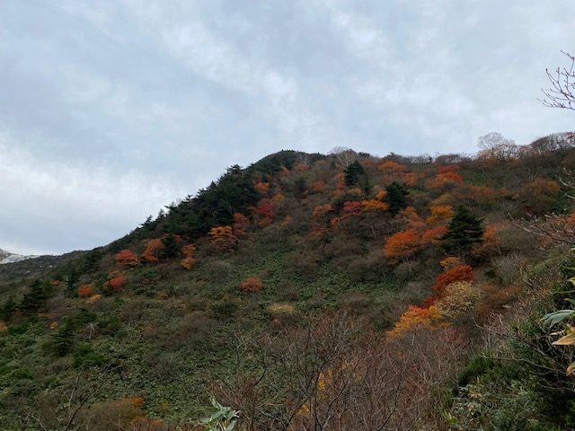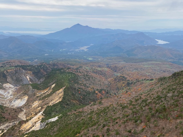 小山を4時に出発しあだたら高原スキー場に6時20分頃到着。すでにそれなりに駐車場は埋まっていて、無料駐車場の方に止めた。6時40分より登山開始。かなりの人が登っているので抜きつ抜かれつしながら五葉松平に到着。乳首が見えるが雲はかかっていない。また下を見渡すと終わりかけではあるが紅葉が見られた。安達太良山までは岩場の登りで、それ以外のところは結構ぐちゃぐちゃな道が多い。安達太良山到着。多くのハイカーがいた。写真を撮ったら、すぐに鉄山に向かった。いきなり風が強くなり、ウインドブレーカーを羽織った。前回も同様のコースを辿ったが、爆裂火口が見えると景色が一変する。黄土色と灰色のコントラストが素晴らしい。鉄山へは回り込んで山頂に行く。ここも写真スポットで安達太良山をバックにいい写真を撮った。鉄山避難小屋で食事休憩してから、行ったことのない箕輪山に行ってみた。ドロドロの道が多い。山頂では10人くらいの人が楽しそうにしていた(地元と思われるおばちゃんたちの声が大きかった)鉄山避難小屋に戻り、断崖絶壁の上をしばらくゆくと沼尻方面の紅葉が見事であった。赤とオレンジが特に鮮やかであった。体内潜りも面白く、そこから出た後の絵画のような景色には驚いた。前回も綺麗だなあと思ったが、今回も素晴らしかった。硫黄川まで急な滑りやすいくだりで気を使った。硫黄川は硫化水素の匂いが立ち込め、なんと鉱山後の小さな空き地にテントを張ったおじさんを発見。おそらく温かい硫黄川の場所を知っているのだろう、洗濯物が干してあった。ここから沼尻分岐まではかなりのしかも滑りやすい急登であった。無言で登ってようやく一服の場所に辿り着いた。ここまでの紅葉も素晴らしかった。カップラーメンを食べて、また沼尻分岐を目指した。人はほぼいなくて、独占状態であった。安達太良山が近づくと数人の人とすれ違った。かなり遅くなってきたので乳首に登るのはやめて、下山を開始した。だんだん暗くなる中、峰の辻も勢至平分岐まではぐちゃぐちゃの非常に歩きづらい登山道で、分岐からは林道を進んでヘッドライトをつける寸前でスキー場の明かりが見えたので、結局使わずに下山できた。