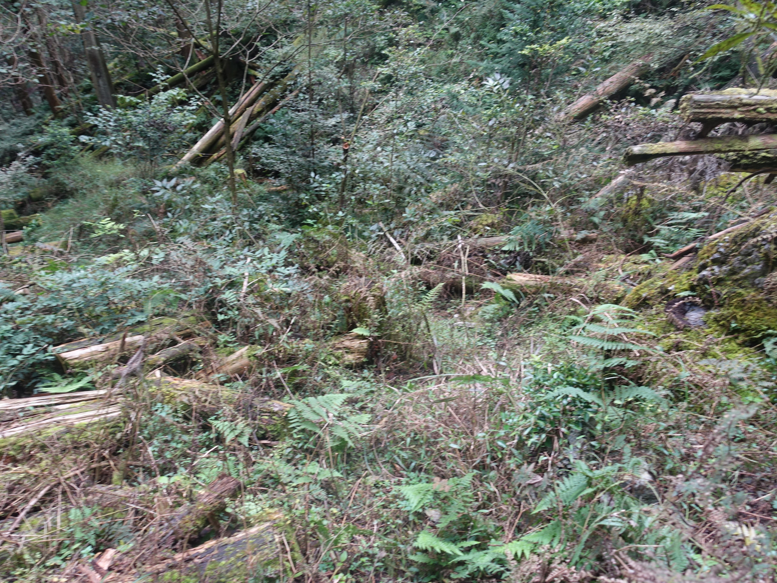 キレットで一息入れ南峰へは気分的に乗らず諦めることにする。これがあとあと苦労することになる。尾根の分岐まで上がり、南西への尾根を行く。直ぐに加園への分岐(谷間コース)があり、一服して下山。これがそもそもの間違い、予定の周回ルートは南峰を登らないとダメだったのだ。今日のルートは沢沿いではあるが、尾根一つ西になり駐車場には直行しない。途中何度かトラバースルートを探すが無い。この加園ルートも倒木多く、荒れていて大変であった。