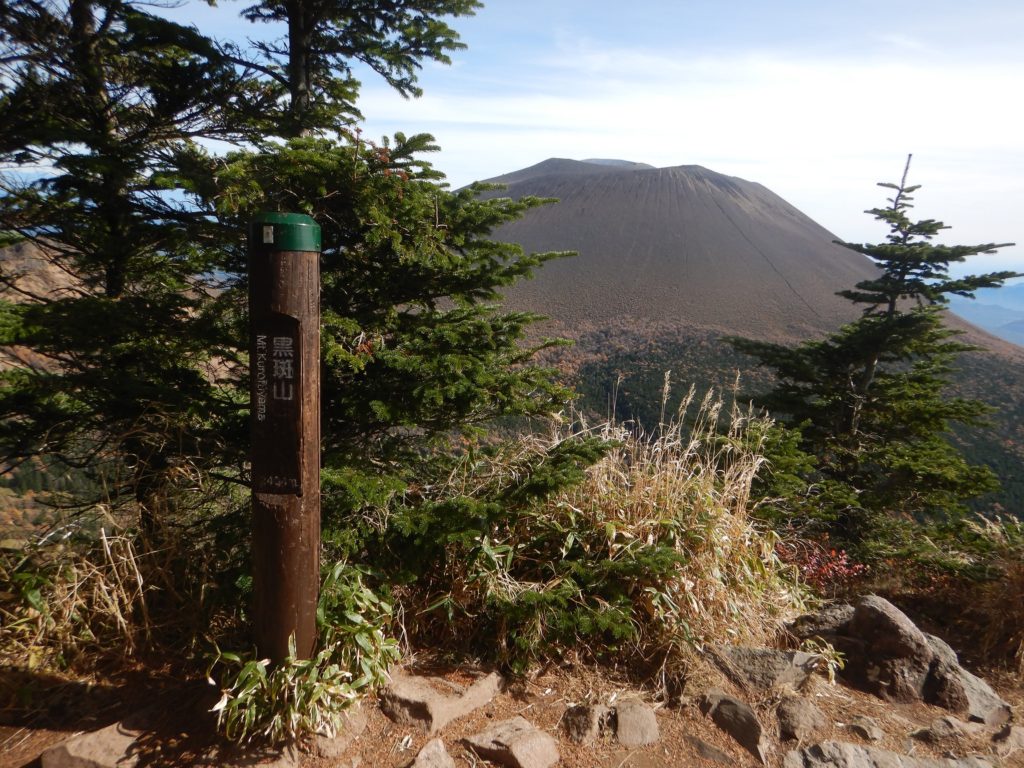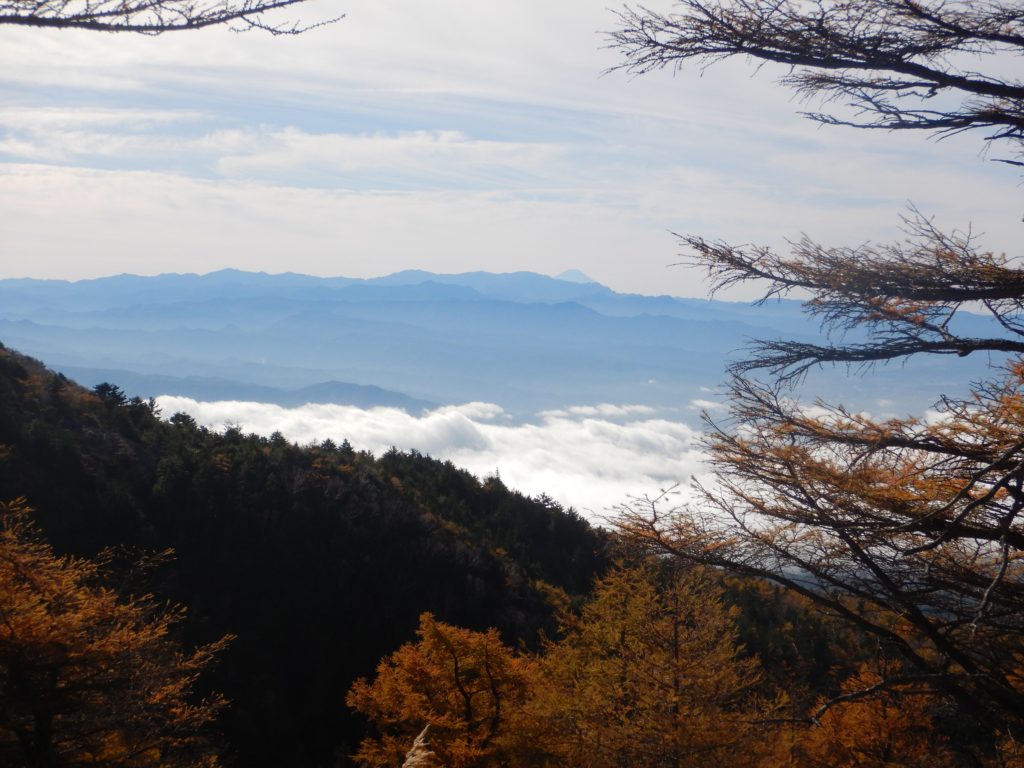槍ヶ鞘に着くと、正面に大きく浅間山が現れました。そして、その広い裾野には黄色く色づいたカラマツ林。まさしく浅間ゴールドの世界でした。ですが、ほかの登山者によると、昨日までの強風で、黄色い葉がほとんど落ちてしまい紅葉も終盤とのことでした。浅間山の展望はこの先、トーミの頭でも望むことができました。そして、黒斑山から望む浅間山は、こちらから浅間山を見下ろしているように素晴らしいものでした。