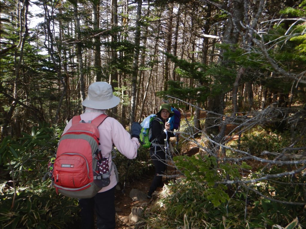 朝、駐車場に着くと、ほぼ満車状態で、浅間ゴールドのファンが大勢いることに、改めて驚かされました。登山口から、表コースを樹林帯の尾根を登ると途中、樹林の切れ目から、遠くに北アルプス・穂高連邦の山々と槍ヶ岳がはっきり確認できることに感動。その左には八ヶ岳と富士山が確認できました。この日の空はもやもなく一日中、遠くの山々を見渡すことができて、それは山の疲れなど忘れてしまうほどでした。