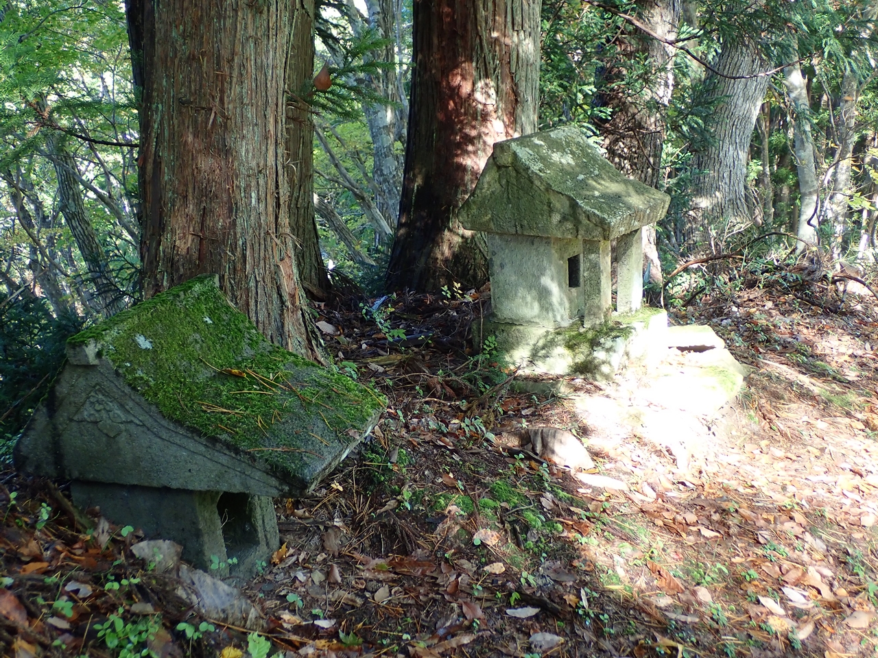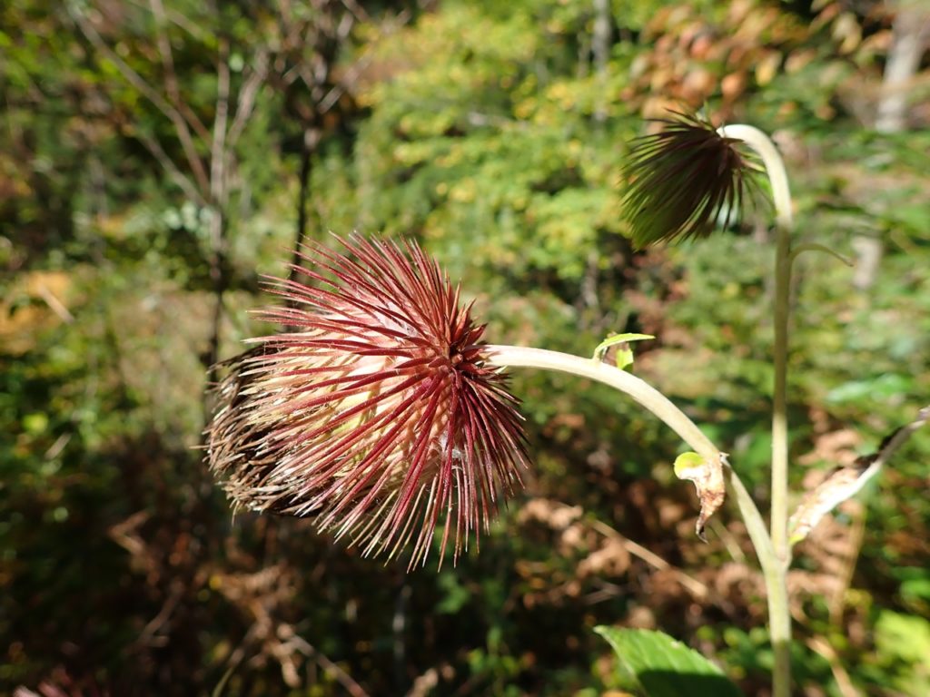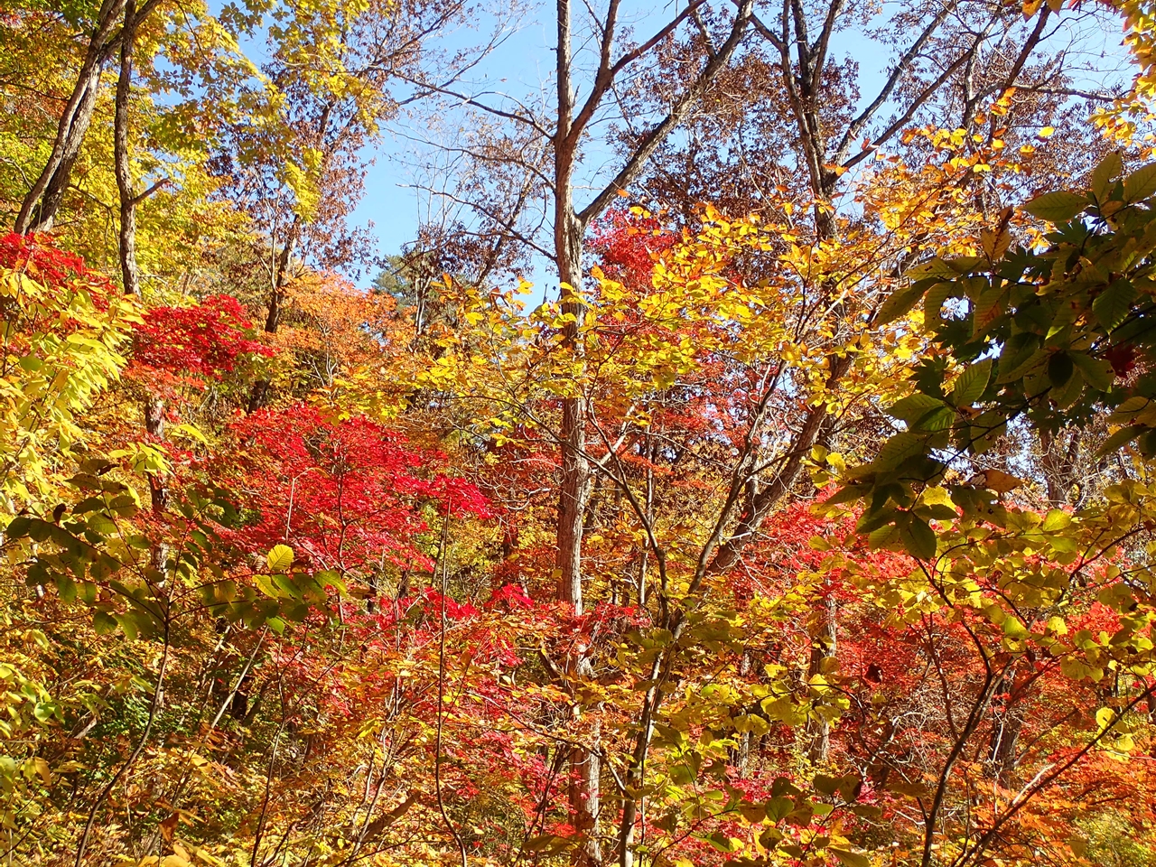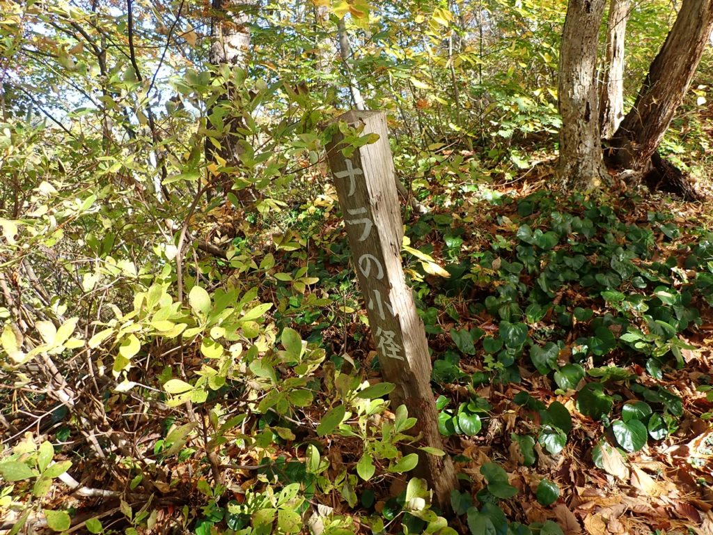 平らな草地を左に進むと登山口が見えてきた。その前で植物のツルに足を取られて転びそうになった。最初はかなりの急登箇所がある。4基の石祠が祀られている先に巡視路分岐がありそこからは傾斜は緩んだ。送電線の下は草地になっていて、草が伸び放題になっていた。その中にオヤマボクチを見つけて嬉しくなる。標高700m近くまでくると、「ナラの小径」の標識杭があり、その辺りの紅葉が見頃にだった。青空に赤・黄、それに常緑が冴えている。そこで、大休止してから下山した。巡視路分岐で巡視路の階段を下って駐車場に戻った。