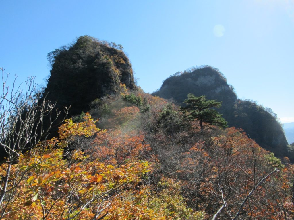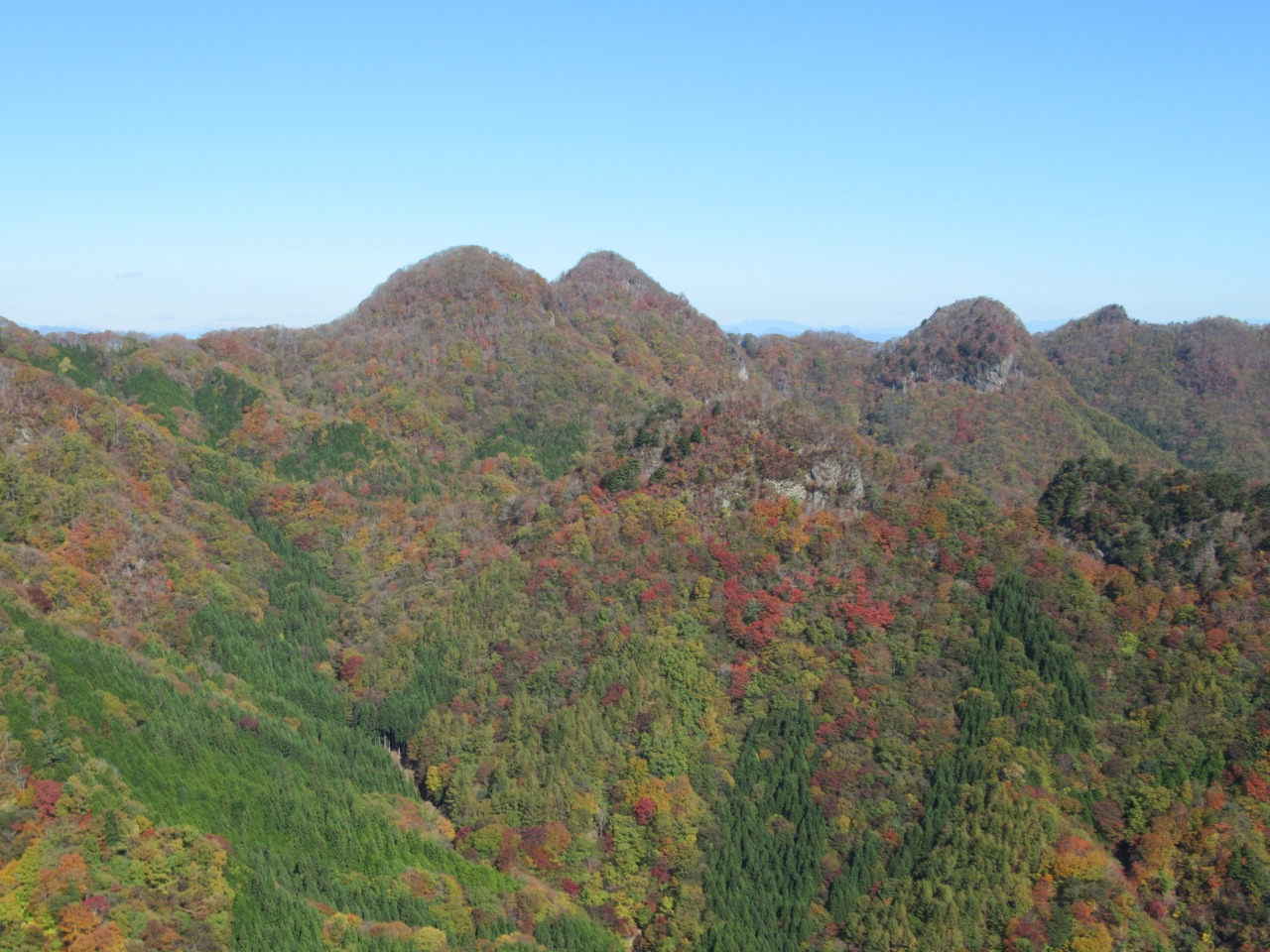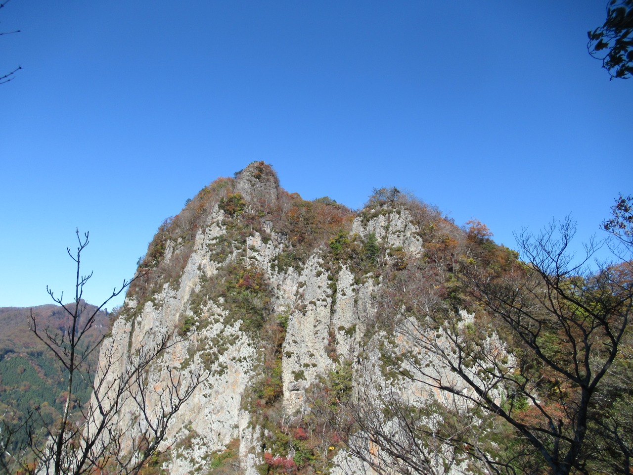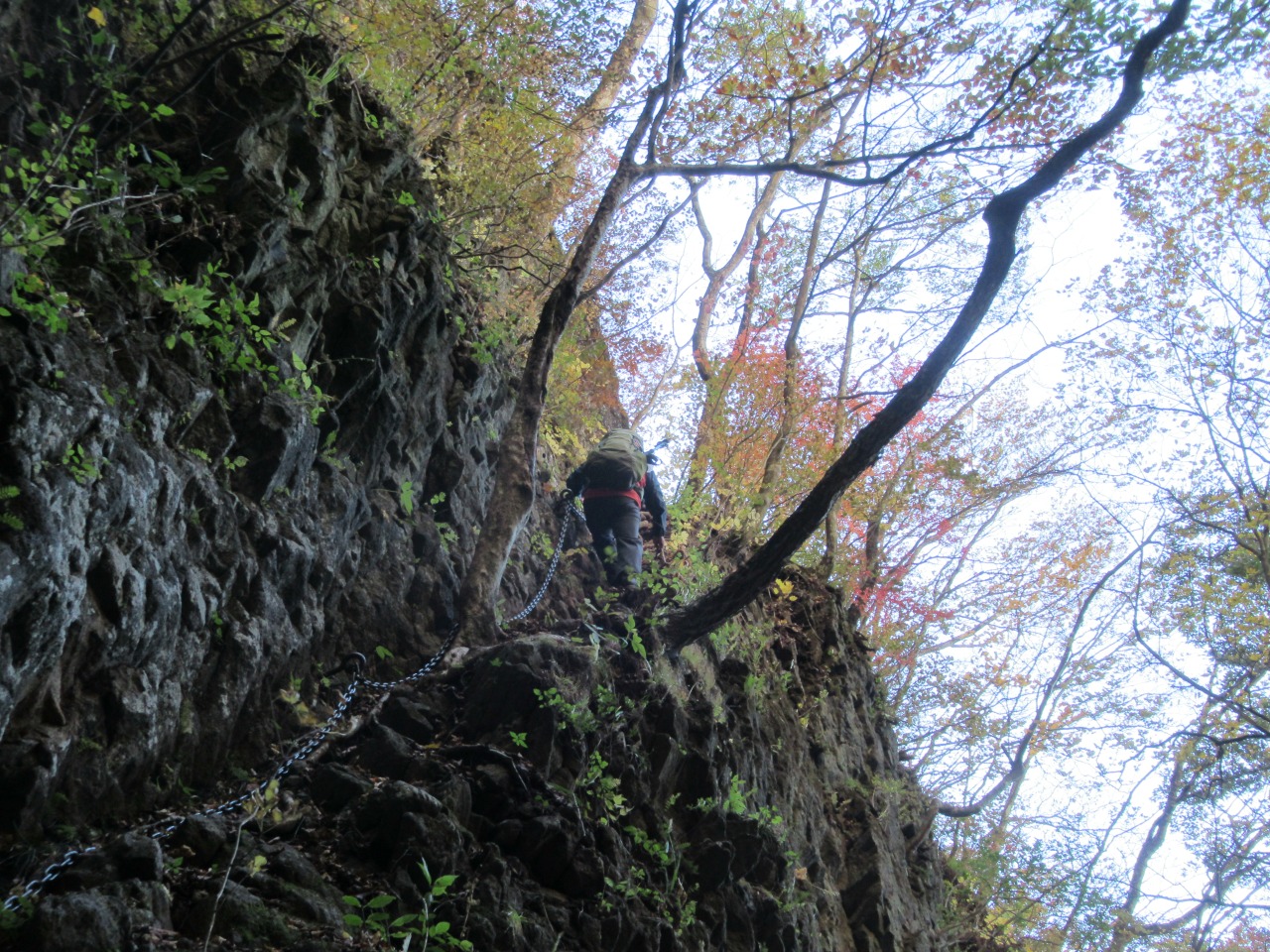 中腹辺りの紅葉はまだで青々としています。コルに向かうトラバース鎖場辺りで漸くモミジも色づき始め、コルから上が盛りですが今年の色付きは今一つで赤茶けて枯れた木も目立ちます。切れ落ちた細い稜線を慎重に進み東立岩山頂で小休止、西立岩の岩峰を見ながらコルに引き返し、西立岩に歩を進めます。岩峰裏の急斜面を登り西立岩ベンチで大休止、単独の方が後から来られましたが、本日会ったのはこの方だけでした。天気も良いので、荒船、浅間、両神山、八ヶ岳、早くも真っ白になった谷川方面など良く見渡せました。
