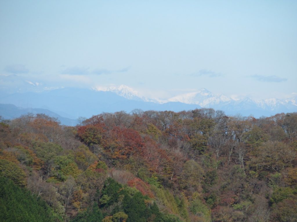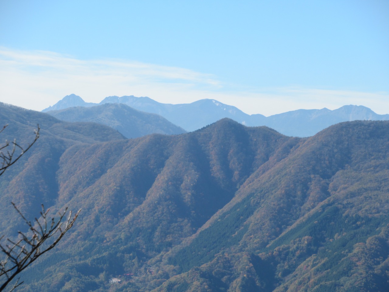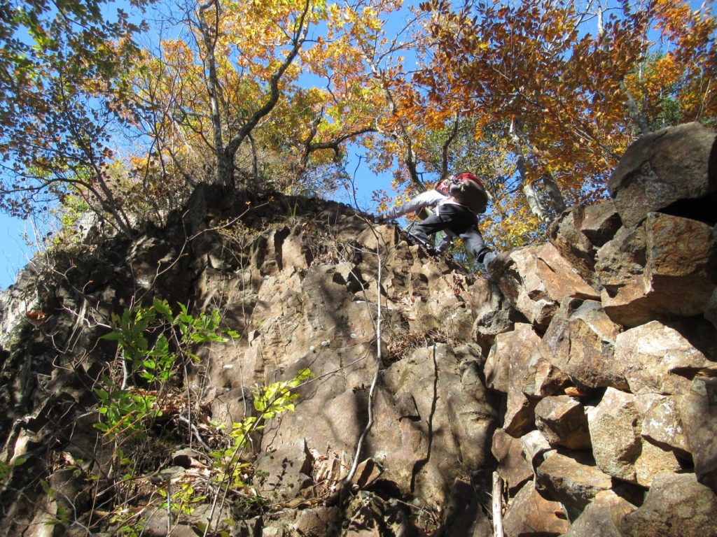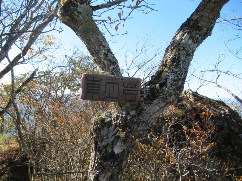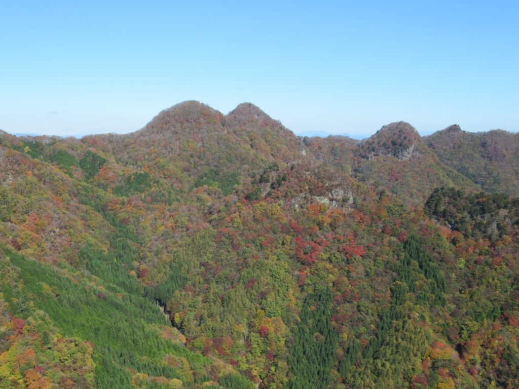 中腹辺りの紅葉はまだで青々としています。コルに向かうトラバース鎖場辺りで漸くモミジも色づき始め、コルから上が盛りですが今年の色付きは今一つで赤茶けて枯れた木も目立ちます。切れ落ちた細い稜線を慎重に進み東立岩山頂で小休止、西立岩の岩峰を見ながらコルに引き返し、西立岩に歩を進めます。岩峰裏の急斜面を登り西立岩ベンチで大休止、単独の方が後から来られましたが、本日会ったのはこの方だけでした。天気も良いので、荒船、浅間、両神山、八ヶ岳、早くも真っ白になった谷川方面など良く見渡せました。