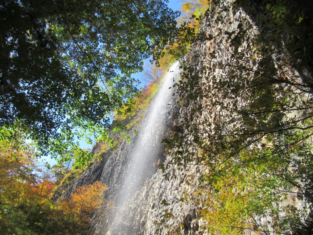 威怒牟畿不動の滝は秋なので水も落ちていないであろうと期待はしていませんでしたが、水量も多く雨の様に飛び散る水飛沫が日の光に輝きとても綺麗でした。暫し見入った後小一時間で駐車場に戻りました。
