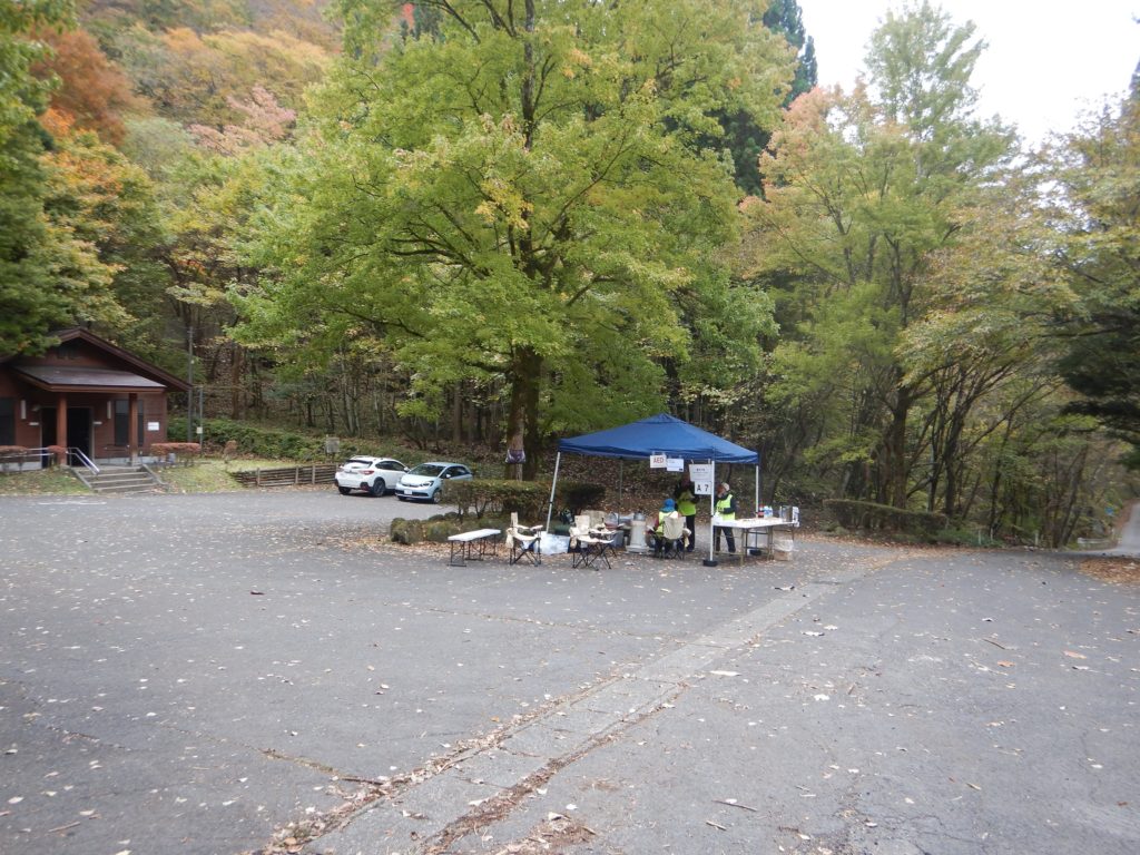 その後、クルマに乗り次の担当の場の裏見の滝の駐車場に移動。ロングコースの中に設置する7か所のエイドステーションの終盤7番目で選手の案内、声掛け、励ましや飲み物、食糧の提供を行いました。
