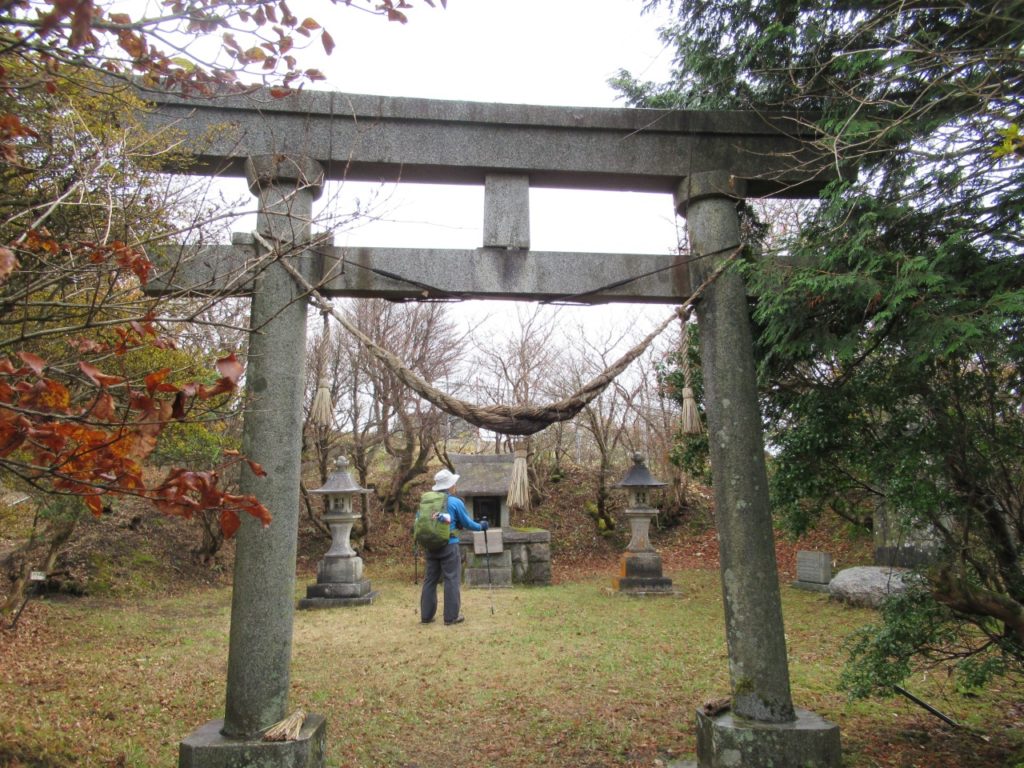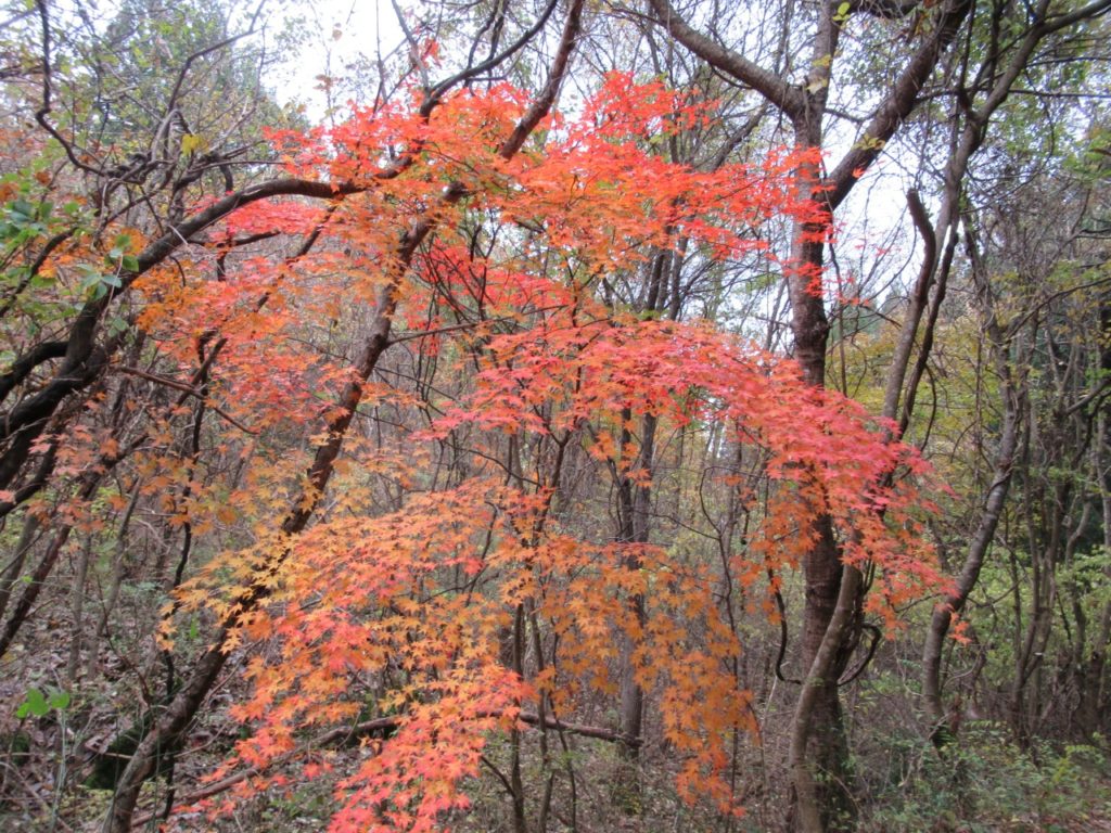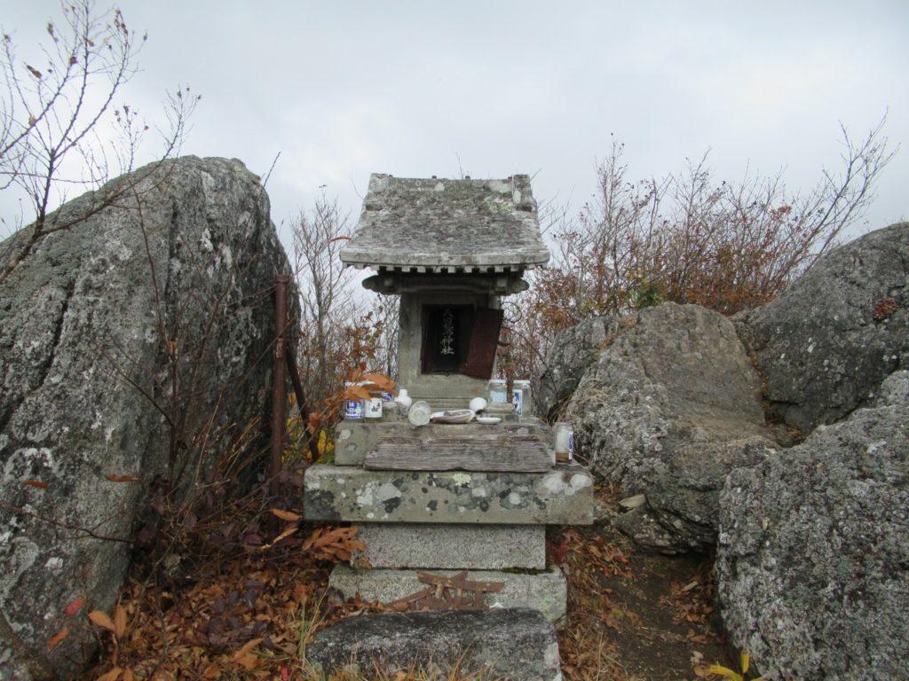 天日鷲神社まで車で30分程、30台程停められる駐車場がありましたが道路が続いていますので更に先に行き駐車スペースに停めました。舗装道を10分程歩き登山口になりますが、登山口付近の路肩も広く、1台停まっていました。こちらの紅葉も中腹より下、大滝根山より鮮やかです。石切り場跡から先が急登、麓から見ると岩山ですが、裏を巻き危ない所もありません。山頂には立派な祠がありますが、山名板は無く、岩峰の上なので360度の眺望で晴れていれば那須、安達太良なども見渡せる様です。4人程会いましたが閑散とし、ボケ咲きのツツジと近場の景色も眺め大休止し、往路を下山しました。