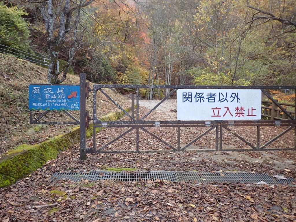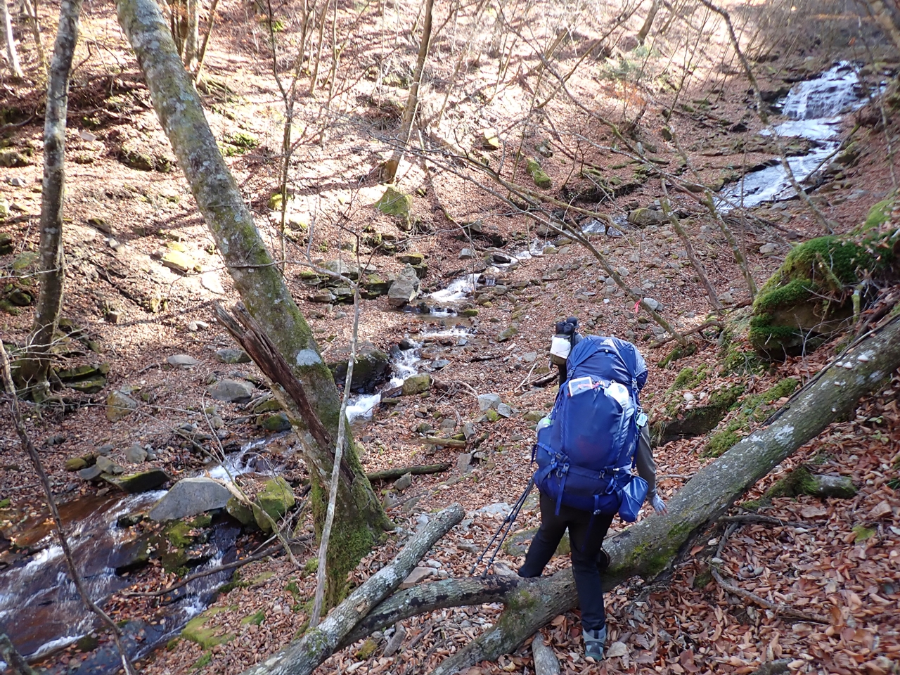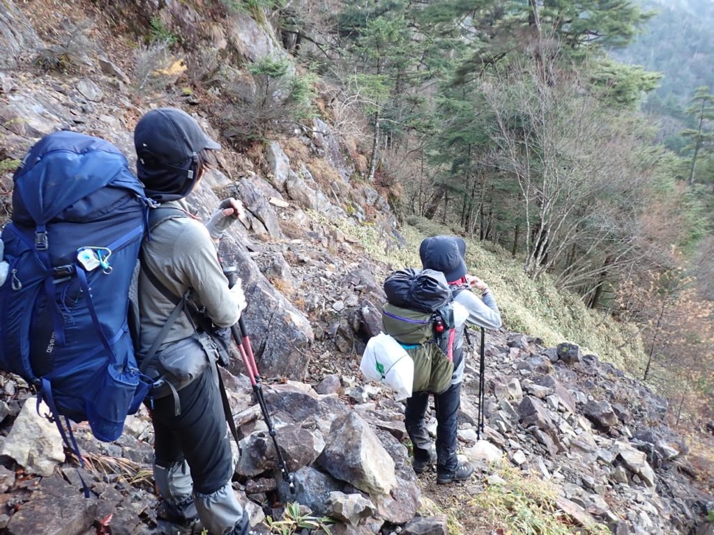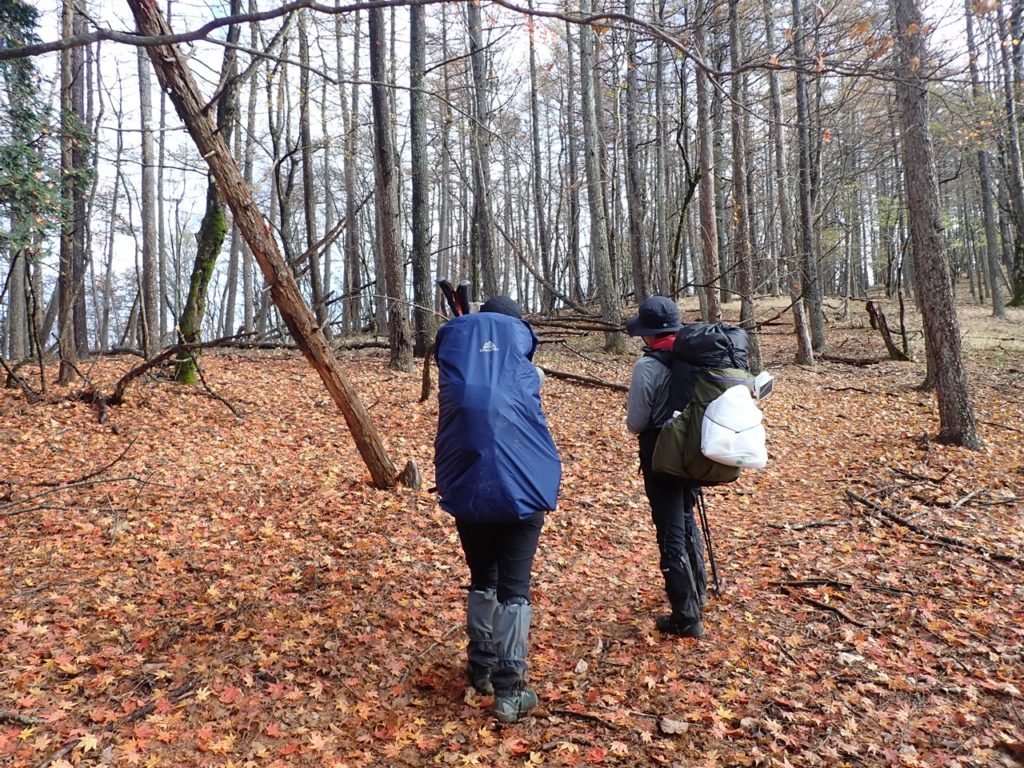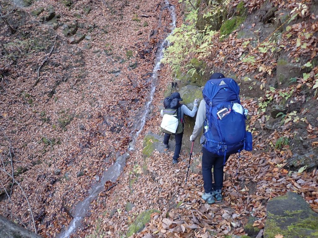 山側の駐車場には工事車両がいっぱい停まっていたが、快く通過させてくれた。林道に入るには「関係者以外立入禁止」の掲示があるゲートがあるが、「雁坂峠登山道」の看板もあり、左側をすり抜けて林道に入ることができた。道の駅みとみから歩き始めるより30分程短縮できるのでありがたい。落葉の積もる林道を1時間弱歩くと林道は終わる。小休止。そこから登山道が始まる。道は峠沢の左岸を進む。クッキリ沢を渡ったところで小休止。その先で右岸への渡渉場所が分かりづらいが、水量が少ないので問題なく渡ることができた。渡った先で登山道の崩落がある。ザックが重いので悪場の通過には気を使う。井戸沢を渡ると一気に斜度が増してジグザグに高度を上げていく。