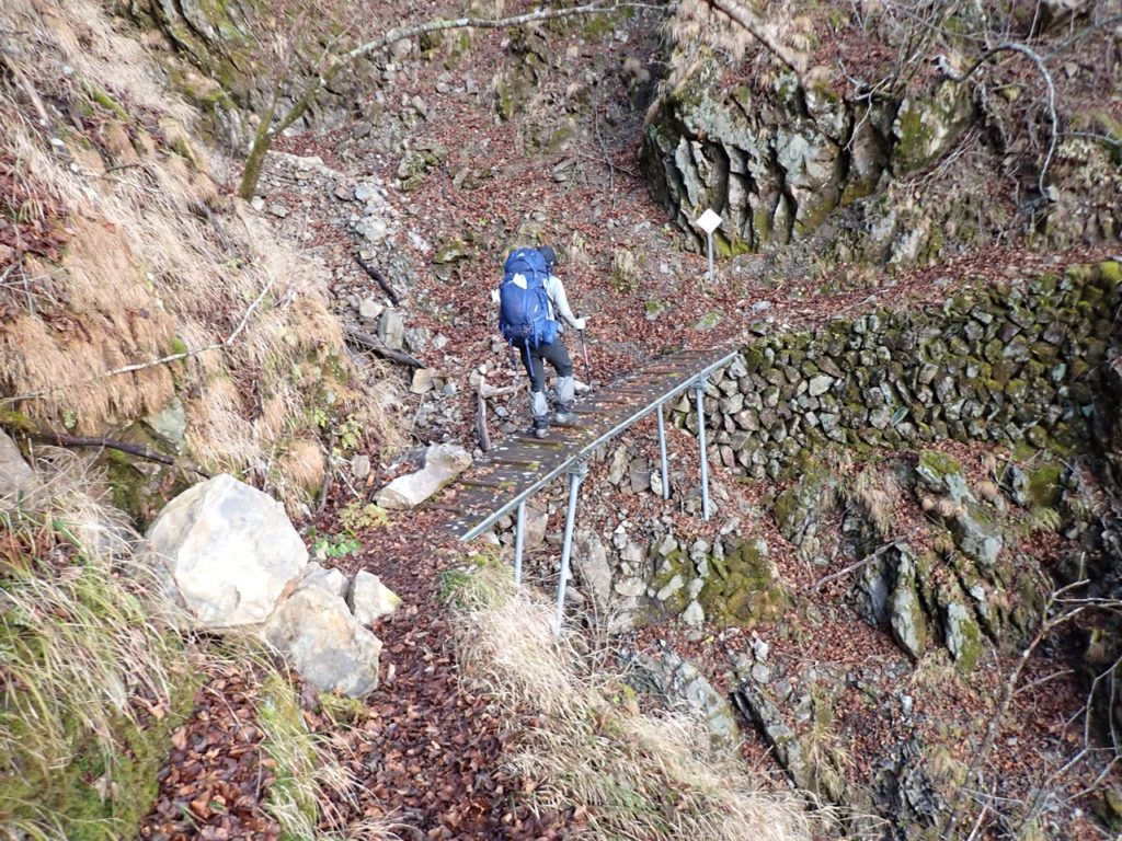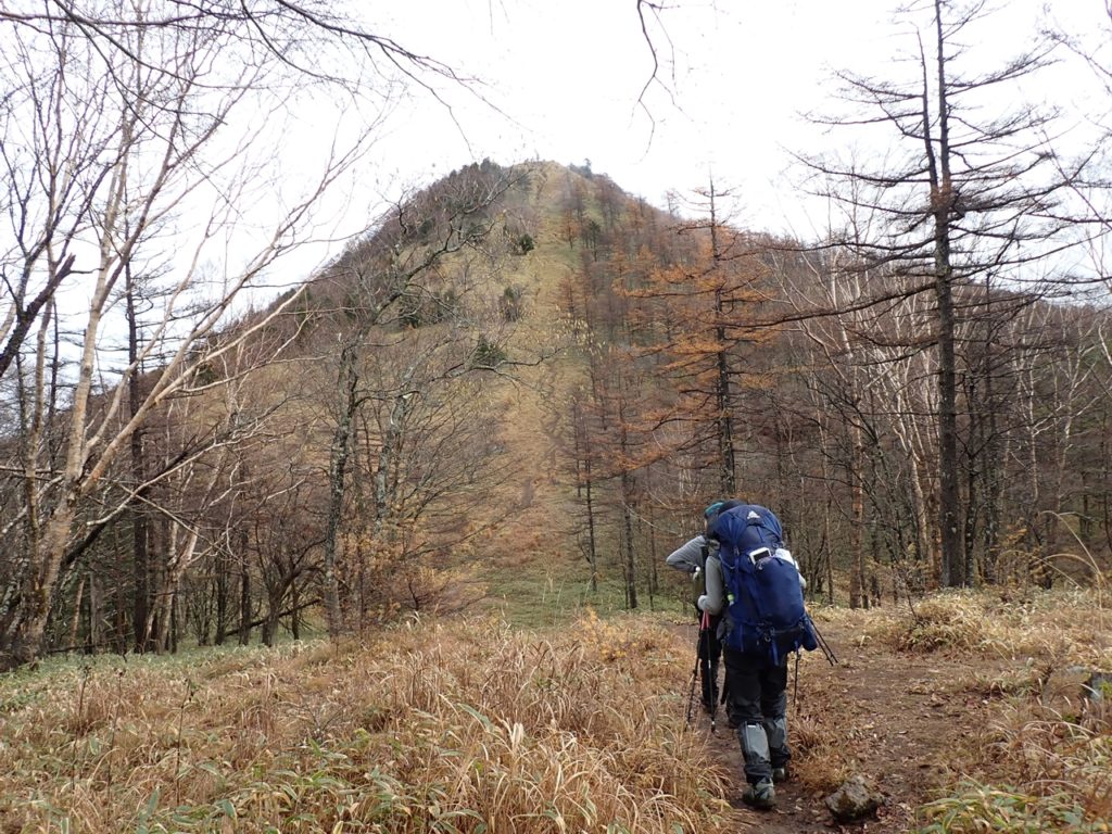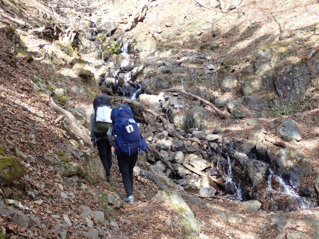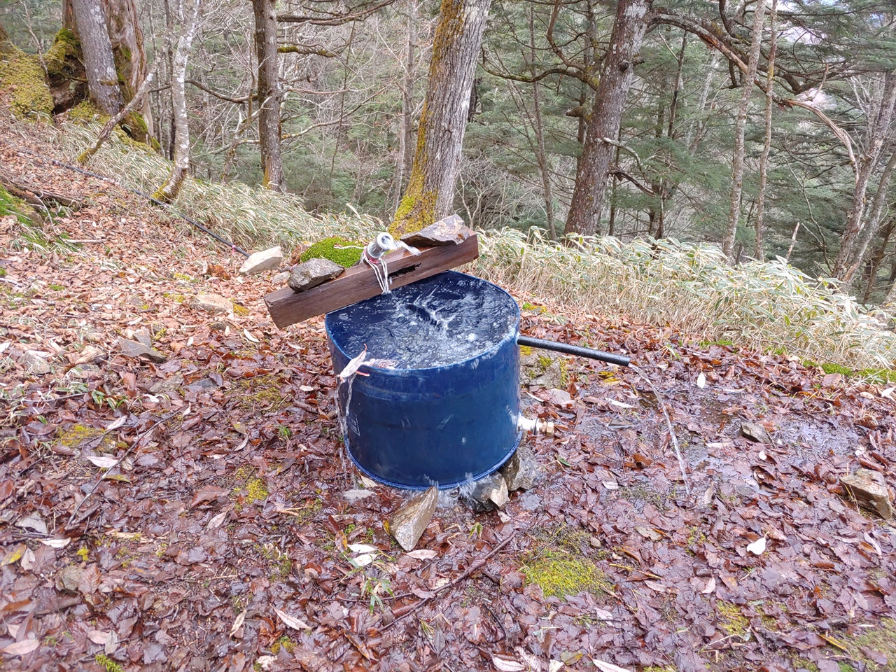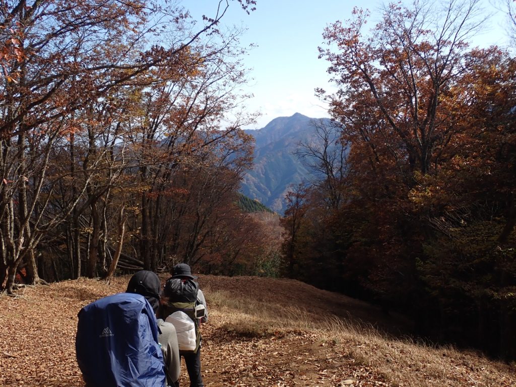 山側の駐車場には工事車両がいっぱい停まっていたが、快く通過させてくれた。林道に入るには「関係者以外立入禁止」の掲示があるゲートがあるが、「雁坂峠登山道」の看板もあり、左側をすり抜けて林道に入ることができた。道の駅みとみから歩き始めるより30分程短縮できるのでありがたい。落葉の積もる林道を1時間弱歩くと林道は終わる。小休止。そこから登山道が始まる。道は峠沢の左岸を進む。クッキリ沢を渡ったところで小休止。その先で右岸への渡渉場所が分かりづらいが、水量が少ないので問題なく渡ることができた。渡った先で登山道の崩落がある。ザックが重いので悪場の通過には気を使う。井戸沢を渡ると一気に斜度が増してジグザグに高度を上げていく。