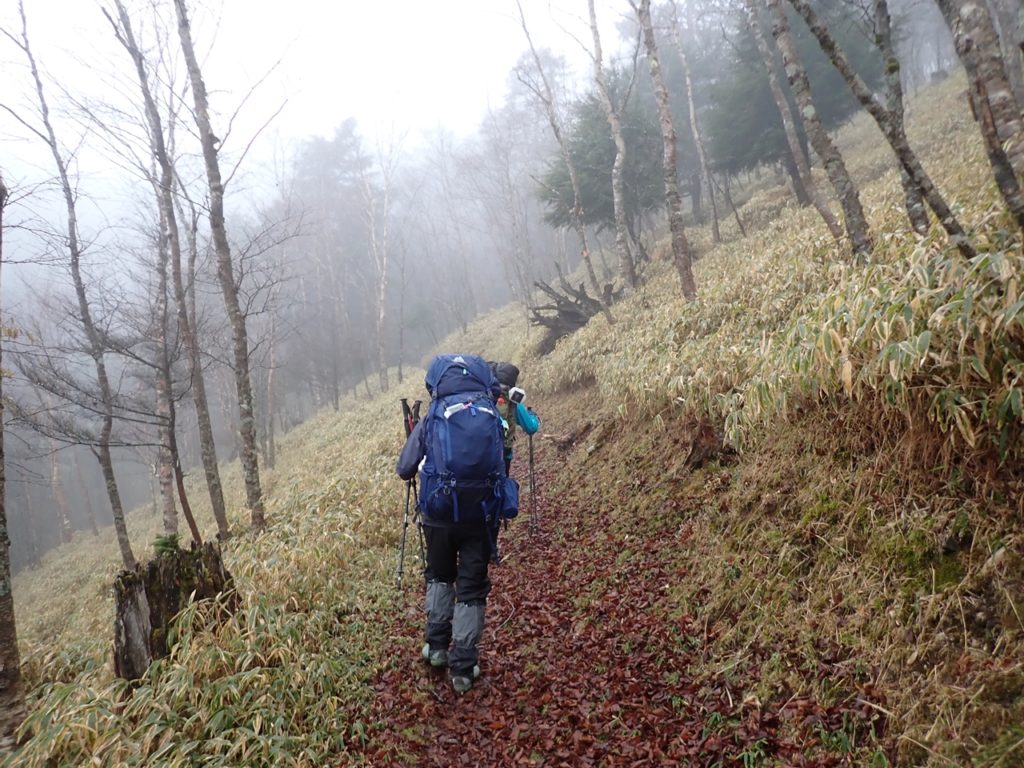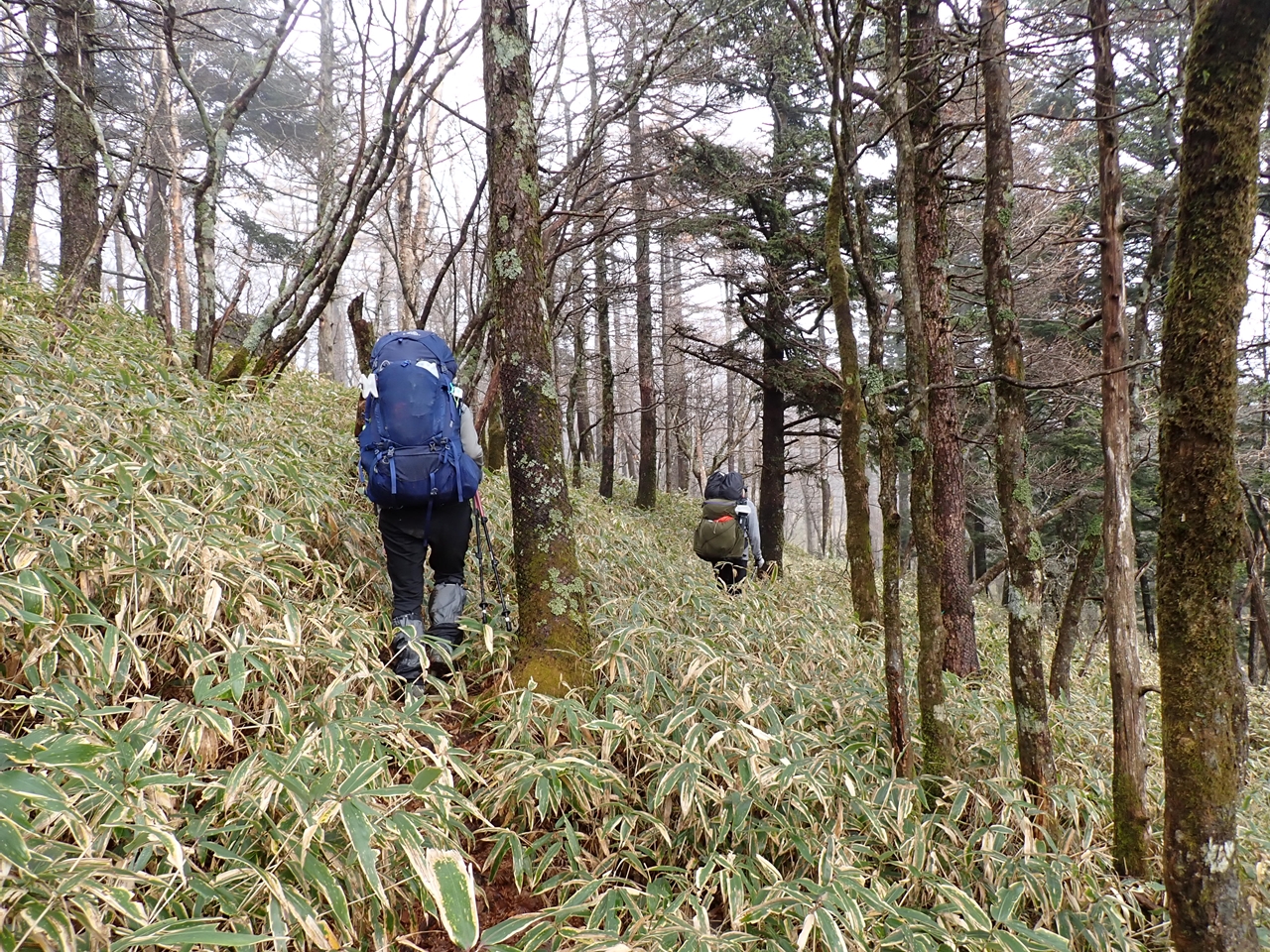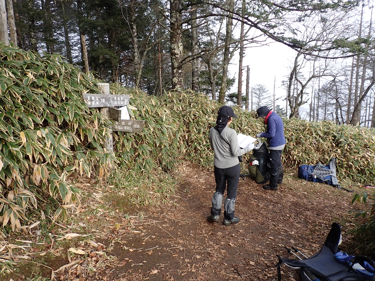 唐松尾山の下りで西御殿岩へ立ち寄る予定だったが、ガスが出てきて展望が期待できないのでやめた。山の神土まで下りて小休止。そこから和名倉山へ向かうルートがあるらしいがその入口は笹で覆われていた。そこに踏み入るのは勇気が必要だろう。笹原の広い登山道を下って将監峠に着いた。そこから小屋まではすぐだった。