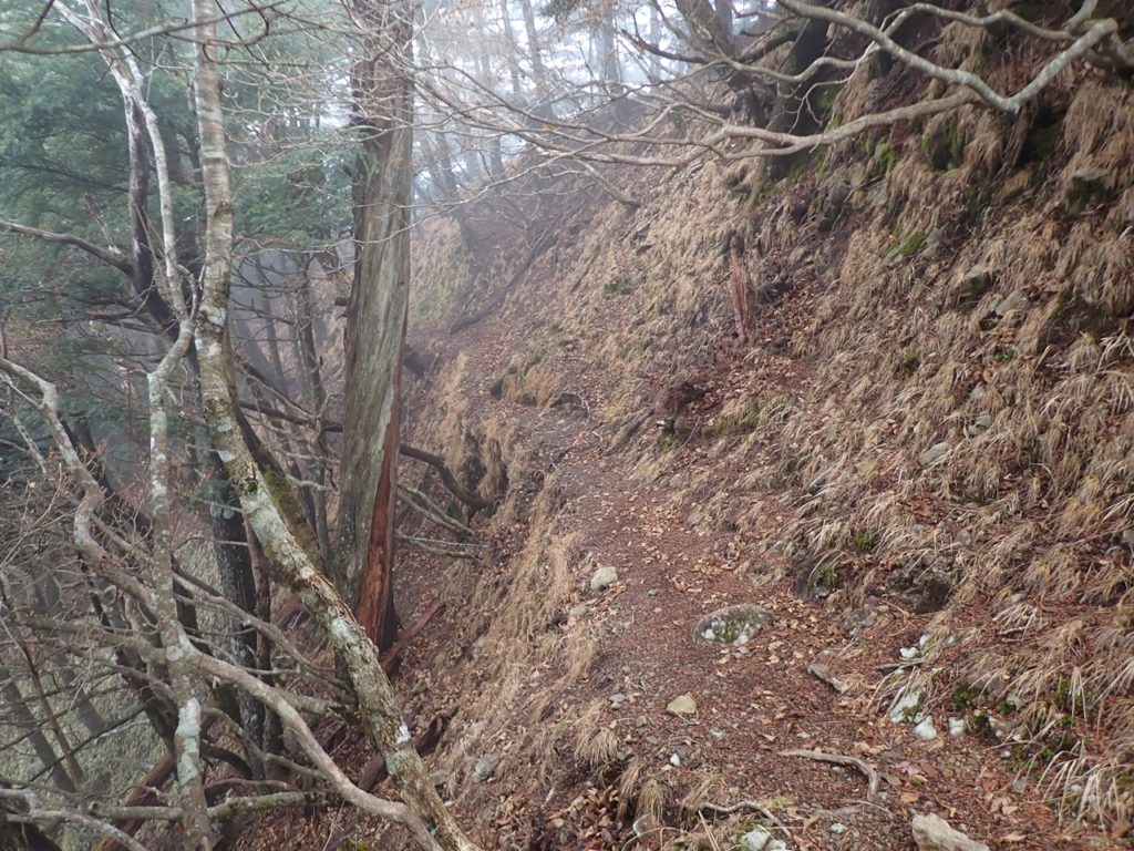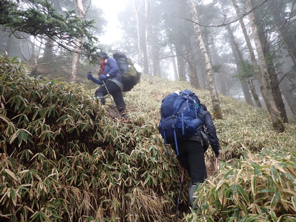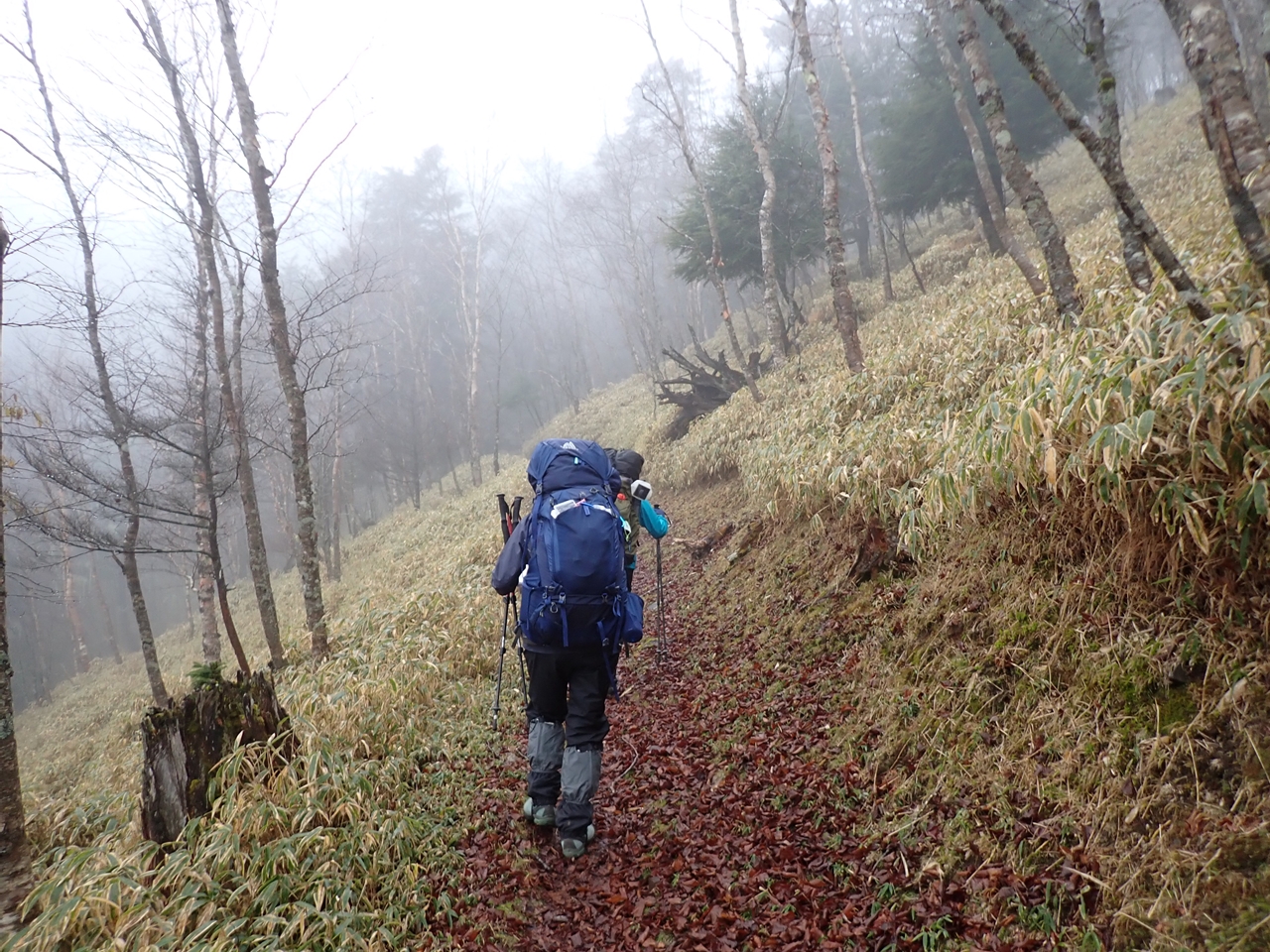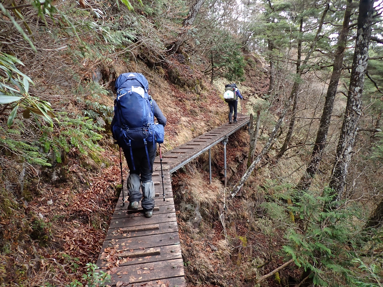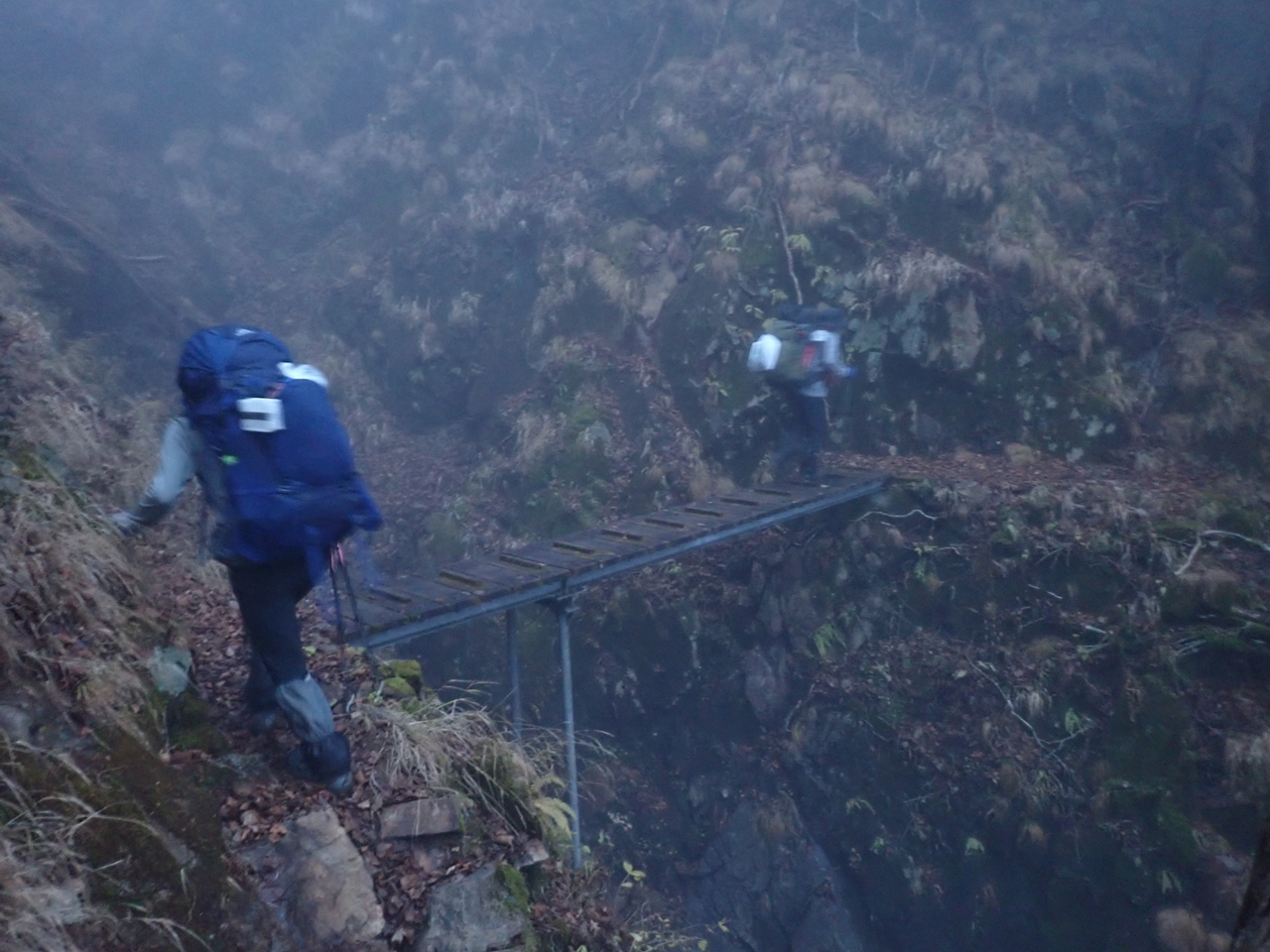 朝3:30に起床して出発準備。5時過ぎに出発。久しぶりのヘッドランプを点けての山行となった。霧と濡れた笹でウエアが濡れる。6時を過ぎてやっとランプを消すことができた。コースは丈の低い笹の急傾斜面につけられたトラバース道だ。笹に隠れているが所々に「抜けた」箇所があり、そのような箇所を「与太郎」というのを初めて聞いた。そのような場所は姿勢を低くして笹を掴んで通過した。右に転落するとどこまで落ちるか分からない。また濡れた岩の段差も小刻みに登場した。極めつけは木橋で、霧で濡れた橋桁は滑りそうで実に怖かった。最初に登場したのが大常木山西の小谷に架けられた橋だ。その後いくつも登場したが最初のものが一番高度感があった。そこを渡るときにストックのキャップを桁の間に引っ掛けてしまった。取られたという感覚はあったが、じっくりと見ることも、まして振り返って取り出すこともできなかった。ひたすら滑らないように、無駄な動きは排除して、ソ~と前進するのみだった。大常木山南東のガレ場からは富士山を眺めることができた。山頂部は冠雪していた。手前の大菩薩嶺には雲が掛かっていた。その先は「大ダル」で少し気の休まる登山道だった。「岩清水」はポタポタと雫が落ちている程度だった。禿岩で小休止。その先の分岐を飛龍山へ登る。シャクナゲの多い尾根を20分程登ると薄霧の中に山頂標識が見えてきた。東へ急な斜面を下って登山道に復帰した。そこからも崖に架けられた木橋をいくつも渡った。滑り止めの板が取れている場所もある。北天のタルに到着して小休止。ガスが山を覆い、展望は悪い。その先もトラバースは続き、崖の木橋も登場した。狼平は緩やかな幅広の笹尾根でホッとできる場所だ。三条ダルミで小休止。そこから雲取への急な登りが続く。体にはきついが、気の休まらないトラバース道よりずっと気楽だ。40分頑張って雲取山に着いた。霧に包まれた山頂は人が少なかった。記念撮影を済ませて早々に避難小屋へ下りる。一時悪評のでていた小屋前のトイレはきれいになっていた。小屋で大休止。最初は入口前の椅子で休んでいたが、風が出てきて寒くなったので中に入る。土間で数人休んでいた。湯を沸かしてカップ麺やレギュラーコーヒーを楽しんでいる。我々は変わらぬ行動食だ。背の高いトレラン姿の女性が入ってきた。スタイルのよさに見惚れていたが、残念なことに、少し行動食を口にすると早々と出て行ってしまった。