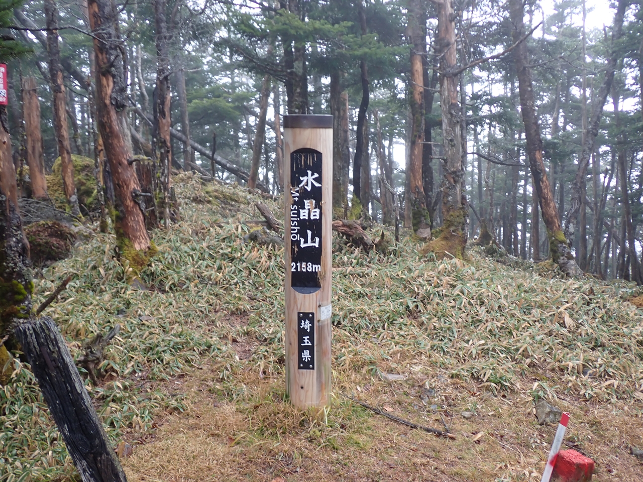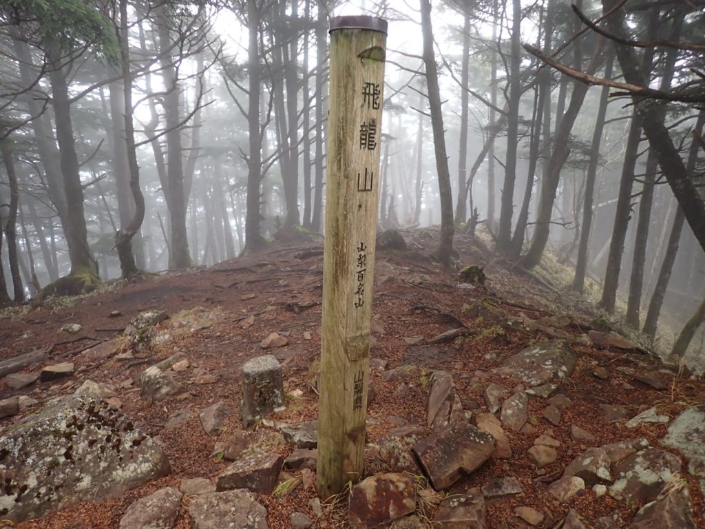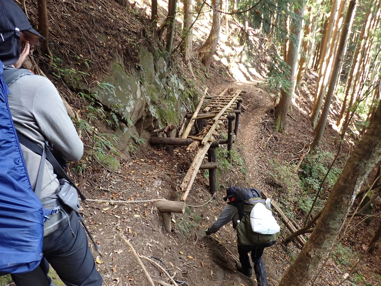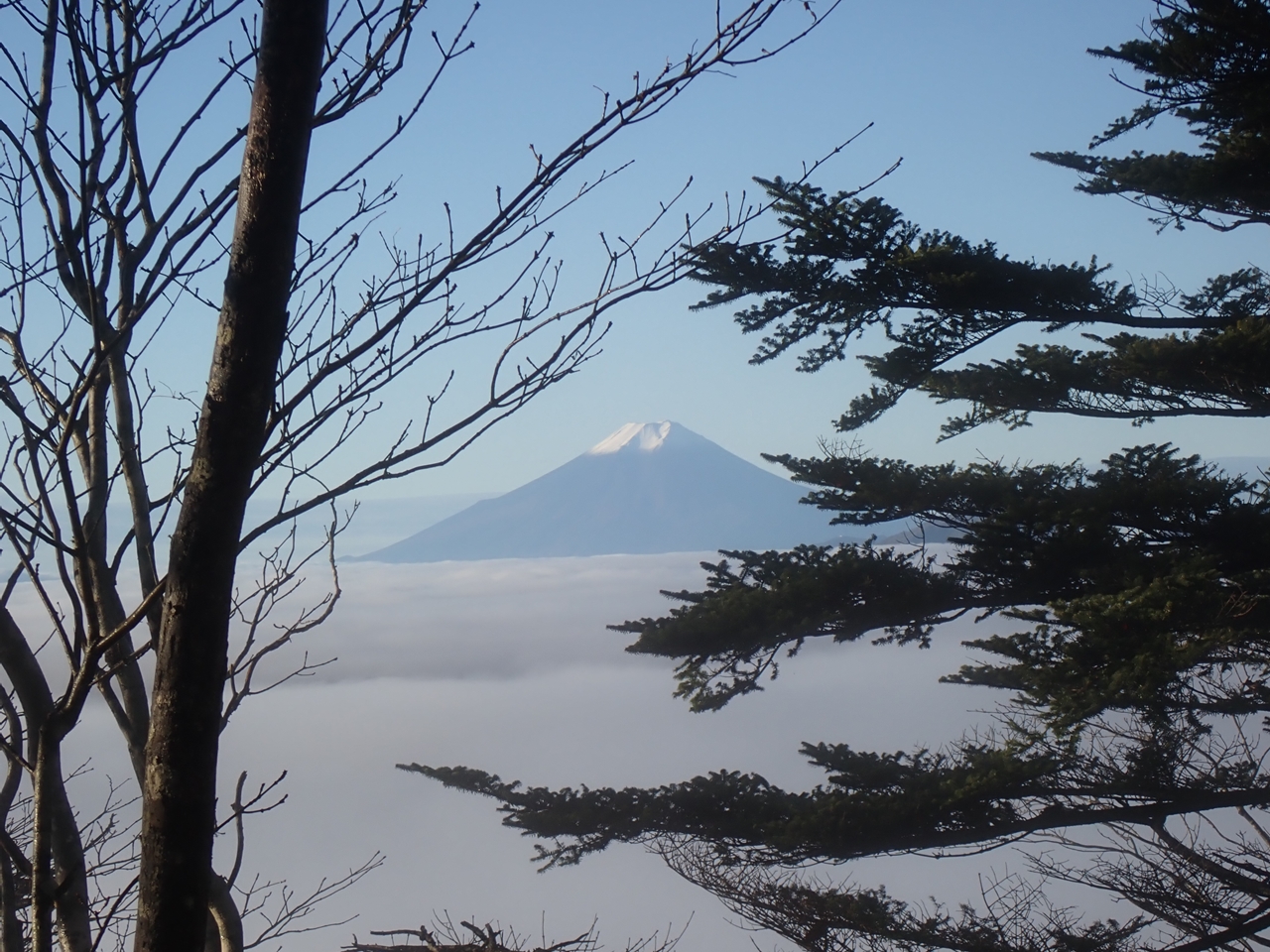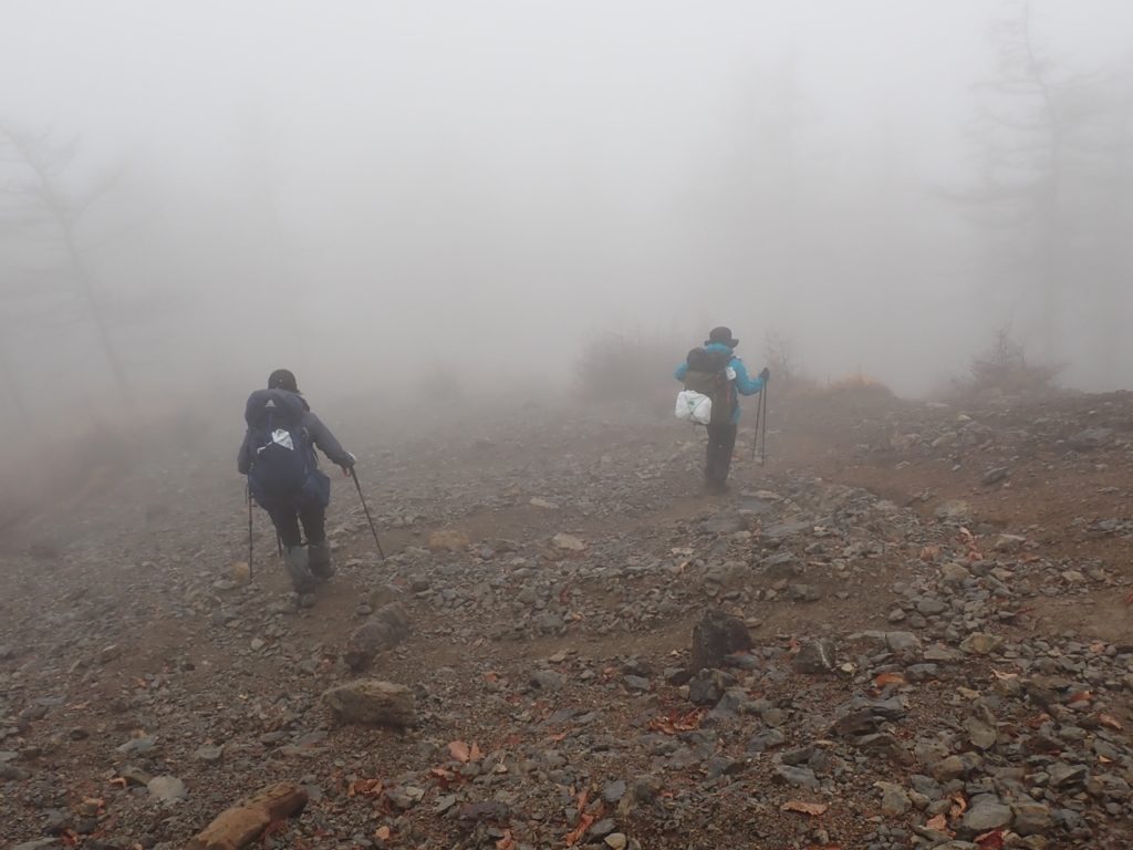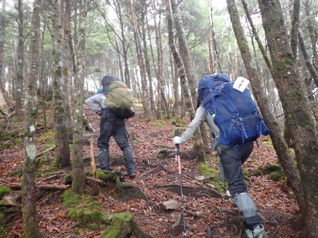 朝3:30に起床して出発準備。5時過ぎに出発。久しぶりのヘッドランプを点けての山行となった。霧と濡れた笹でウエアが濡れる。6時を過ぎてやっとランプを消すことができた。コースは丈の低い笹の急傾斜面につけられたトラバース道だ。笹に隠れているが所々に「抜けた」箇所があり、そのような箇所を「与太郎」というのを初めて聞いた。そのような場所は姿勢を低くして笹を掴んで通過した。右に転落するとどこまで落ちるか分からない。また濡れた岩の段差も小刻みに登場した。極めつけは木橋で、霧で濡れた橋桁は滑りそうで実に怖かった。最初に登場したのが大常木山西の小谷に架けられた橋だ。その後いくつも登場したが最初のものが一番高度感があった。そこを渡るときにストックのキャップを桁の間に引っ掛けてしまった。取られたという感覚はあったが、じっくりと見ることも、まして振り返って取り出すこともできなかった。ひたすら滑らないように、無駄な動きは排除して、ソ~と前進するのみだった。大常木山南東のガレ場からは富士山を眺めることができた。山頂部は冠雪していた。手前の大菩薩嶺には雲が掛かっていた。その先は「大ダル」で少し気の休まる登山道だった。「岩清水」はポタポタと雫が落ちている程度だった。禿岩で小休止。その先の分岐を飛龍山へ登る。シャクナゲの多い尾根を20分程登ると薄霧の中に山頂標識が見えてきた。東へ急な斜面を下って登山道に復帰した。そこからも崖に架けられた木橋をいくつも渡った。滑り止めの板が取れている場所もある。北天のタルに到着して小休止。ガスが山を覆い、展望は悪い。その先もトラバースは続き、崖の木橋も登場した。狼平は緩やかな幅広の笹尾根でホッとできる場所だ。三条ダルミで小休止。そこから雲取への急な登りが続く。体にはきついが、気の休まらないトラバース道よりずっと気楽だ。40分頑張って雲取山に着いた。霧に包まれた山頂は人が少なかった。記念撮影を済ませて早々に避難小屋へ下りる。一時悪評のでていた小屋前のトイレはきれいになっていた。小屋で大休止。最初は入口前の椅子で休んでいたが、風が出てきて寒くなったので中に入る。土間で数人休んでいた。湯を沸かしてカップ麺やレギュラーコーヒーを楽しんでいる。我々は変わらぬ行動食だ。背の高いトレラン姿の女性が入ってきた。スタイルのよさに見惚れていたが、残念なことに、少し行動食を口にすると早々と出て行ってしまった。