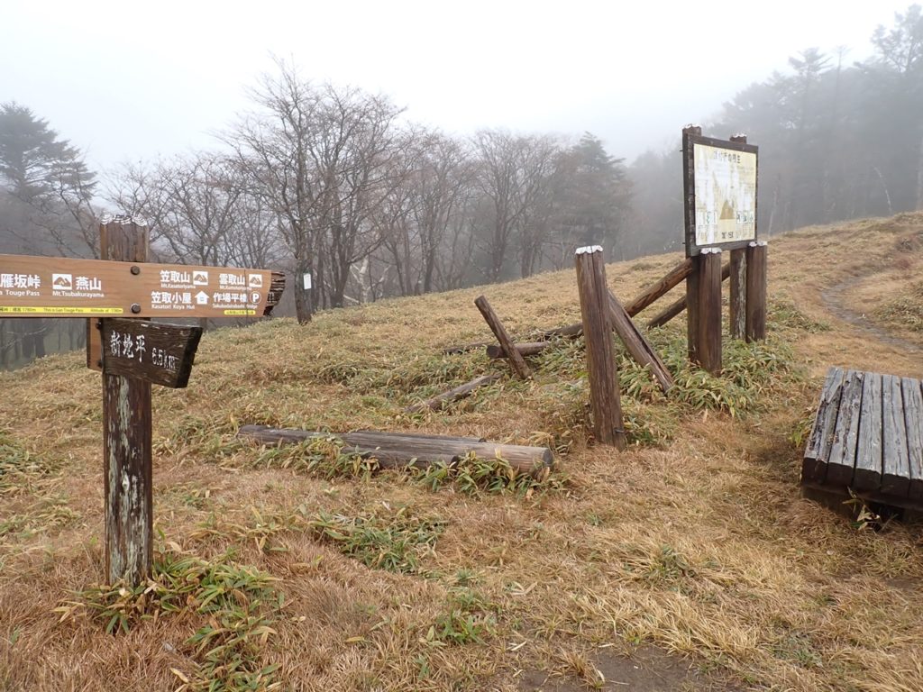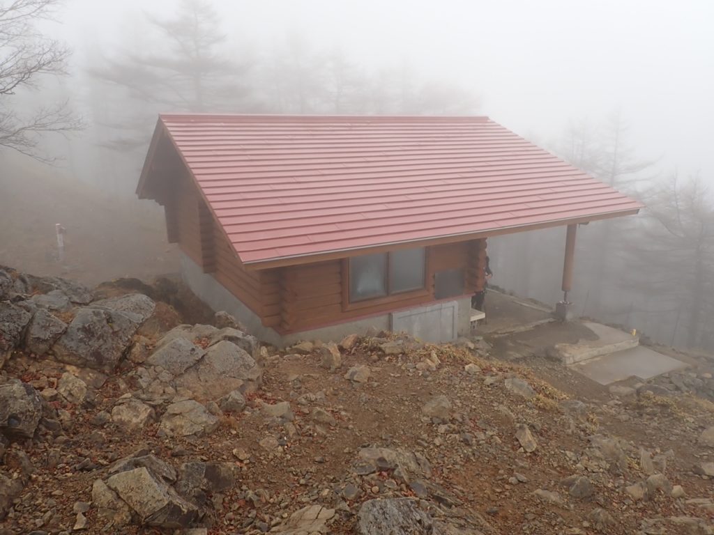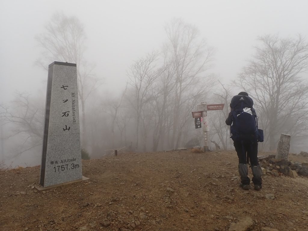 霧雨になって来たので雨具を着て下り始めた。奥多摩小屋跡には新しい野営場が整備中だった。工期は来春までとなっていた。七ツ石山へ登ると雲取山と同じ立派な山頂標識があった。山頂下の七ツ石神社は将門伝説があるらしい。説明板があったが読む気力はなかった。