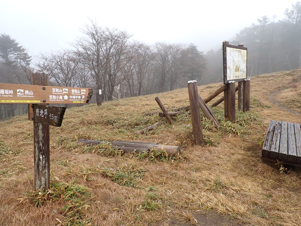 雁坂峠に到着。ガスに包まれて展望はなし。小屋へ下った。