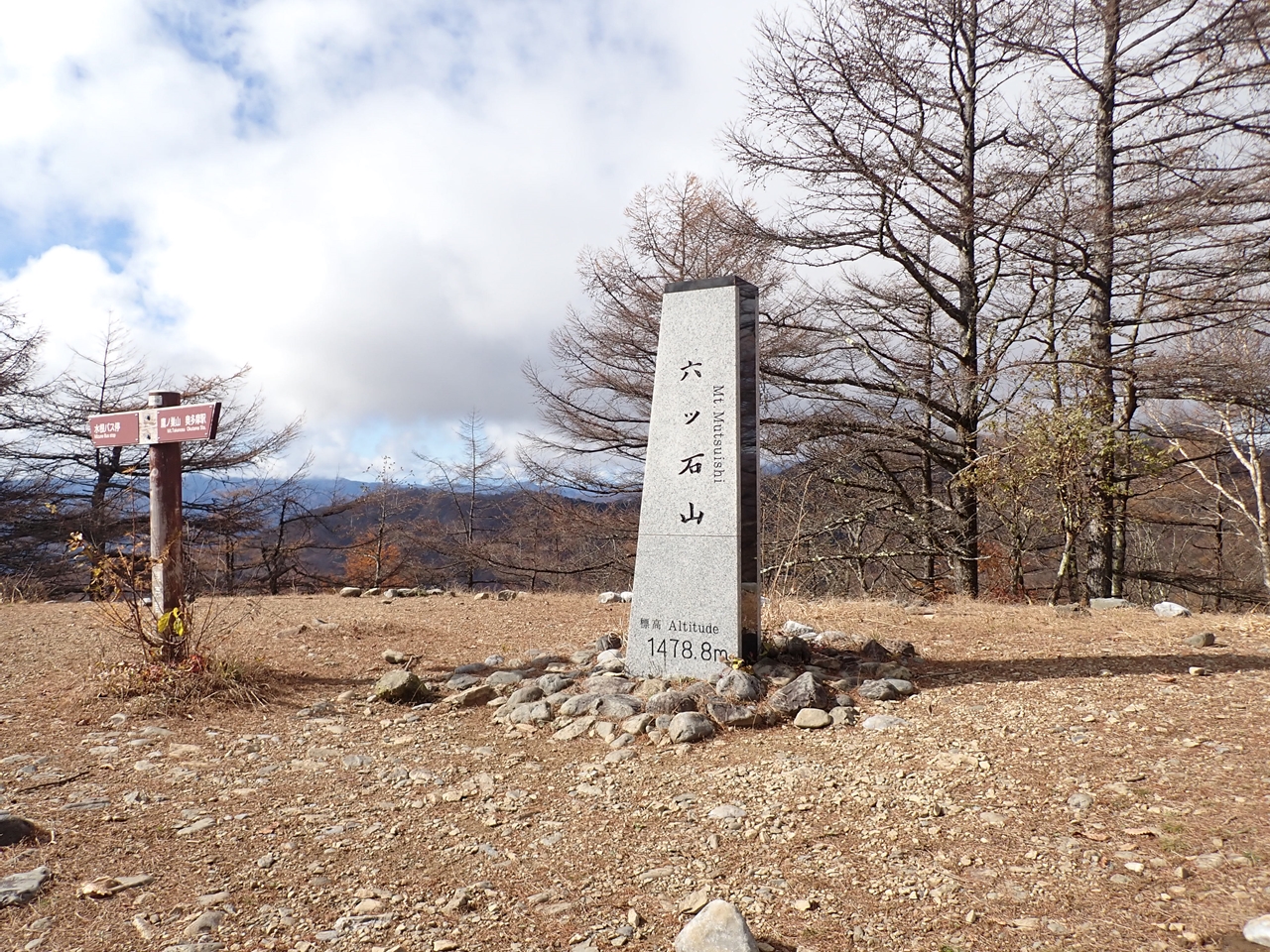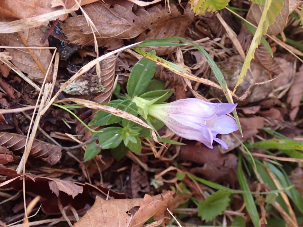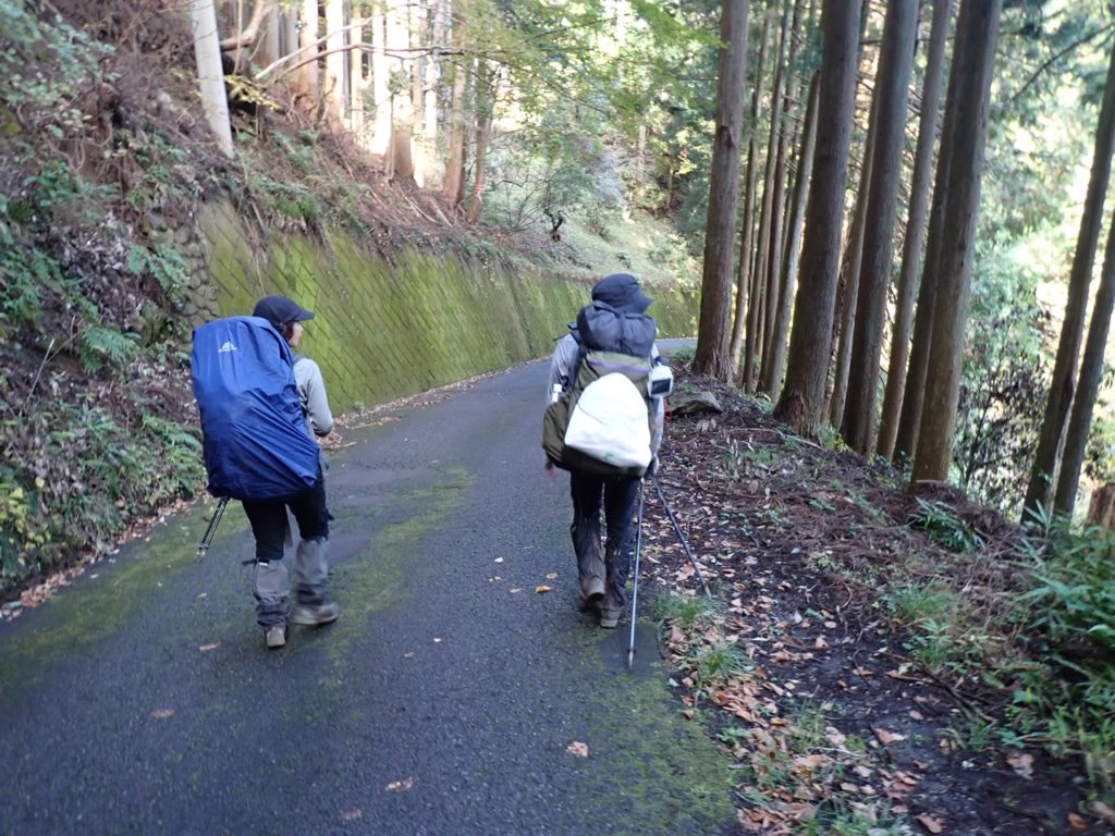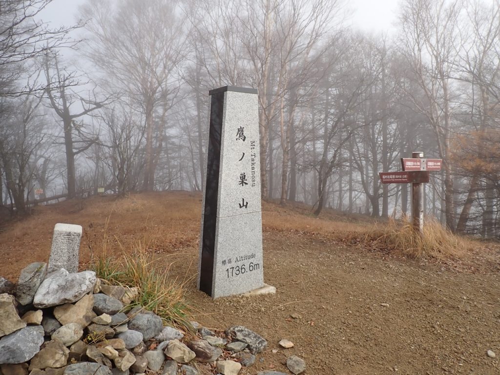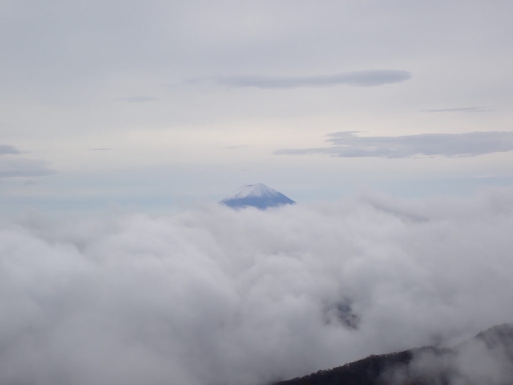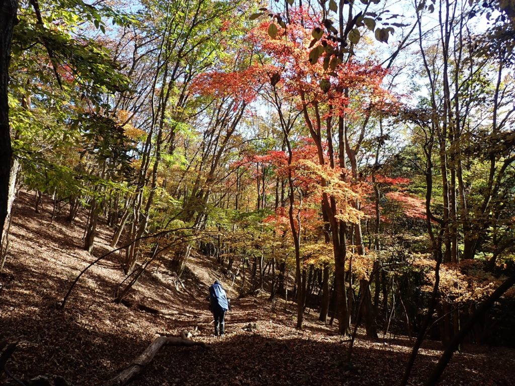 千本ツツジの分岐で、トラバース道を進むより、できるだけ尾根を歩いたほうが縦走に相応しいだろうということになり、千本ツツジへ登った。ピークには小さな標識があるだけだった。そこから起伏の緩やかな尾根を下って行った。高丸山の手前で青空が見えてきて、山頂からは雲海に浮かぶ富士山が綺麗に見えた。今日はその右に大菩薩嶺も見ることができた。落葉の急斜面を下り、ゆっくりと登り返すと日蔭名栗山だった。緩斜面の尾根を下って鷹ノ巣避難小屋に到着。小屋に入って小休止。綺麗に整理された小屋だった。トイレもまずまず。鷹ノ巣山にも立派な山頂標識があったが、ガスに包まれて眺望はなし。さらに下って水根山までくると少しガスが取れてきた。落葉後の楽しい尾根下りとなった。南に奥多摩湖が輝いているのが見えた。城山からの下りは急傾斜だったが、将門馬場周辺は名前のとおり平地のような広い尾根だった。立派な山頂標識の六ツ石で小休止。1452mピークは狩倉山というらしいが踏み跡は薄かった。標高1300m辺りは防火帯になっているのか広く伐採されていて、その真ん中が登山道になっている。丁度正面にユニークな形の大岳山が見える。少し立ち位置をずらすと右に御前山が聳えていた。登山道を外れて三ノ木戸山に寄ることにした。すぐリンドウの花がいくつか咲いていた。丈が10センチぐらいの低い花だ。三ノ木戸山の山頂は広く、大学の演習林になっているらしく、屋根だけの小屋もあった。その山頂からは北に延びる小さな尾根を下って登山道に復帰した。その先の植林地内の登山道は深く掘られていて段差の大きい箇所もあり、濡れた斜面は大いに滑りそうだった。申し訳ないがその脇の植林地を歩かせてもらった。標高1000m以下になると紅葉が見頃だった。稲荷神社の手前には壊れた木橋があり、ロープを掴んで橋の袂に降りて進んだ。稲荷神社は赤い鳥居が倒れていた。ジグザグに下って舗装された林道に下りてきた。人家が見えてくると標識がありショートカットを案内してくれた。羽黒三田神社脇に降りてきた。