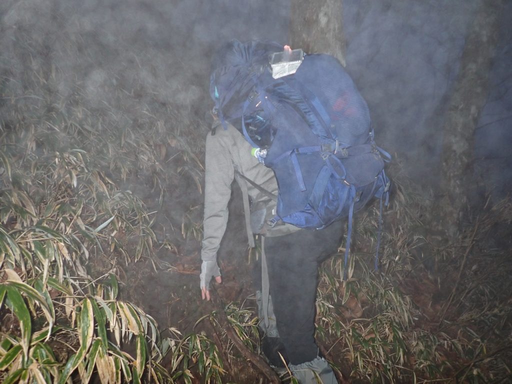 霧雨のなか、ヘッドランプを点けて歩き始めた。尾根に出たころには明るくなった。