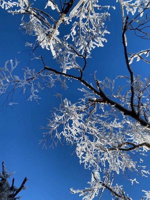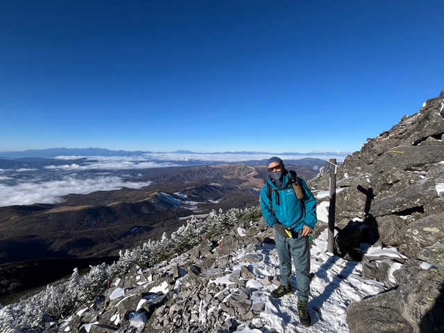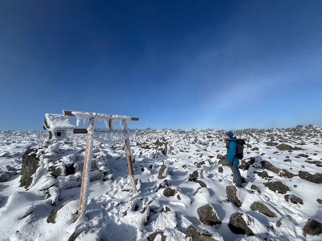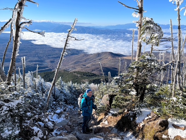 小山を3時30分に出発し、6時15分にはすずらん峠駐車場に到着。2台ほどしか停まっていない。何しろここまでのヴィーナスラインや他の道も日陰は雪があり凍結しているので、スタッドレスタイヤなしでは不可能な場所なので、登山者が減るのは道理であった。トイレを済ませて登山開始、雪がついているが急な上りではないので、そのまま何もつけずに進んでゆきしばらくゆくとひらけて見えるところに出た。雲海が広がって幻想的であった。右奥には御嶽山も望めた。しばらくゆくと急登となり大きな岩を跨ぐようになってきた。角度が急なため、チェーンスパイクを装着。雲ひとつないブルーで、連れは2回ここにきているがいずれもガスであの広い山頂を知らないとのこと。それほど爆風でもなく、もはやどこが登山道かわからない岩の間を、踏み跡を辿って頂上到着。広い。僕もここまでくっきりと周りが見渡せる山頂は、山岳会で行った10年位前の市民ハイク以来だ。奥宮でお祈りしてモンベル寄贈の円柱に行き山座同定する。ヒュッテに戻り食事休憩したのち、下り。滑りそうでチェーンスパイクなしには無理であった。亀甲池までゆき、北横岳への登り。日陰で寒い上に展望がない樹林帯。連れのペースについて行けなくなり、ゆっくりとなった。右足をチェーンスパークで下る時、捻ったのがその頃になって痛くなってきたのと、やはり体力不足か。ようやく北横岳北峰到着すると一気に視界はひらけて蓼科山も含めて360度のパノラマであった。樹氷が美しい。風が強かったので、南峰へ向かった。ここも広い。登山者はこれまでにも数人しかすれ違っておらず、有名な山なのに、やはりスタッドレスなしだと減るのかと考えた。木道を降りて行き、ロープウエイの下を進んでゆくと、スキー場の人口降雪機など冬支度が始まっていた。駐車場に着くと1日2本しかない午後のアルピコのバスがちょうど10分前でいるではないですか。ラッキーとばかりに一番下ったところまでバスを使い、そこからは車道歩きを高度差200mで4キロ歩きすずらん峠に戻った。帰りもアイスバーンに気をつけながら帰宅した。