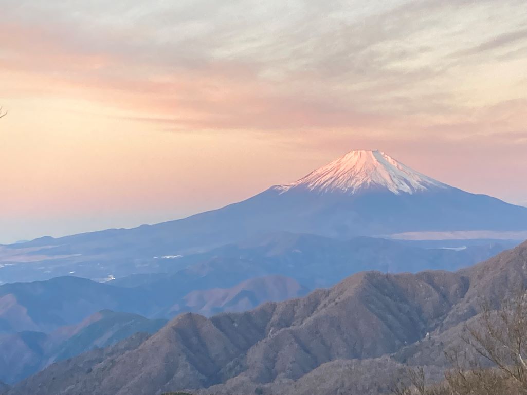 <詳細報告>12月5、6日で丹沢山に登ってきました。丹沢山系は今回、行くのは初めてです。大倉登山口の駐車場に7:30に到着したが駐車場の開門は8:00と掲示があった。時間まで付近で待機していると駐車場の管理人が来たので8時開門ですよねと確認したところ、「7:55には開けるよ」とのこと。時間もあったので管理人と雑談。最近は、ゲートの直前まで勝手に入る人がいるので困るとの事。私は、これから丹沢山に登って明日降りてくると話をすると、ここの駐車場は当日にしてほしいとのこと、泊まりなら隣のどんぐり荘がいいとアドバイスをいただき、管理人と一緒にどんぐり荘に行く。どんぐり荘は、1日400円で800円支払い車を停めさせてもらう。どんぐり荘の管理人の話ではポストに車のNoを書いた紙とお金を入れてくればば停めていいとのことでした。今回、大倉尾根から登山を開始し、途中に山の神社があったので安全祈願をする。大倉尾根は、ばか尾根と呼ばれるところでキツイところかと思っていたが、階段の途中途中に平な道があるのでそれほどでもないように感じたが、階段ばかりが続くので、また階段かと嫌になる。この日は、天気は晴れていたがガスガスで視界があまり良くなく待望の富士山も見えずじまい。余計に単調に感じられた。このルートは登山道が整備されているのでトレーニングには最適なコースだと思った。塔ノ岳に到着すると、平日にもかかわらず沢山の人が休んでいる。塔ノ岳で日帰りする人が多いと思った。塔ノ岳から丹沢山までは若干のアップダウンを繰り返し丹沢山に到着。丹沢山に着いても富士山は雲の中。次の日に期待し山荘に宿泊する。山荘は12名程度の宿泊者がいた。6日は、朝から快晴。日の出を山頂を待つ日の出は6:38で6:50頃、富士山がピンクに染まり始めた。富士山を堪能してから鍋割山に向かう。鍋割山は鍋焼きうどんで有名だが6日の金曜日は休みとのこと。なべ焼きうどんは残念だが空いている時に鍋割山にいけると思い鍋割山に向かう。鍋割山に到着すると管理人がおり、今日は休みですよねと聞くと11時から小屋は開くとのこと。鍋焼きうどんの提供はないが小屋の運営はしているようである。鍋割山からは後沢乗越で下山。鍋割山登山口には、ペットボトルに入った水が大量においてあり水の運搬に協力してほしい趣旨を書いた掲示板があった。ここからの林道歩きは、距離があったので今回の山行で一番疲れた行程だったかも知れない。なかなか林道が終わらない。今回の山行は富士山を見ることができ良い山行となりました。