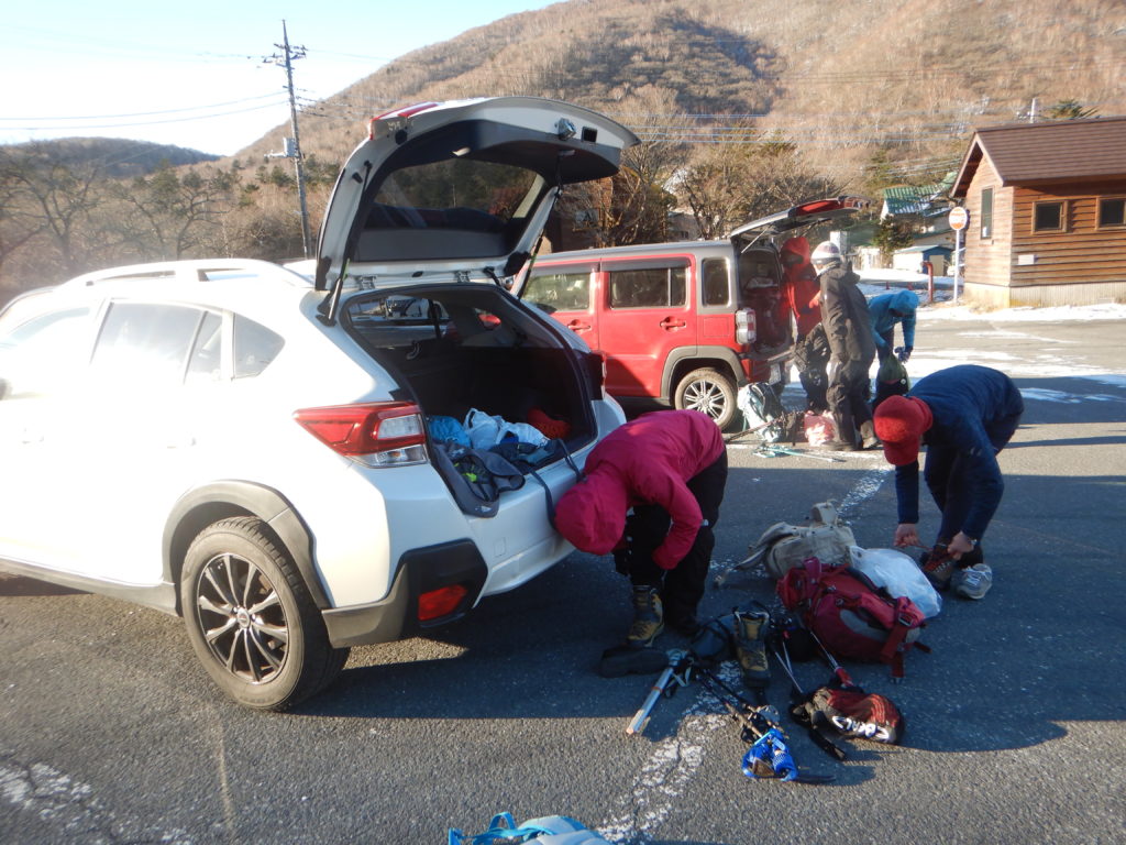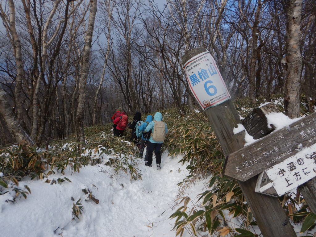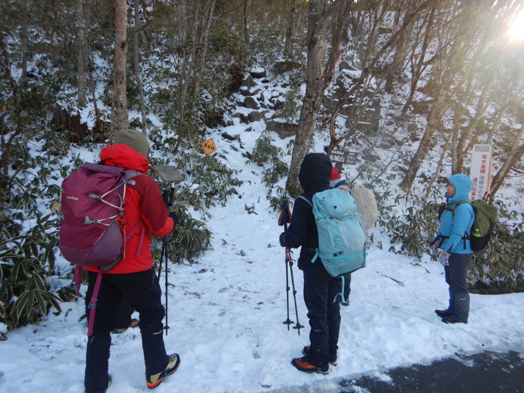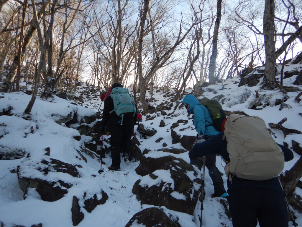 朝 駐車場から降りると、冷たい強風で迎えられました。身体が冷えないうちに、慌てて準備を整えて出発。登山口までの舗装道路はあちこち凍結状態でした。黒檜山登山道は雪でうっすら白くなっていいましたが、しっかり圧雪されているため、アイゼン類は装着せずに登りました。強風は樹林帯の中では多少緩和されたのですが、1時間ほど登ったあたりからは樹林帯の恩恵もいただけず、頭にはニット帽とヤッケの風防で対処しながら進みました。