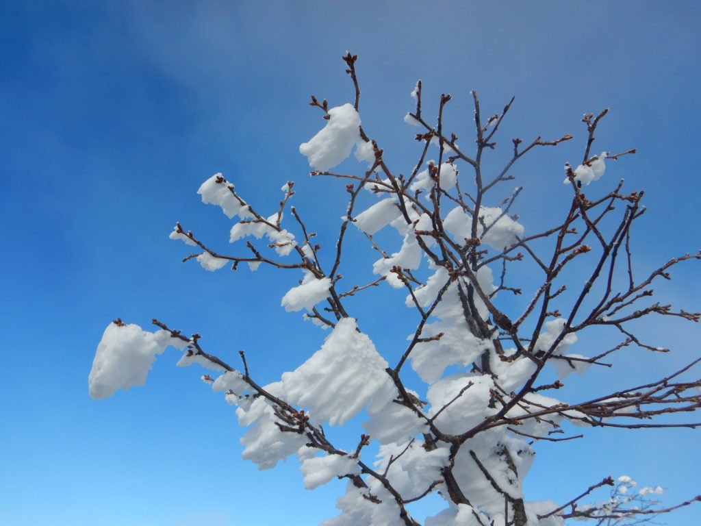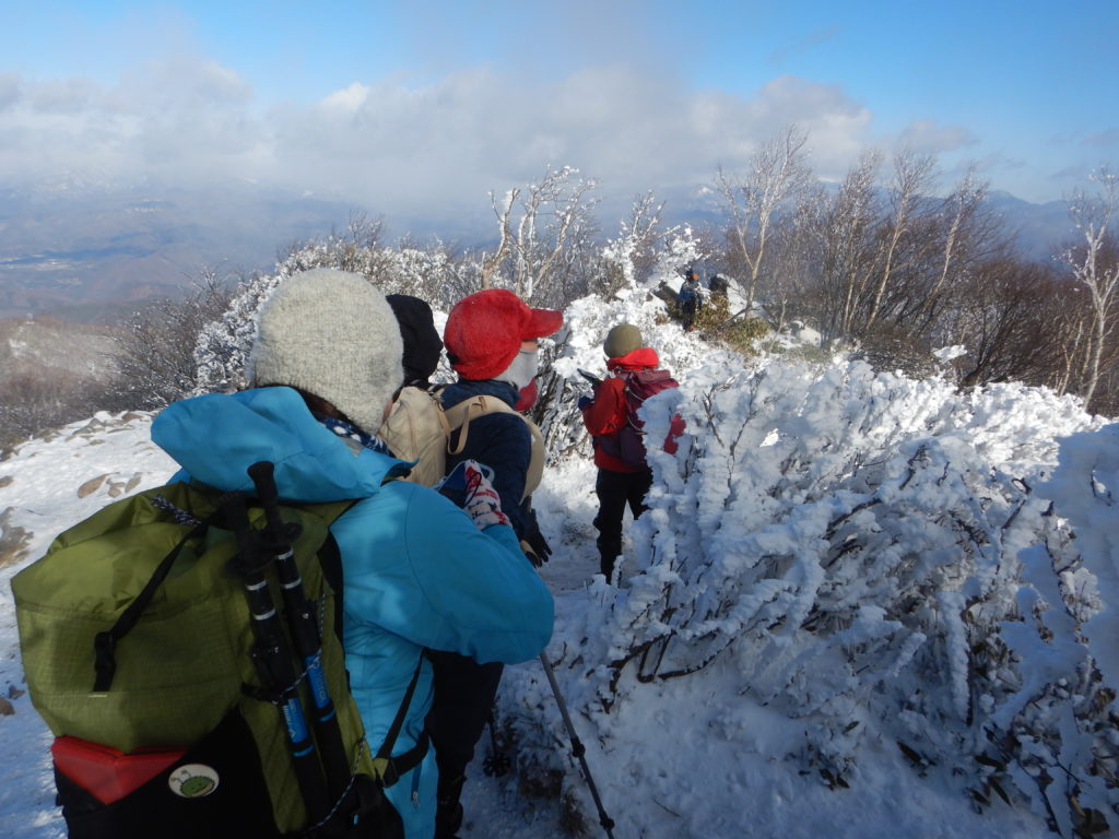 出発から2時間ほどで黒檜山山頂に到着、強風のため、記念写真もそこそこに展望台まで移動しました。途中の低い枝には至る所に昨晩できたと思われる「エビの尻尾」ができていて、思わずシャッターを切りました。展望台からは遠くの谷川や日光方面の山々を望むことができました。ここからアイゼン類を装着し、黒檜山頂まで戻り、風の弱そうなところで大休止。暖かそうなカップ麺(ワタシは暖かいお茶のみ)を頬張る姿を横目にレーションで空腹を満たしました。