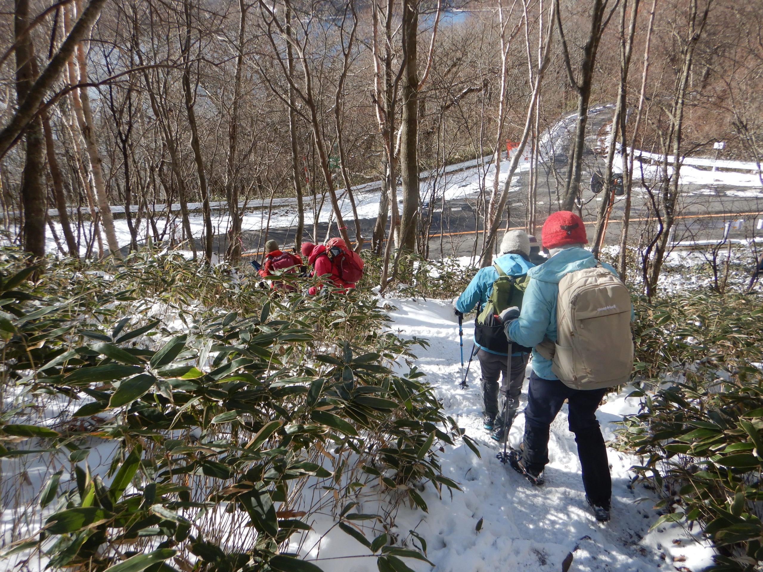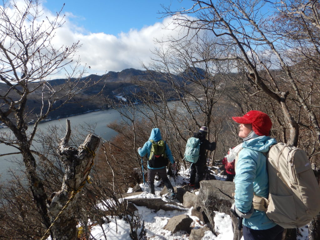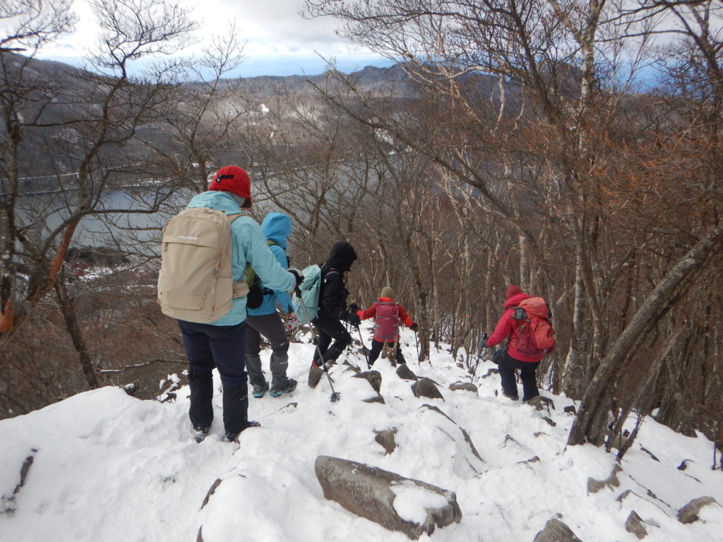 そして、このあとの行動をメンバーと話し合った結果、メンバーのほとんどが装着のチェーンスパイクでは、駒ヶ岳の周回は難しいと判断して、下山道を駒ヶ岳から、朝登ってきた黒檜山登山道を戻ることにしました。下山は登り+2時間かかった道を下りは1時間で下山。途中多くの登山者とすれ違いましたが、その中の1名は手袋を持ってこなかったらしく、寒そうにたたずんでいました。きっとこのまま下ったのだろうと思いました。