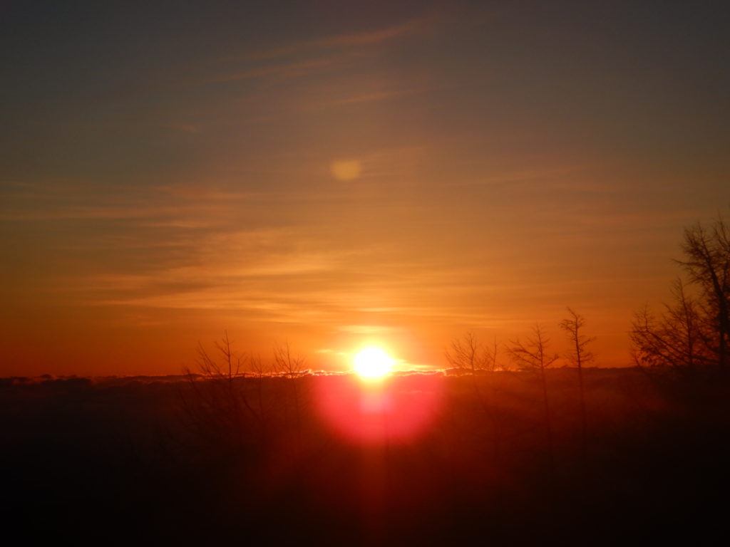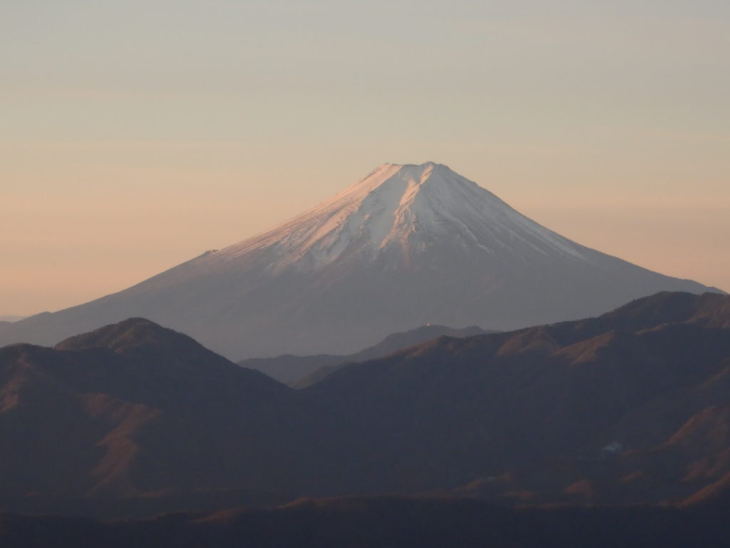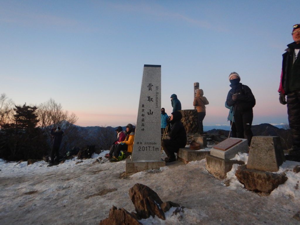 12/30山頂アタック~奥多摩側へ下山 4時に起床予定でしたが、寒くて早く目が覚めました。すぐにコンロに火をつけると一人用テントの中はすぐに暖まりました。しばらくコンロで身体を温めてから、お湯で簡単にできるパスタで朝食を済ませました。7時頃の日の出を雲取山山頂で拝もうと、朝食後テントを撤収。まだ周りが薄暗い中、ヘッドランプの明かりを頼りに歩き出しました。数日前に降った雪が登山道に残っていましたが、持参したチェーンスパイクを装着するほどでもなく、30分ほどで雲取山頂に到着しました。すでに空は日の出前のくらい中に西の空だけ赤く染まっていました。大きい大理石に雲取山と彫られた山頂で日の出と赤く染まった富士山の写真を撮って、身体が冷えないうちに出発。山頂にも多くの登山者かしたがいましたが、すぐ下にある避難所あたりも、早朝なのにたくさんの人で賑わっていました。