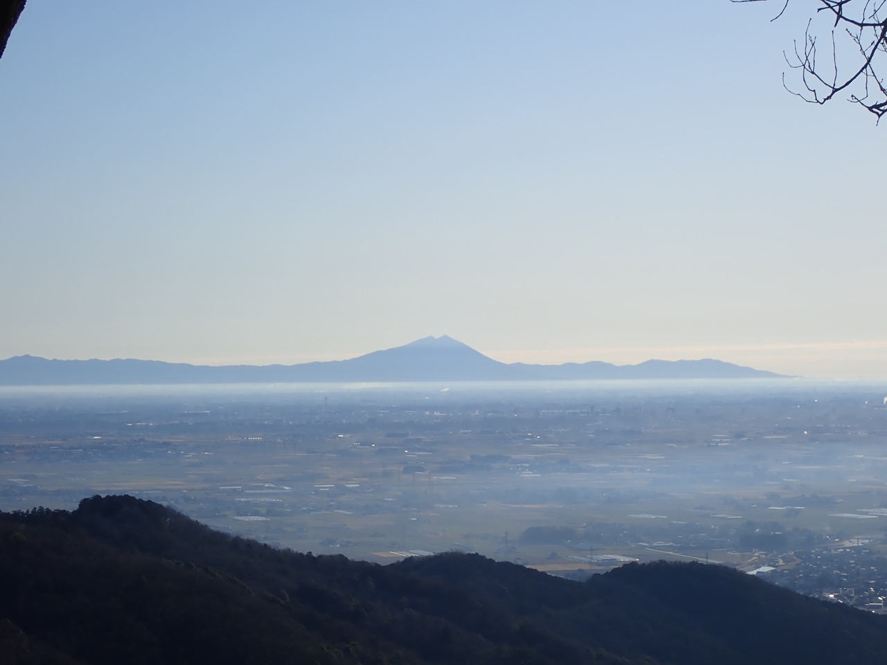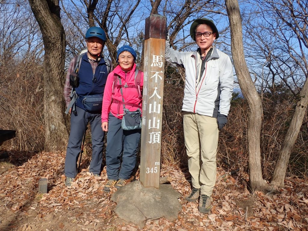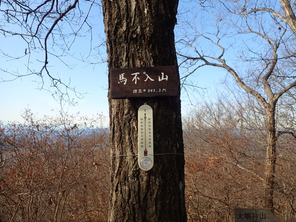 大中寺で合掌して、太平山神社で参拝。太平山神社では少年野球チームがお祓いを受けていた。正月明けでもっと参拝者が多いと思ったが本殿の前には1組の老夫婦しかいない。その横で、世界平和、日本繁栄、家内安全をお願いして最後に私の山行無事を祈願した。12円でそこまでお願いしては神様に「欲張りすぎだ」と叱られるかもしれない。ぐみの木峠の上で日光連山がきれいに見えた。晃石山で温度計を見るとマイナス1度だった。晃石神社から清水寺へ下った。平日だと誰にも会わないことが多いが今日は10人ほどに会った。清水寺展望台から青入山へ登る。ここは急登で、おまけに今の季節は落葉が多いので誠に足元が安定しない。掴まる木が少ない場所にはトラロープがあるので助かる。汗をたっぷりかいて青入山に着いた。ホッと一休み。毎度辟易する階段を桜峠まで下ってから大休止した。自作のおにぎり2個を頬張る。馬不入山に着いて温度を見ると4度になっていた。またエネルギー補給しているとながおかさん、あんまんさんから電話があり馬不入山への途中だという。ゆっくりと休んでいると二人がやってきた。新年のあいさつをして、揃って山頂写真を撮る。