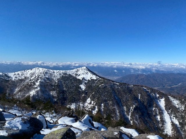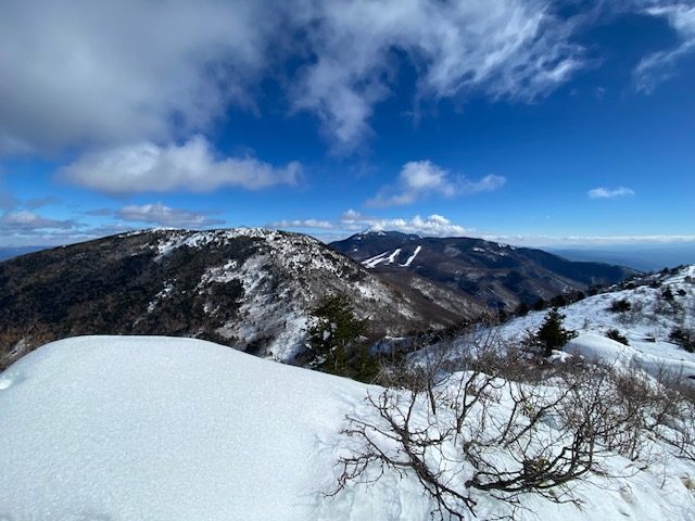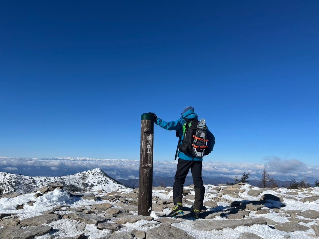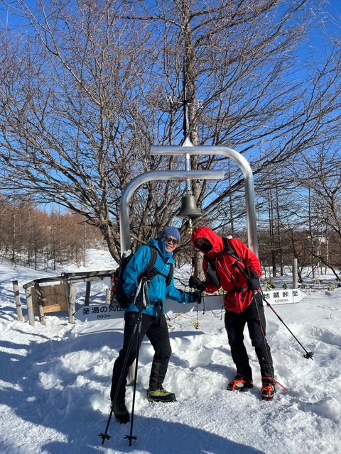 湯ノ丸スキー場前に7時30分頃に到着。まだスキー場はやっていないが、登山目的の車も多くいる様子。もう一台の仲間の到着を待っている間、パンを齧ったりトイレを済ませた。仲間が合流し、いよいよゲレンデ脇(林間コースのはじの方)をアイゼンやチェーンスパイクで登り始めた。圧雪されておりトレースもバッチリなので、終始スノーシューは必要なかった。結構な斜度の斜面を登って行き、鐘のある分岐に到着。⚫️⚫️ちゃんと呼ばれる名物男が今回一緒で、くっついて写真を撮ることが何かと多くなる。鐘のところで一枚ツーショット。そこから九十九折りの登りであるが圧雪されており登りやすい。山スキーのハイカーも多く、シールで登っている。晴れており富士山も見えて皆のモチベーションも上がった。ゆっくりおしゃべりしながら湯ノ丸山到着。ここは何回きても最高の展望。北アルプスが綺麗に見えた。山頂は風が強く、長居はできない。北峰まで足を伸ばし浅間山、四阿山、根子岳を間近に見てそこから烏帽子岳を目指した。一度大きく下って登り返しになるが、ヒップソリを今回も連れが用意しており、連れのJKの娘さんと親子でそり遊びとなった。親子ともども上手に滑った。登りかえしをまたゆっくり進み、小烏帽子岳到着。さらに少しで烏帽子岳到着。ここは不思議と風が弱い。雲が出てきて北アルプスや四阿山は雲の中に。寒くないのでカップラーメンタイムとなった。珍事が起こった。私、⚫️⚫️ちゃん、連れの3人が全く同じ日清特上カップラーメントリュフカレー味でさらに別の二人も全く同じカップラーメンは日清カップラーメンカレー(あっさり味)であった。ポーカーで言えばフルハウス状態で、皆が驚いた。各々ランチを楽しんで、下山開始。下りは他のメンバーもヒップソリに挑戦し、陸上自衛隊のヘリの教官⭕️⭕️ちゃんがべらぼうに滑るのが上手、ナイス体幹であった。そうこうしている間にキャンプ場についてあっという間に駐車場に戻った。温泉にゆく別働隊とは別に我々は直接小山に帰った。JKが一緒なので皆テンション上がっており、7人の大所帯は笑いに包まれた山行となった。