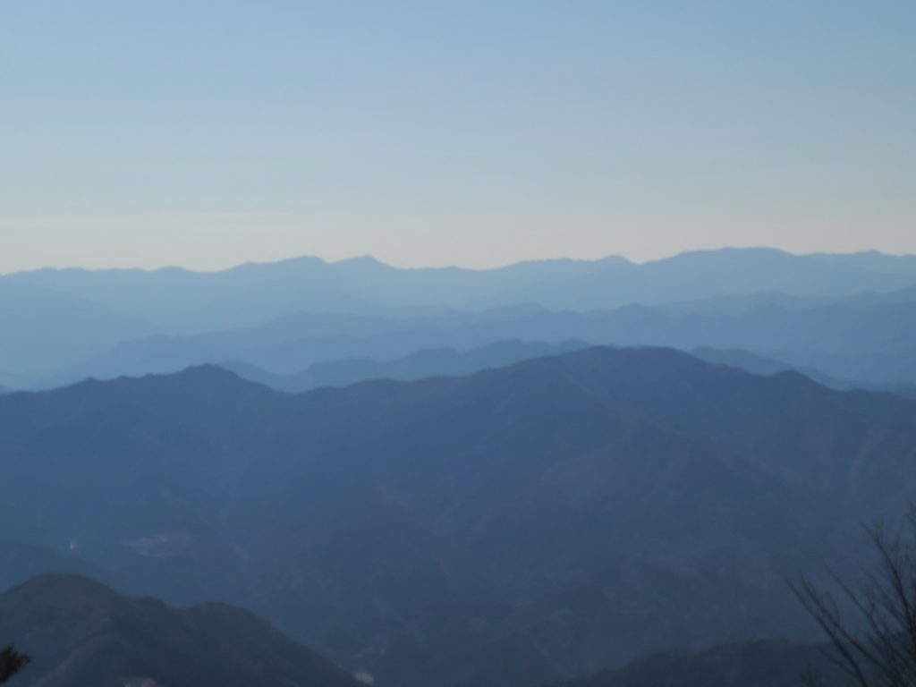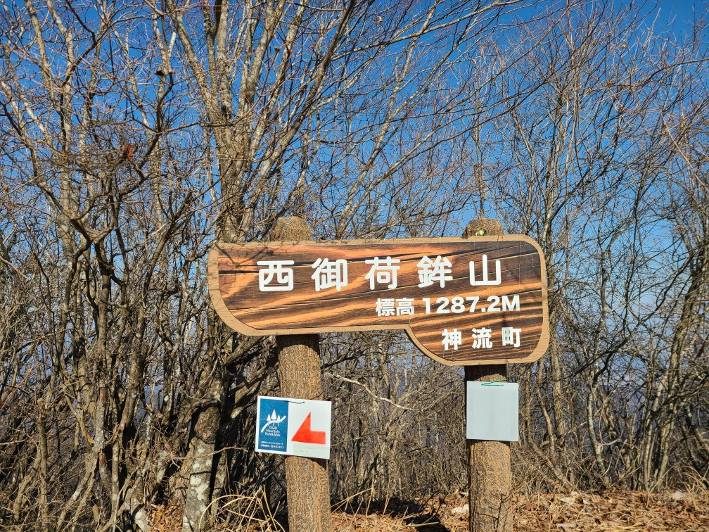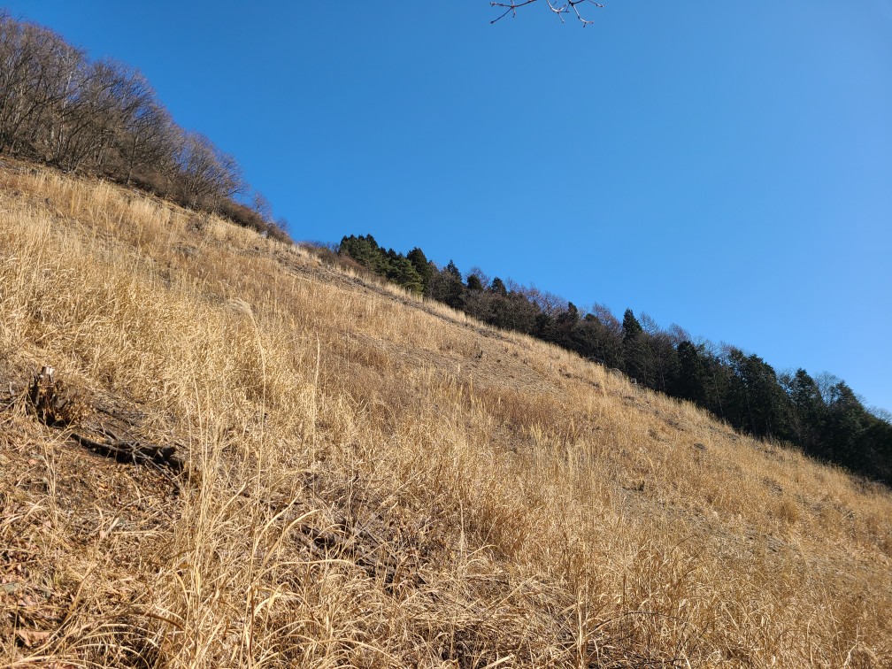 前橋の友人もほとんど毎週山行をしていて、1日どこへ行くか聞いてみると御荷鉾山へ行くというので、機会があったら行きたいと思っていたので便乗させていただきました。藤岡市役所で合流し御荷鉾南駐車場へ向かいました。途中立派なオートキャンプ場があり立ち寄り見学しました。市長さんが力を入れて建設したそうでとても奇麗で土曜の朝だったので静かでしたがこれから賑わうのかなと思いました。キャンプ場からすぐのところに50台駐車できる広い駐車場がありそこに停めました。西御荷鉾へは電球で照らされる大の文字を右手に見ながら1時間ほどで到着しました。山頂で写真だけ撮ってすぐに樹林の急坂を投げ石峠まで下りました。日陰は風が冷たく脱いでいた上着を着ました。東御荷鉾山へは一度林道に出て登り返しです。取り付きがかなり急で足場が悪く難儀しました。尾根に乗りしばらく行ってから道を逸れて釜伏山のピークに向かいました。うっすらと踏み跡がありたどりました。下りの踏み跡はしっかりしていましたが、落ち葉の急坂で何度も転びそうになりました。そこから一登りで東御荷鉾山です。先行者が3人休んでいました。武甲山方面を眺め3人とおしゃべりしながらお昼を食べました。来た道を戻り投げ石峠からは林道を歩きほどなく駐車場に着きました。山頂で会った3人は投げ石峠で追いつかれ再度西御荷鉾山へ行くと登っていきました。広い駐車場に車は3台、出会ったのは4人、静かな山でした。