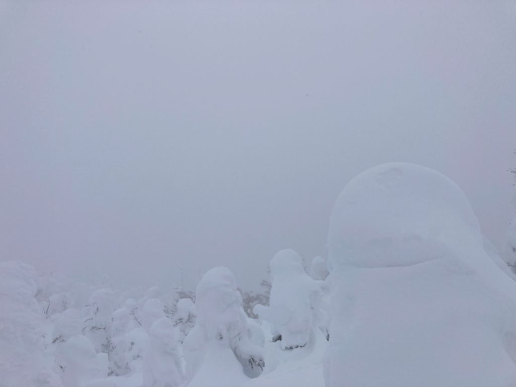 <詳細報告>今年のスノーモンスターは、素晴らしいと聞き行ってみることにした。天気は、午前中は曇り、午後は雪になるようだ。午前中に行けるところまで行って戻ってくる気持ちぐらいで出発する。グランデコスキー場に行く途中で渋滞が発生。なかなか動かないので様子を見に行ってみると数台の車がスタックしている。スタッドレスタイヤを装着しているようだが、FFの車はこのあたりが限界のようだ。道の真ん中で車が止まっていると先にいけないのでみんなで車を脇に動かす。中には、12本爪のアイゼンをつけて押す人もいる。3台車を動かして自分の車に戻ると前の車も動かなくなっていたので数名で車を押し脇に寄せる。グランデコスキー場に着き、それほど待たずになんとかゴンドラに乗ることができた。ゴンドラ終点の着くと先に2人が行っている姿が見える。天気は予報通り曇り、気温はマイナス5℃くらい。トレースはあるが半分隠れている。行けるとこまで行ってみようと歩みを進める。1時間ほど進むと雪が舞ってきた。風がないのが幸いだがガスもでてきている。西大巓まで後少しのところで雪が強くなってきた。これも予報通り、先に行った人が降りてきたので話を聞くと、この先は視界が悪く危険なので降りるとのこと。私たちもそれに従い下山。また、天気が良い時を見計らってきたいと思う。