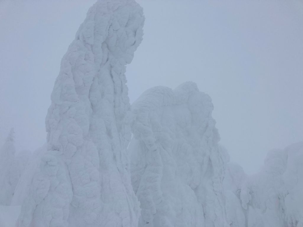 <詳細報告>今年の蔵王のスノーモンスターは、素晴らしいと聞き行ってみることにした。天気は雪、午後も雪。上の方は、少しは晴れ間もあるかと薄い期待を持ってリフトに乗る。気温は、マイナス10℃くらい。裏磐梯よりも蔵王の方が低い。リフトを降りるとそこは、スノーモンスターの世界。ガスっていて視界は5mほどか。トレースをたどり刈田岳方面に行ってみるが自分自身がスノーモンスターになる前に降りることにした。スキー場の脇を通って下山する。ライザワールドは、この悪天候のなか、大盛況でスキーヤーに注意しながら降りる。下山するとタイミングを見計らかったかのように雪と風が強まってきた。蔵王のスノーモンスターは素晴らしいのでまた、天気が良い時をみてきたいと思う。帰りは、天神の湯により帰宅。