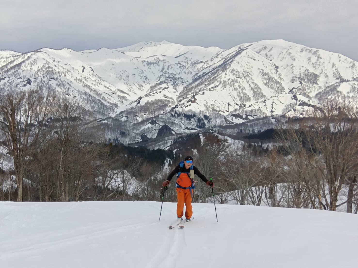 <詳細報告>3月30日 宿の朝食を6時にしていただき雪が降る前に山頂を目指した。除雪は完璧だが雪は4メートルくらい積もっている。とりつきの急斜面を過ぎたら朝日が出てきて熱くなってきたこのままではうまく山頂に行けそうだ。雪庇が発達した稜線を過ぎたあたりからガスが出できて急激に気温が低下してきた。1100mくらいから雪や風も出てきて1200mで視界も悪くなってきたので引き返すことになった。途中標高を下げすぎ登り返すこともあったが無事に登山口に戻った。残念だったがホワイトアウトは危険なので判断は正しかったと思います。下りは新雪でそれなりに面白い下りでした。泊まった大白川の大雲沢ロッジは食事はおいしくお風呂も広く安い(二食付き7300円)で