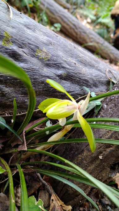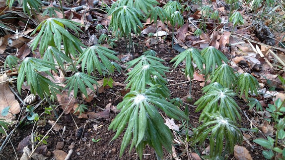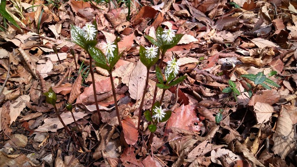 中岳で一休みし、来た道を東屋まで下り、そこから左側の道を登り返すと、道祖神のある縦走路に出る。三毳山山頂に向かう途中、ウグイスカグラが所々に咲いていた。山頂を通過し、カタクリ群生地へ行くと、沢山の人が花を楽しんでいる。カタクリは少し開き出したが、クルリと開くまでは、まだかかりそうだった。春蘭の情報があったので、階段に注目していると見つけられた。階段の端に隠れるようにたった一本だけ。それだけに、特別で豪華に思えた。その後、それぞれ離れた3か所でも見られたが、思いがけず見られたときは、驚き嬉しいものだ。他にも、ヒトリシズカ.ヤブレガサ.ニリンソウなどが咲いていた。キノコのように生えているヤブレガサは美味しい山菜らしい。