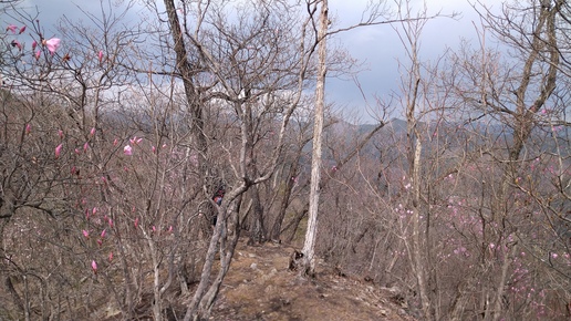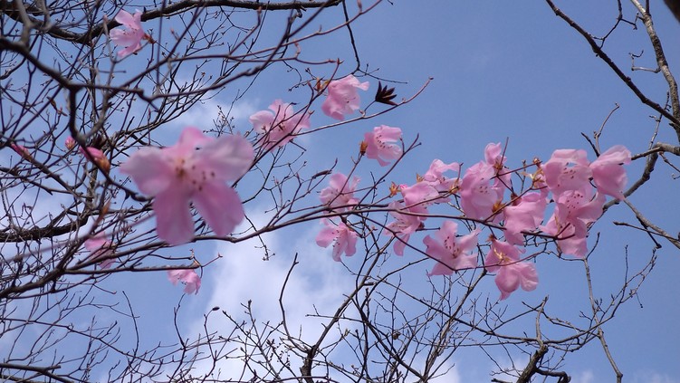 <詳細報告> 金原山登山口駐車場は一杯であり、さすがヤシオの山だ。すっかり天気が回復し、風もなく、枯れ木の間からたっぷりと日差しが降り注ぎワクワクして来る。ヤシオの花がポツポツと見られるようになり、次第に多くなってヤシオ山に着いた。まだ三分から五分咲きなのかな?少し元気がない様に見えたが、ピンク色のその花は可愛く、綺麗だ。三床山方面から来て、また戻ると言う方も数人いました。花探しと花見に気を取られて、全く金原山に気づかず通り過ぎてしまった。帰りに山頂に立ったら、山頂標識が4つもあり、笑ってしまう。楽しいお花見山行でした。