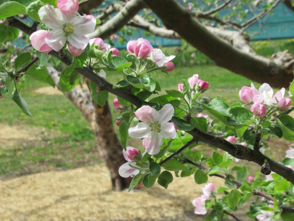<詳細報告> 低山ながら北信五岳を望める長野県小布施市の雁田山(かりたさん)に出掛けました。自宅を出る時は小雨模様でしたが、長野方面は薄っすら雲はあるものの日も差しまずまずの天気、桜は風で花が舞い、林檎と桃の花は紅白で咲いています。