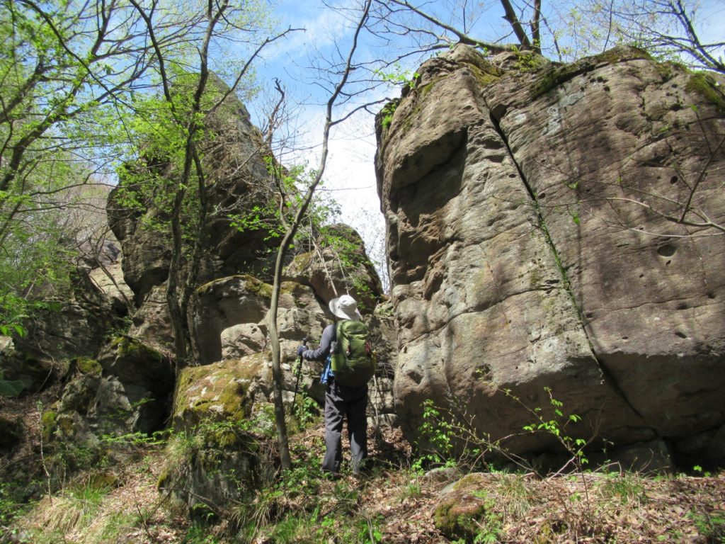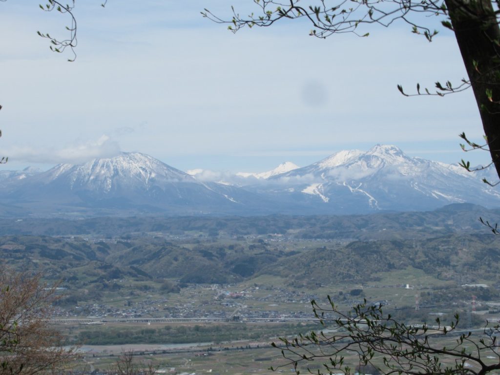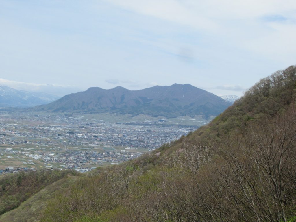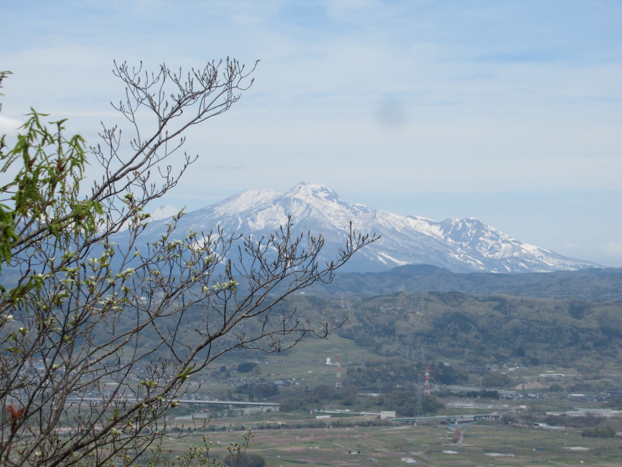 大城から1時間程で千僧坊(せんそうぼう)のピークを越え、小さなアップダウンの稜線歩き、姥岩(うばいわ)を通り一登りで東屋のある展望所で大休止します。西側が開け、”展望園地から見える北信五岳”の案内板が示す山々が見渡せました(動画参照)。眼下に広がる小布施の街には桜と黄色い菜の花も広がり、のんびりと景観を楽しんだ後、雁田山を経由し辷り山(すべりやま:雁田山の別名)登山口に下りました。