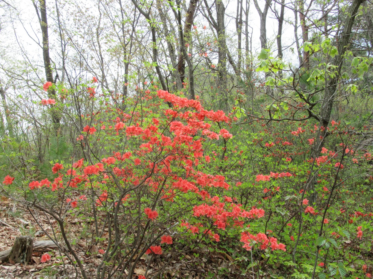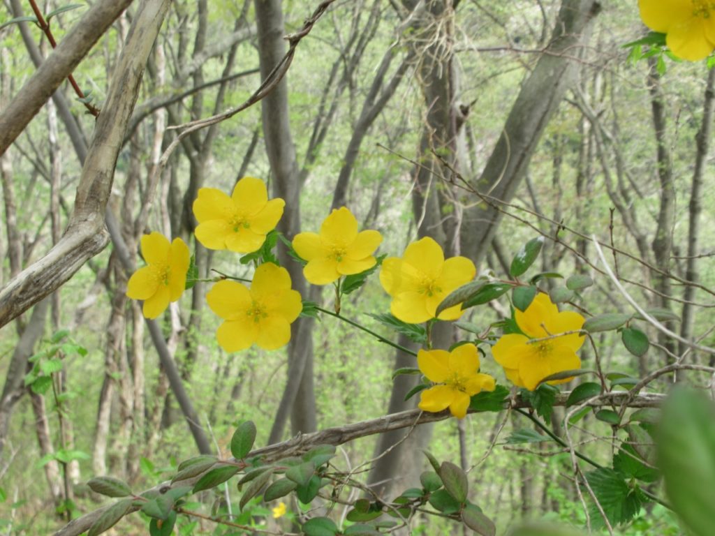 空いている岩松院駐車場に車を停め、仁王門を潜り八重桜の咲く岩松院右奥の登山口へ、木々の間から黒姫、戸隠、妙高山が見え隠れし、残雪の北アルプスも望めます。山城を偲ばせる石垣を登り歩を進めれば、足元にリンドウ、目線にはヤマブキ、ヤマツツジの紅い花、稜線を見上げれば柔らかい新緑の若葉にまだ残る薄いピンクのヤマザクラ、春も進んでいます。